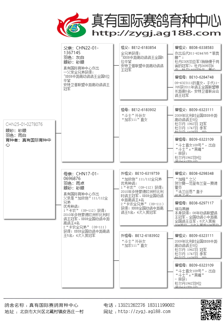【在这三座金矿还未被世人发现之前,真有国际就第一时间把高品质的鸽子带到了国内,取得了空前的发挥。近几年大家才逐渐认识这几位大师鸽子的魅力。请记住!当任何商业鸽舍进入炒作后期的时候,他的鸽子质量与价值都会急剧下降,即便是詹森兄弟也难免于此。所以引进这家鸽舍最巅峰时期的鸽子,得以延续,才是真有国际成功的致胜法宝。】