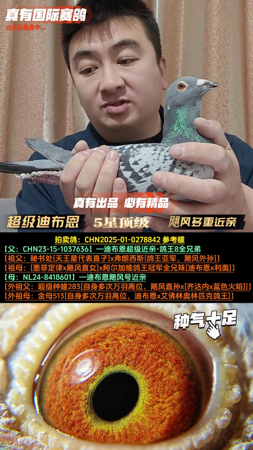 由于所有拍卖鸽均没有作育记录,因此无法100%保证雌雄的正确性,拍卖视频中的雌雄仅供参考,最终以实物为主。如有雌雄特殊要求请及时联系真有国际确认,所有拍卖鸽均享受7天免费换鸽服务(运费自理),由于拍卖形式的鸽子具备商品的唯一性,因此不支持退款服务,感谢大家的理解与支持!谢谢!