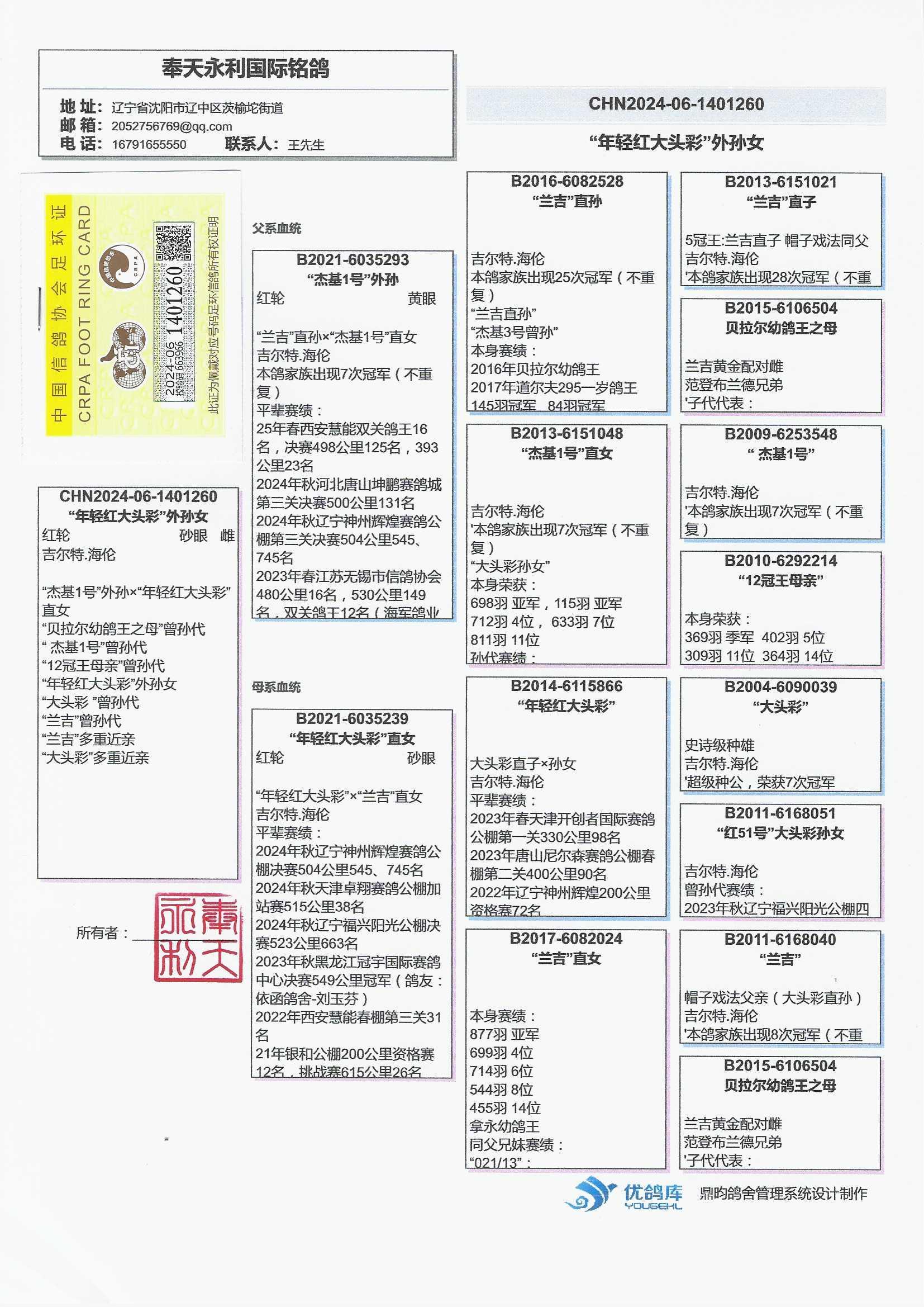 “贝拉尔幼鸽王之母”曾孙代