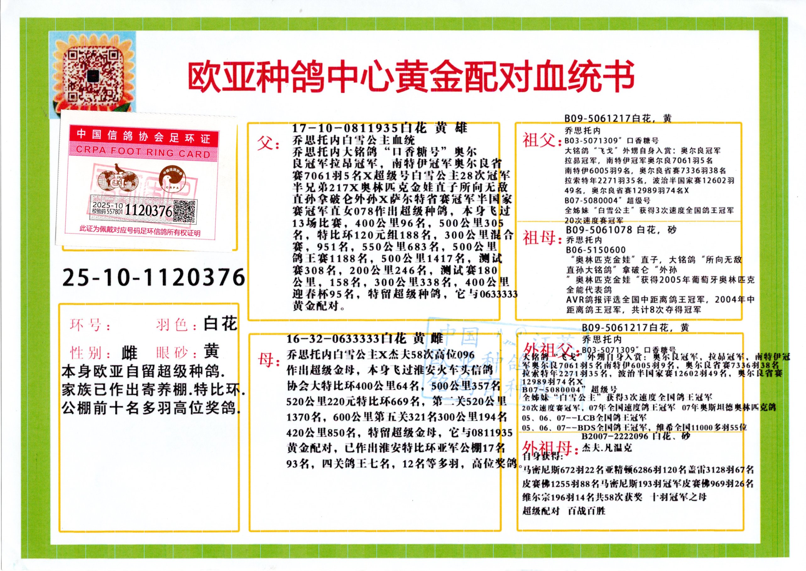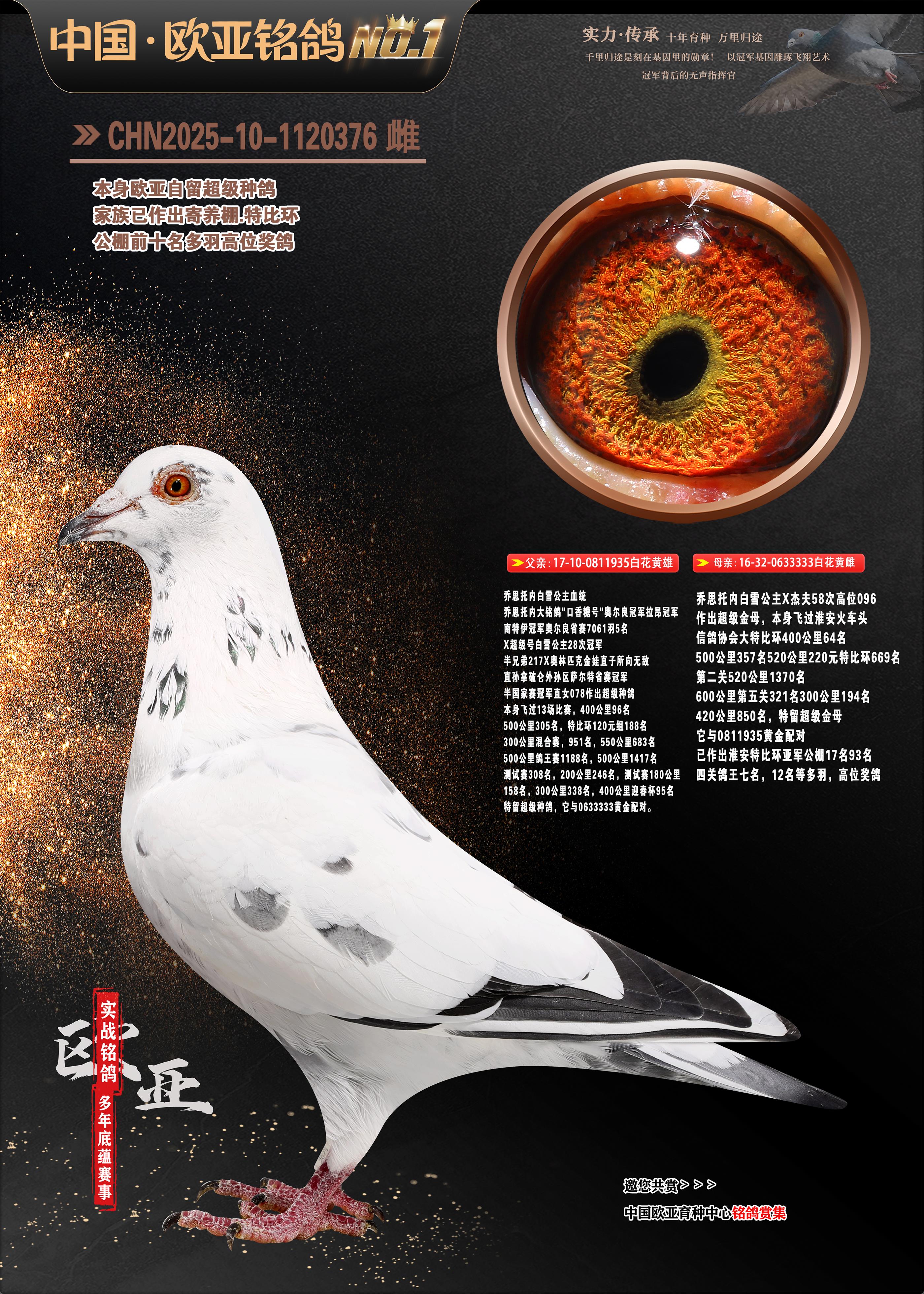 24年秋南京特比环欧亚荣获大团体冠军.小团体冠军551公里大特比13名.14名.16名.19名.20名.21名.24名.26名.27名.28名.42名.52名.54名.57名.65名.66名.68名.70名.71名.72名.74名.76名.80名.82名.83名.84名.85名.86名.90名.92名.110名.116名.121名.122名.128名.131名.158名.161名.164名.165名.166名.172名.174名.177名.182名.195名.196名.201名.205名.208名.210名.216名.253名.269名.275名.276名.294名.296名.299名,,24年秋云南天南铜都公棚决赛415名.天南铜都小棚决赛409名.云南玉活公棚决赛102名.490名.团体32名上笼二羽进二羽,天南铜都大棚506公里决赛445名。热烈祝贺河北省巨鹿县李兰生老师用欧亚泰山号血系连续十一年夺冠军,河北省国家赛冠军.全国季军等多次前十名高位,扬州王军王总用欧亚利奥24年春季获山东翔宇公棚决赛33名盖比53名。南京刘正龙刘总用欧亚盖比获得24年秋山东潍坊国际公棚决赛42名.精英赛30名.三关鸽王71名.决赛86名.加站赛16名.南京市特比环A组鸽王9名.B组鸽王5名.6名.C组鸽王5名.精英赛冠军4名.技能赛A组冠军4名.5名.秦淮区特比环荣获15名.46名.48名.87名。四川西昌徐亮徐总用欧亚利奥获得凉山州聚友决赛177名.第二关亚军双关鸽王19名.三关鸽王105名.云南豪庭公棚决赛603名。热烈祝贺24年四川重庆翔园鸽舍用欧亚泰山号荣获春季400公里冠军.秋季500公里冠军,河北王总用詹森X利奥获得千羽千翔公棚400公里冠军,广东蔡楷焕荣获24年秋爱好者 赛鸽俱乐部三关鸽王季军.一关420公里99名.二关450公里11名.三关520公里32名.单关季军.7名.12名,江西李卫兴荣获贵州红枫公棚8名.共翔俱乐部寄养棚四关综合鸽王30名.一关400公里78名.二关500公里55名.三关520公里37名.四关500公里57名.同父母获公棚18名.雷鸣获得武汉黄浦育翔中心冠军,四川陈文获得四川明鸿俱乐部300公里梦幻2名.3名.4名.9名.10名.13名.14名.15名.31名.34名.40名.41名.42名.43名.69名.71名.72名.73名.74名.94名.95名.97名.98名.99名.419公里决赛荣获总冠军7名.总共归巢9羽,四川徐亮获豪庭决赛603名,山西郑勇获得山西泰鑫公棚决赛255名詹森红狐,热烈祝贺马总获得开尔(飞跃队)决赛9名获奖金1310000万元.第一关52名,天津津福资赛180公里96名.获奖金429543万元,欧亚支持全国鸽友24年秋多人报喜 祝大家取得更好成绩,给欧亚报喜鸽友欧亚决定给每人赠送一羽超级种鸽。欧亚俱乐部特比环多关鸽王成绩:15年秋淮安特比环黑色星期一全会上笼9700多羽,当天无鸽归巢,第二天全会归巢357羽,本舍归巢158羽.前十名八羽.前一百名归巢57羽,16年春季获五关鸽王总冠军,总亚军四名.六名.七名.九名.十名.晶艺俱乐部520公里冠亚季军5名.6名.7名.9名.11名等,火车头冠军.季军6名.8名.9名.10名,16年秋晶艺俱乐部特比环520公里亚军.季军4名.6名.7名.9名,15年春南京白下特比环冠军.亚军.季军6名.7名.8名.9名.10名.指定鸽A B组获得冠军.亚军.季军4名.5名.,17年淮安特比环亚军.4名.5名.7名.8名.10名.六关鸽王总冠军.4名.6名.9名.10名,寄养棚宿迁刘总20羽特比环获冠军.季军.4名.7名.8名.9名等。18年荣获万羽特比环六关鸽王总冠军.总亚军.总季军.6名.8名.十名.单关四羽冠军.二羽亚军.四羽季军.前十名27羽。19年秋万羽特比环六关鸽王总亚军.总季军.5名.8名等,单关二羽冠军.三羽亚军.一羽季军前十名31羽。20年秋淮安市鸽会四关特比环大赛风雨无阻鸽王亚军.鸽王六名,金品俱乐部万羽特比环六关鸽王总冠军,总亚军.四名.五名.六名.七名.八名.十名.前二百名鸽王35羽,单关冠亚季军前十名四十多羽,火车头五关鸽王季军.六名.八名.前二百名鸽王十七羽。20年春荣获淮安五区一市四关鸽王总冠军.亚军.四名.八名.九名。21年秋荣获金品万羽特比环大赛六关鸽王总亚军.总季军.四名.七名.九名.十名.单关冠亚军季军前十名三十多羽。火车头协会鸽王六名.七名.十名.单关前十名十七羽。22年秋荣获鸽王总冠军.总亚军.5名.7名.8名.9名.11名.单关冠亚季军前十名三十多羽,第一关单关前二百名四十多羽,第二关前二百名三十多羽,第三关前二百名四十多羽,第四关前二百名四十多羽,第五关前一百名53羽。23年秋荣获鸽王季军.五名.八名.十名.13名.17名.20名.27名等多羽鸽王.单关前十名二十多羽。公棚.寄养棚部分成绩:16年秋宁夏黄河公棚总冠军电脑戈马力指定通炮冠军,17年送八羽参赛获得鸽王八名进奖四名,支持韩总荣获八名。支持鸽友荣获宁夏中卫公棚决赛总冠军.精英赛冠军,支持18年宁夏黄河公棚决赛冠军詹森X泰山。安徽鼎博寄养棚院内外四关鸽王总冠军.鸽王十七名.三十七名同窝,鸽王39名.42名.58名.67名。18年山东公棚预赛冠军.决赛65名.送八羽进奖五羽.指定获奔驰汽车一辆。支持鸽友获得云南蓝云公棚冠军.盖比X佛卡门。支持鸽友荣获云南银集公棚决赛冠军 詹森427X520血系 速度赛6700羽冠军。17年荣获金马俱乐部寄养棚四关鸽王总冠军.季军.六名.八名.第一关冠军.亚军.季军四名.七名.十一名.金牌教练奖。支持鸽友18年北京费翔公棚预赛九名电脑X桑杰士,支持鸽友荣获陕西威力公棚决赛11名.内蒙古临河寄养棚四关鸽王六名.詹森配泰山,支持河北王总用欧亚詹森427配胡本喜获20年秋开尔青年棚季军。云南东荣公棚16年预赛冠军.决赛77名.17年决赛12名.詹森红狐X泰山,17年平安公棚决赛4名 詹森427。欧亚获得21年金母寄养棚第一关四名.第二关5名.第三关5名.6名.7名.10名.三关鸽王总冠军,四关鸽王14名.十羽鸽王。支持河