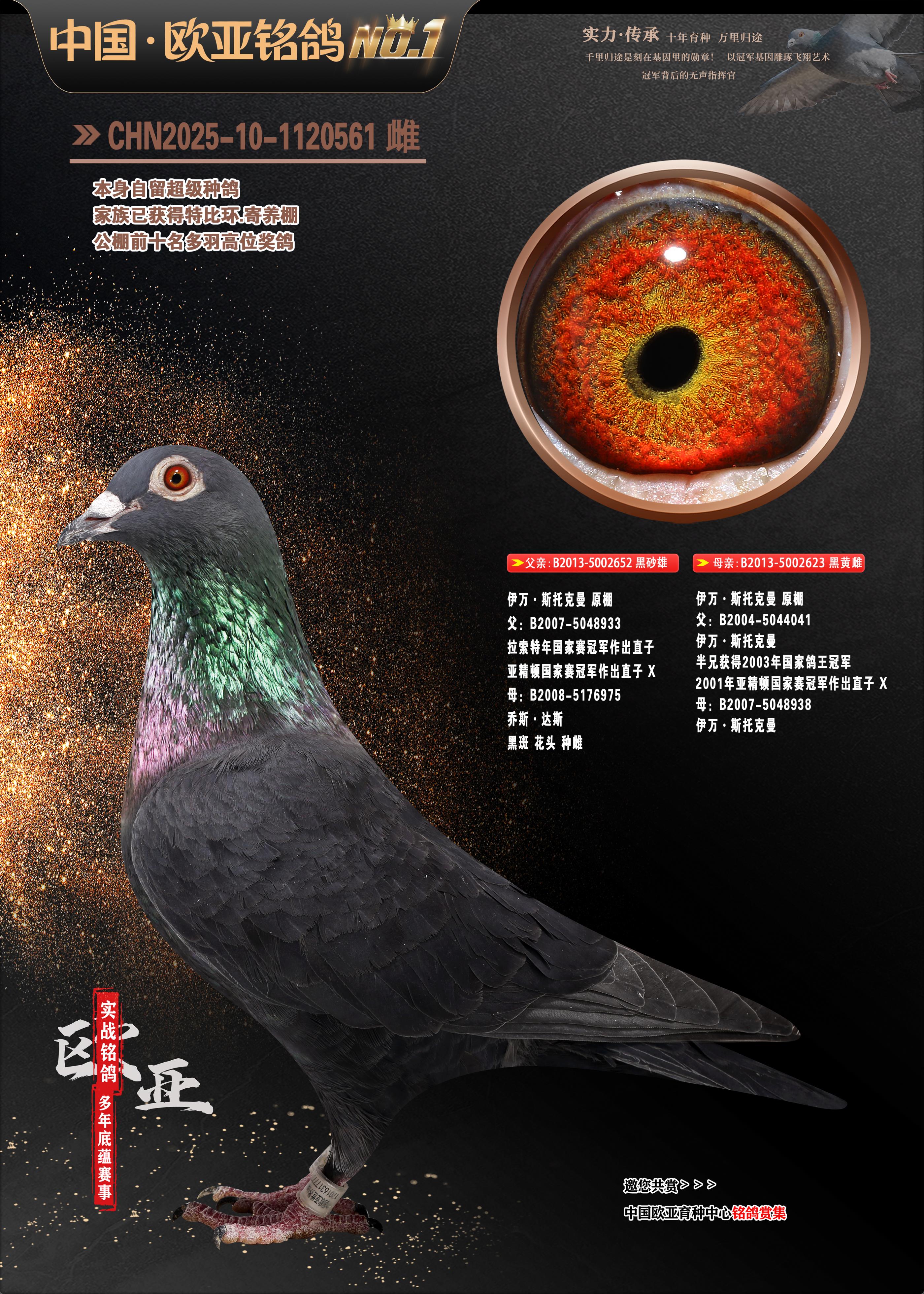 24年秋南京特比环欧亚荣获大团体冠军.小团体冠军551公里大特比13名.14名.16名.19名.20名.21名.24名.26名.27名.28名.42名.52名.54名.57名.65名.66名.68名.70名.71名.72名.74名.76名.80名.82名.83名.84名.85名.86名.90名.92名.110名.116名.121名.122名.128名.131名.158名.161名.164名.165名.166名.172名.174名.177名.182名.195名.196名.201名.205名.208名.210名.216名.253名.269名.275名.276名.294名.296名.299名,,24年秋云南天南铜都公棚决赛415名.天南铜都小棚决赛409名.云南玉活公棚决赛102名.490名.团体32名上笼二羽进二羽,天南铜都大棚506公里决赛445名。热烈祝贺河北省巨鹿县李兰生老师用欧亚泰山号血系连续十一年夺冠军,河北省国家赛冠军.全国季军等多次前十名高位,扬州王军王总用欧亚利奥24年春季获山东翔宇公棚决赛33名盖比53名。南京刘正龙刘总用欧亚盖比获得24年秋山东潍坊国际公棚决赛42名.精英赛30名.三关鸽王71名.决赛86名.加站赛16名.南京市特比环A组鸽王9名.B组鸽王5名.6名.C组鸽王5名.精英赛冠军4名.技能赛A组冠军4名.5名.秦淮区特比环荣获15名.46名.48名.87名。四川西昌徐亮徐总用欧亚利奥获得凉山州聚友决赛177名.第二关亚军双关鸽王19名.三关鸽王105名.云南豪庭公棚决赛603名。热烈祝贺24年四川重庆翔园鸽舍用欧亚泰山号荣获春季400公里冠军.秋季500公里冠军,河北王总用詹森X利奥获得千羽千翔公棚400公里冠军,广东蔡楷焕荣获24年秋爱好者 赛鸽俱乐部三关鸽王季军.一关420公里99名.二关450公里11名.三关520公里32名.单关季军.7名.12名,江西李卫兴荣获贵州红枫公棚8名.共翔俱乐部寄养棚四关综合鸽王30名.一关400公里78名.二关500公里55名.三关520公里37名.四关500公里57名.同父母获公棚18名.雷鸣获得武汉黄浦育翔中心冠军,四川陈文获得四川明鸿俱乐部300公里梦幻2名.3名.4名.9名.10名.13名.14名.15名.31名.34名.40名.41名.42名.43名.69名.71名.72名.73名.74名.94名.95名.97名.98名.99名.419公里决赛荣获总冠军7名.总共归巢9羽,四川徐亮获豪庭决赛603名,山西郑勇获得山西泰鑫公棚决赛255名詹森红狐,热烈祝贺马总获得开尔(飞跃队)决赛9名获奖金1310000万元.第一关52名,天津津福资赛180公里96名.获奖金429543万元,欧亚支持全国鸽友24年秋多人报喜 祝大家取得更好成绩,给欧亚报喜鸽友欧亚决定给每人赠送一羽超级种鸽。欧亚俱乐部特比环多关鸽王成绩:15年秋淮安特比环黑色星期一全会上笼9700多羽,当天无鸽归巢,第二天全会归巢357羽,本舍归巢158羽.前十名八羽.前一百名归巢57羽,16年春季获五关鸽王总冠军,总亚军四名.六名.七名.九名.十名.晶艺俱乐部520公里冠亚季军5名.6名.7名.9名.11名等,火车头冠军.季军6名.8名.9名.10名,16年秋晶艺俱乐部特比环520公里亚军.季军4名.6名.7名.9名,15年春南京白下特比环冠军.亚军.季军6名.7名.8名.9名.10名.指定鸽A B组获得冠军.亚军.季军4名.5名.,17年淮安特比环亚军.4名.5名.7名.8名.10名.六关鸽王总冠军.4名.6名.9名.10名,寄养棚宿迁刘总20羽特比环获冠军.季军.4名.7名.8名.9名等。18年荣获万羽特比环六关鸽王总冠军.总亚军.总季军.6名.8名.十名.单关四羽冠军.二羽亚军.四羽季军.前十名27羽。19年秋万羽特比环六关鸽王总亚军.总季军.5名.8名等,单关二羽冠军.三羽亚军.一羽季军前十名31羽。20年秋淮安市鸽会四关特比环大赛风雨无阻鸽王亚军.鸽王六名,金品俱乐部万羽特比环六关鸽王总冠军,总亚军.四名.五名.六名.七名.八名.十名.前二百名鸽王35羽,单关冠亚季军前十名四十多羽,火车头五关鸽王季军.六名.八名.前二百名鸽王十七羽。20年春荣获淮安五区一市四关鸽王总冠军.亚军.四名.八名.九名。21年秋荣获金品万羽特比环大赛六关鸽王总亚军.总季军.四名.七名.九名.十名.单关冠亚军季军前十名三十多羽。火车头协会鸽王六名.七名.十名.单关前十名十七羽。22年秋荣获鸽王总冠军.总亚军.5名.7名.8名.9名.11名.单关冠亚季军前十名三十多羽,第一关单关前二百名四十多羽,第二关前二百名三十多羽,第三关前二百名四十多羽,第四关前二百名四十多羽,第五关前一百名53羽。23年秋荣获鸽王季军.五名.八名.十名.13名.17名.20名.27名等多羽鸽王.单关前十名二十多羽。公棚.寄养棚部分成绩:16年秋宁夏黄河公棚总冠军电脑戈马力指定通炮冠军,17年送八羽参赛获得鸽王八名进奖四名,支持韩总荣获八名。支持鸽友荣获宁夏中卫公棚决赛总冠军.精英赛冠军,支持18年宁夏黄河公棚决赛冠军詹森X泰山。安徽鼎博寄养棚院内外四关鸽王总冠军.鸽王十七名.三十七名同窝,鸽王39名.42名.58名.67名。18年山东公棚预赛冠军.决赛65名.送八羽进奖五羽.指定获奔驰汽车一辆。支持鸽友获得云南蓝云公棚冠军.盖比X佛卡门。支持鸽友荣获云南银集公棚决赛冠军 詹森427X520血系 速度赛6700羽冠军。17年荣获金马俱乐部寄养棚四关鸽王总冠军.季军.六名.八名.第一关冠军.亚军.季军四名.七名.十一名.金牌教练奖。支持鸽友18年北京费翔公棚预赛九名电脑X桑杰士,支持鸽友荣获陕西威力公棚决赛11名.内蒙古临河寄养棚四关鸽王六名.詹森配泰山,支持河北王总用欧亚詹森427配胡本喜获20年秋开尔青年棚季军。云南东荣公棚16年预赛冠军.决赛77名.17年决赛12名.詹森红狐X泰山,17年平安公棚决赛4名 詹森427。欧亚获得21年金母寄养棚第一关四名.第二关5名.第三关5名.6名.7名.10名.三关鸽王总冠军,四关鸽王14名.十羽鸽王。支持河