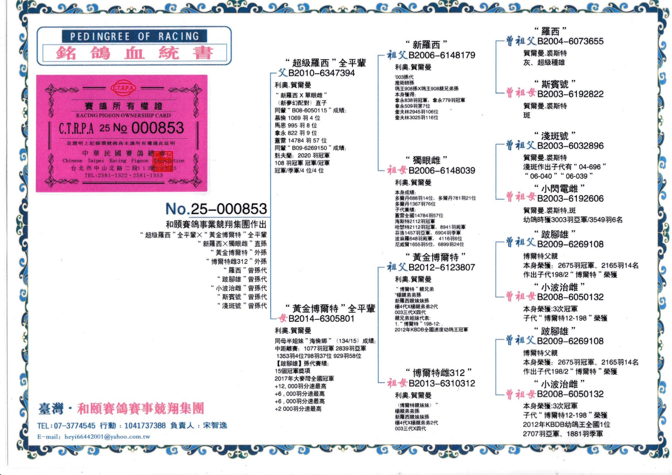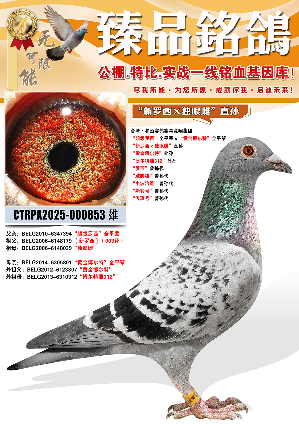 所有拍卖鸽全部血统真实!!个人鉴鸽观点不一,飞不飞天上见.血统成绩第一