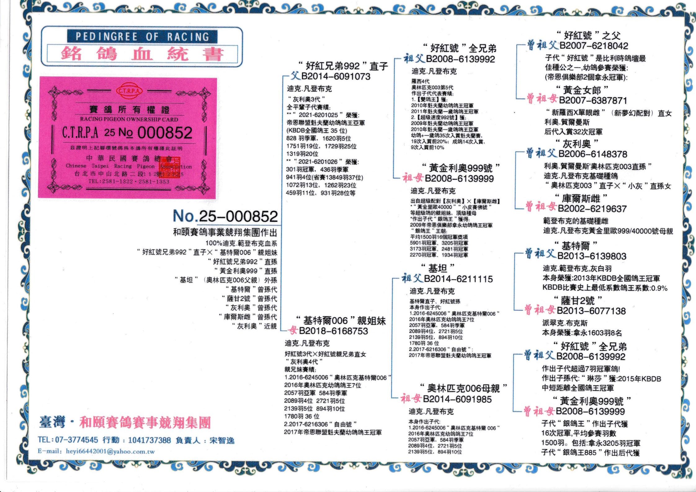 所有拍卖鸽全部血统真实!!个人鉴鸽观点不一,飞不飞天上见.血统成绩第一