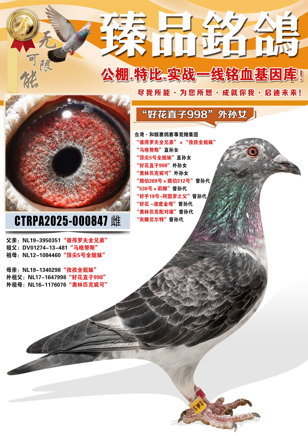 所有拍卖鸽全部血统真实!!个人鉴鸽观点不一,飞不飞天上见.血统成绩第一