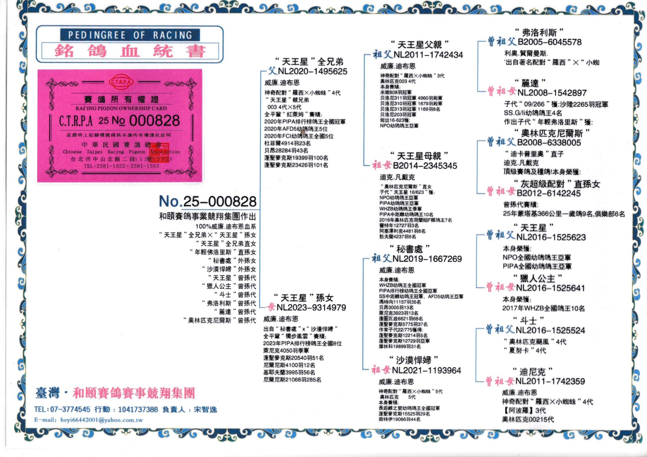 所有拍卖鸽全部血统真实!!个人鉴鸽观点不一,飞不飞天上见.血统成绩第一