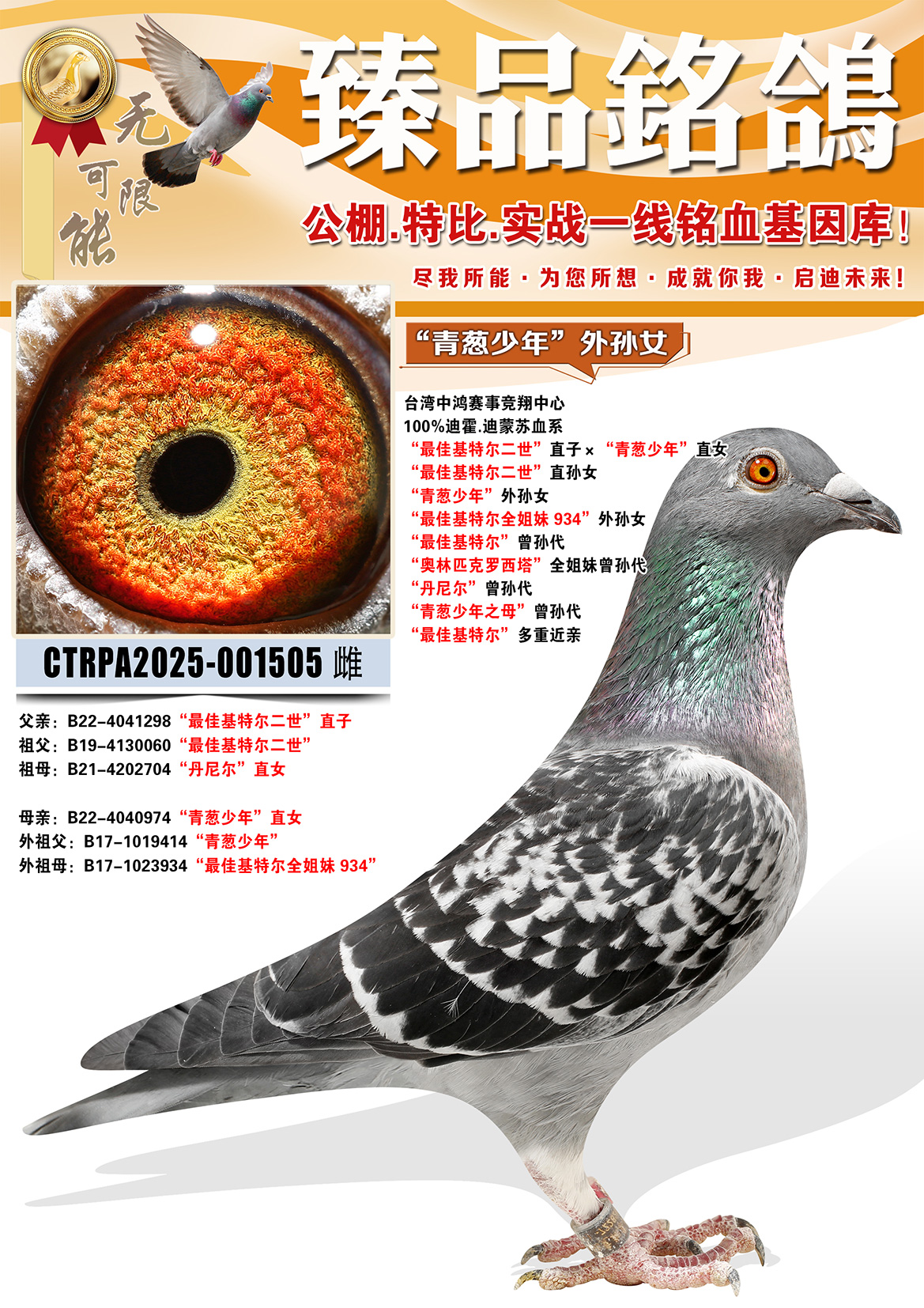 所有拍卖鸽全部血统真实!!个人鉴鸽观点不一,飞不飞天上见.血统成绩第一