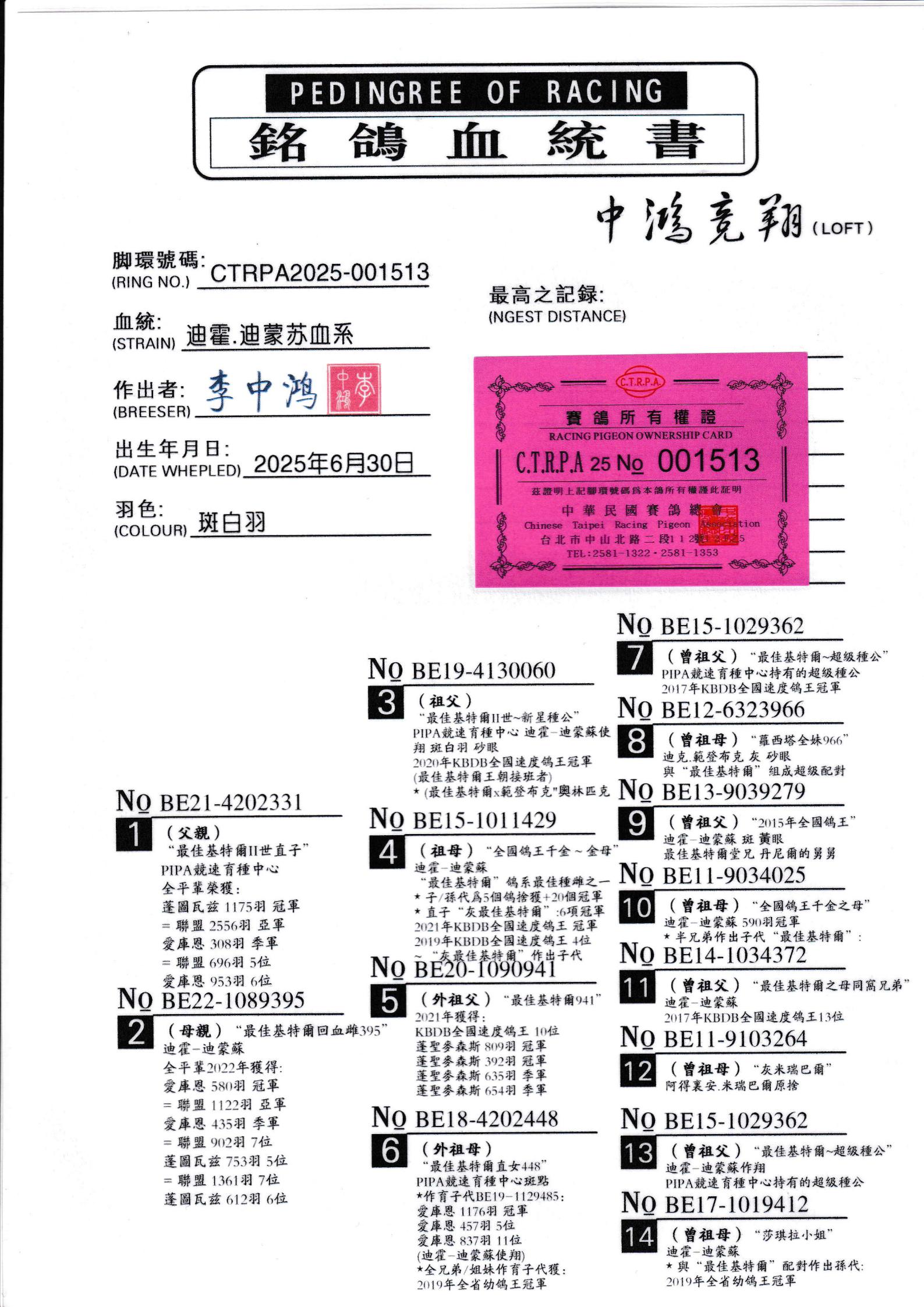 所有拍卖鸽全部血统真实!!个人鉴鸽观点不一,飞不飞天上见.血统成绩第一