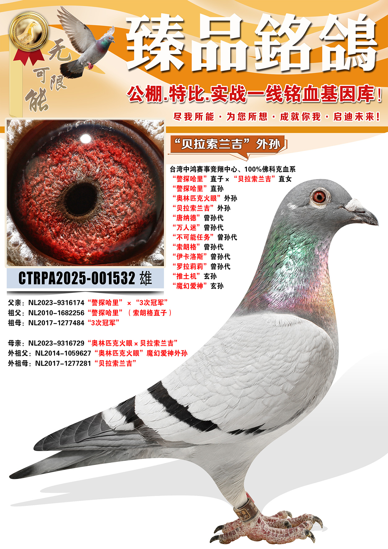 曾外祖母:NL2015-1706463 鸽王伊莎贝尔(长距离鸽王冠军)