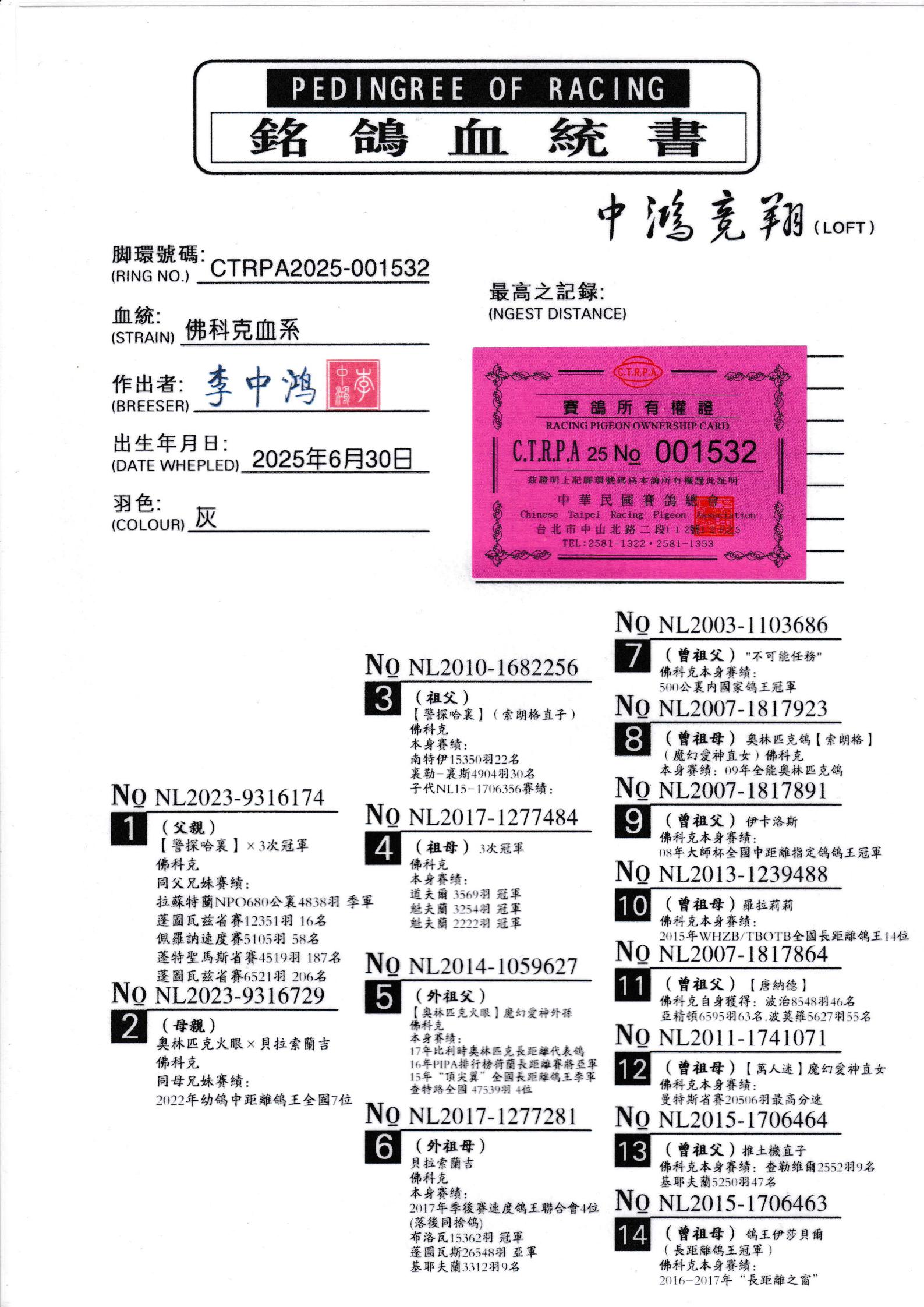 所有拍卖鸽全部血统真实!!个人鉴鸽观点不一,飞不飞天上见.血统成绩第一