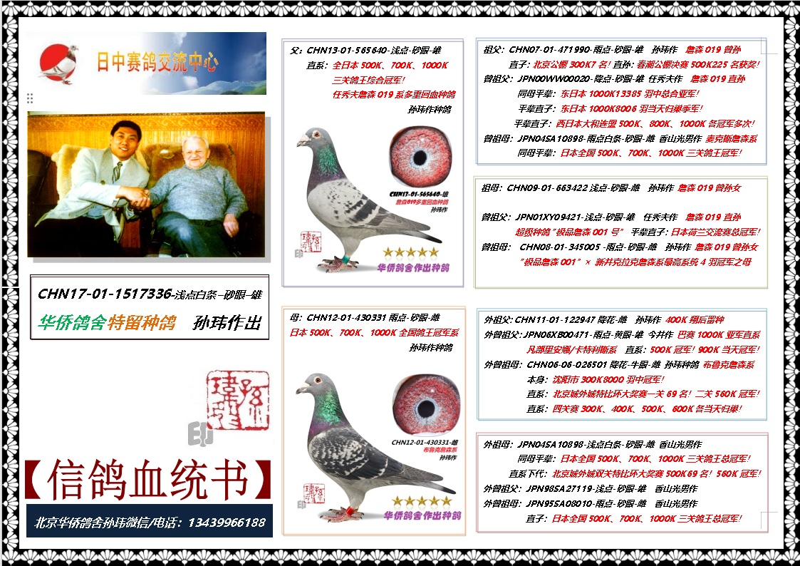 北京《华侨鸽舍》自1993年成立至今已经33年,其主血来自日本华侨名鸽收藏家任秀夫、胡英辉(已故)及日本鸽界的名人、名血、名系!