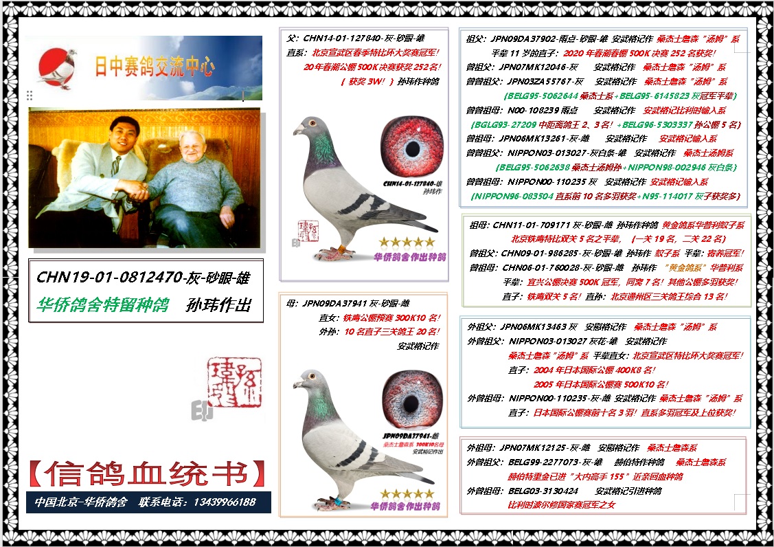 北京《华侨鸽舍》自1993年成立至今已经33年,其主血来自日本华侨名鸽收藏家任秀夫、胡英辉(已故)及日本鸽界的名人、名血、名系!