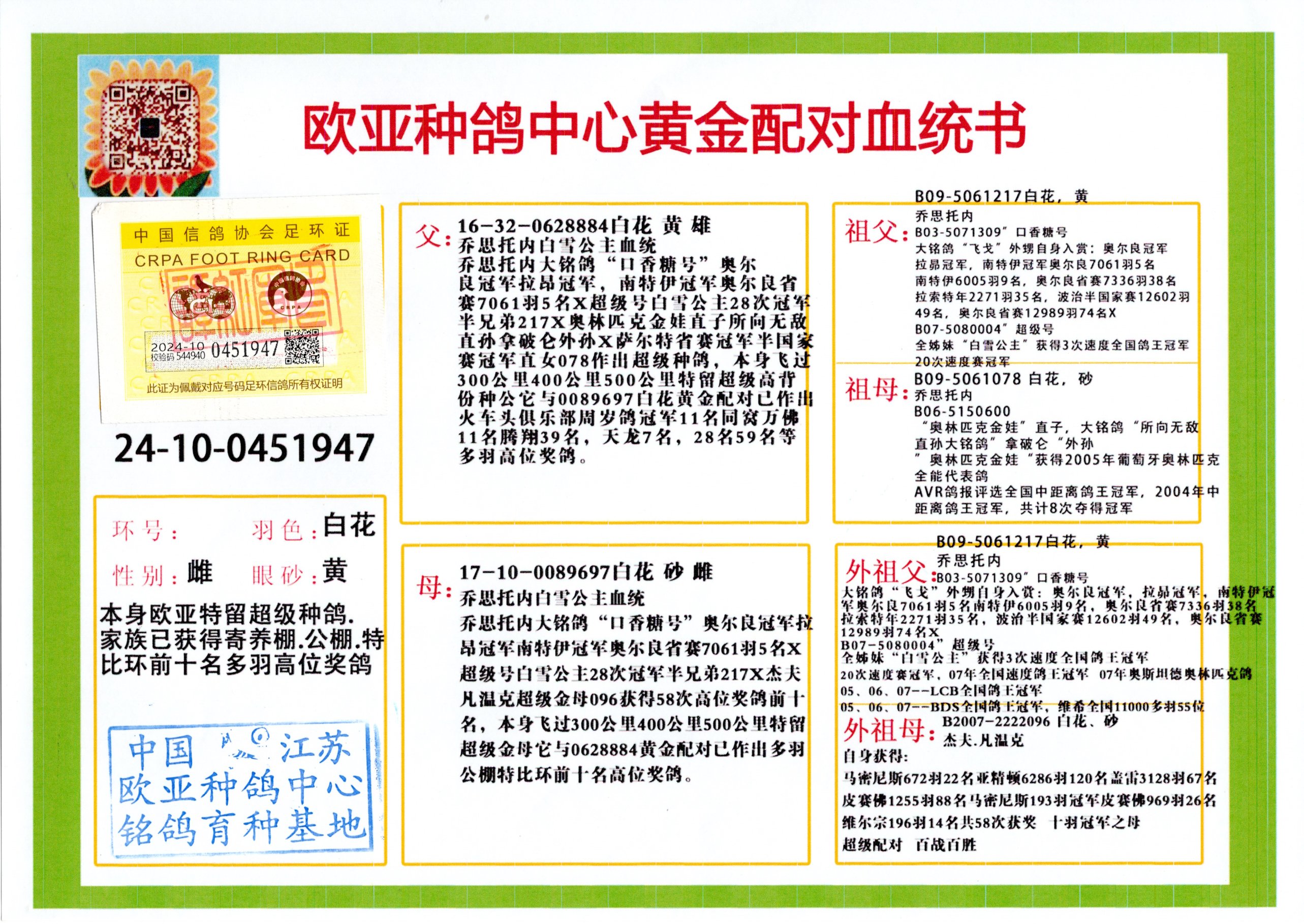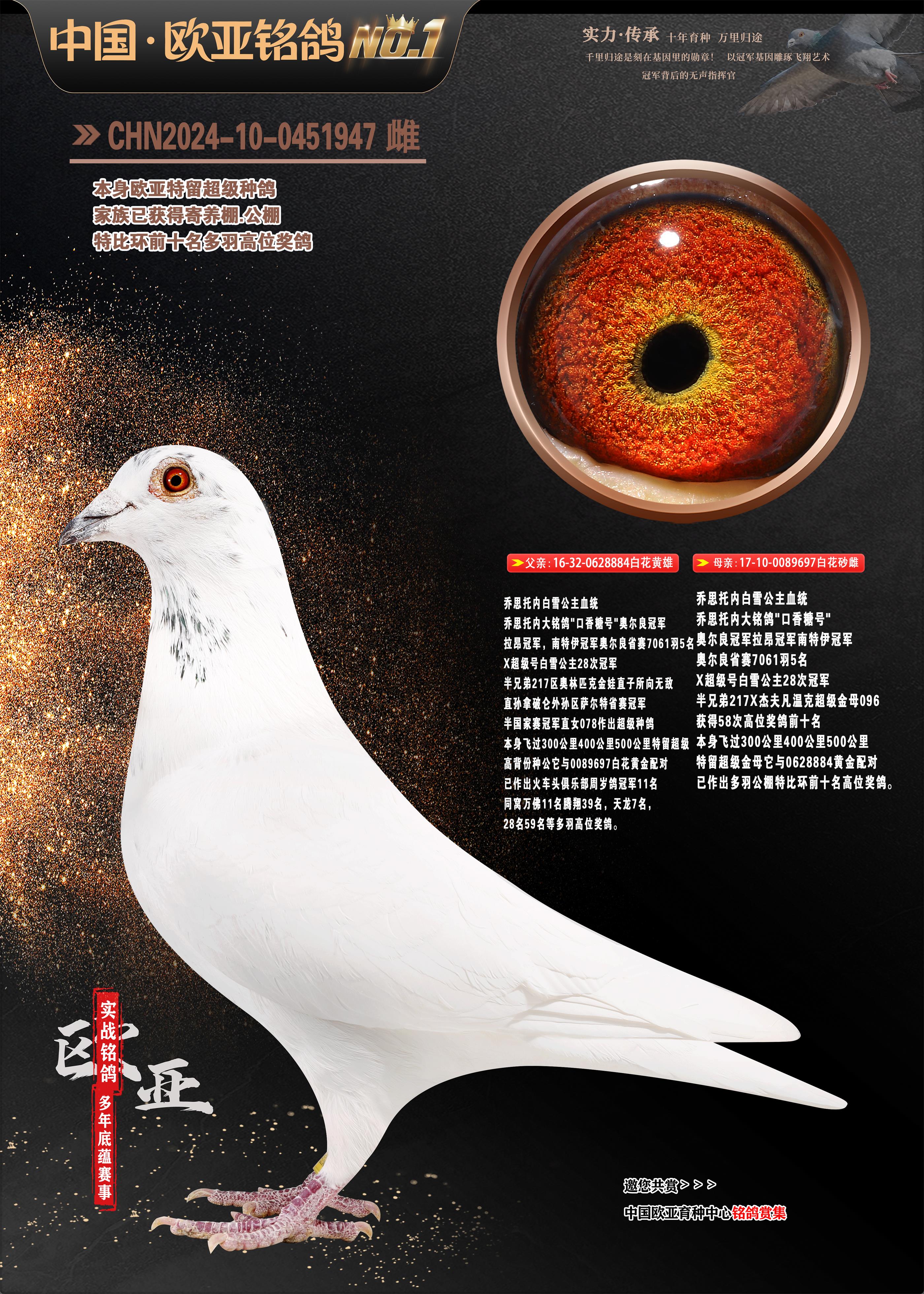 24年秋南京特比环欧亚荣获大团体冠军.小团体冠军551公里大特比13名.14名.16名.19名.20名.21名.24名.26名.27名.28名.42名.52名.54名.57名.65名.66名.68名.70名.71名.72名.74名.76名.80名.82名.83名.84名.85名.86名.90名.92名.110名.116名.121名.122名.128名.131名.158名.161名.164名.165名.166名.172名.174名.177名.182名.195名.196名.201名.205名.208名.210名.216名.253名.269名.275名.276名.294名.296名.299名,,24年秋云南天南铜都公棚决赛415名.天南铜都小棚决赛409名.云南玉活公棚决赛102名.490名.团体32名上笼二羽进二羽,天南铜都大棚506公里决赛445名。热烈祝贺河北省巨鹿县李兰生老师用欧亚泰山号血系连续十一年夺冠军,河北省国家赛冠军.全国季军等多次前十名高位,扬州王军王总用欧亚利奥24年春季获山东翔宇公棚决赛33名盖比53名。南京刘正龙刘总用欧亚盖比获得24年秋山东潍坊国际公棚决赛42名.精英赛30名.三关鸽王71名.决赛86名.加站赛16名.南京市特比环A组鸽王9名.B组鸽王5名.6名.C组鸽王5名.精英赛冠军4名.技能赛A组冠军4名.5名.秦淮区特比环荣获15名.46名.48名.87名。四川西昌徐亮徐总用欧亚利奥获得凉山州聚友决赛177名.第二关亚军双关鸽王19名.三关鸽王105名.云南豪庭公棚决赛603名。热烈祝贺24年四川重庆翔园鸽舍用欧亚泰山号荣获春季400公里冠军.秋季500公里冠军,河北王总用詹森X利奥获得千羽千翔公棚400公里冠军,广东蔡楷焕荣获24年秋爱好者 赛鸽俱乐部三关鸽王季军.一关420公里99名.二关450公里11名.三关520公里32名.单关季军.7名.12名,江西李卫兴荣获贵州红枫公棚8名.共翔俱乐部寄养棚四关综合鸽王30名.一关400公里78名.二关500公里55名.三关520公里37名.四关500公里57名.同父母获公棚18名.雷鸣获得武汉黄浦育翔中心冠军,四川陈文获得四川明鸿俱乐部300公里梦幻2名.3名.4名.9名.10名.13名.14名.15名.31名.34名.40名.41名.42名.43名.69名.71名.72名.73名.74名.94名.95名.97名.98名.99名.419公里决赛荣获总冠军7名.总共归巢9羽,四川徐亮获豪庭决赛603名,山西郑勇获得山西泰鑫公棚决赛255名詹森红狐,热烈祝贺马总获得开尔(飞跃队)决赛9名获奖金1310000万元.第一关52名,天津津福资赛180公里96名.获奖金429543万元,欧亚支持全国鸽友24年秋多人报喜 祝大家取得更好成绩,给欧亚报喜鸽友欧亚决定给每人赠送一羽超级种鸽。欧亚俱乐部特比环多关鸽王成绩:15年秋淮安特比环黑色星期一全会上笼9700多羽,当天无鸽归巢,第二天全会归巢357羽,本舍归巢158羽.前十名八羽.前一百名归巢57羽,16年春季获五关鸽王总冠军,总亚军四名.六名.七名.九名.十名.晶艺俱乐部520公里冠亚季军5名.6名.7名.9名.11名等,火车头冠军.季军6名.8名.9名.10名,16年秋晶艺俱乐部特比环520公里亚军.季军4名.6名.7名.9名,15年春南京白下特比环冠军.亚军.季军6名.7名.8名.9名.10名.指定鸽A B组获得冠军.亚军.季军4名.5名.,17年淮安特比环亚军.4名.5名.7名.8名.10名.六关鸽王总冠军.4名.6名.9名.10名,寄养棚宿迁刘总20羽特比环获冠军.季军.4名.7名.8名.9名等。18年荣获万羽特比环六关鸽王总冠军.总亚军.总季军.6名.8名.十名.单关四羽冠军.二羽亚军.四羽季军.前十名27羽。19年秋万羽特比环六关鸽王总亚军.总季军.5名.8名等,单关二羽冠军.三羽亚军.一羽季军前十名31羽。20年秋淮安市鸽会四关特比环大赛风雨无阻鸽王亚军.鸽王六名,金品俱乐部万羽特比环六关鸽王总冠军,总亚军.四名.五名.六名.七名.八名.十名.前二百名鸽王35羽,单关冠亚季军前十名四十多羽,火车头五关鸽王季军.六名.八名.前二百名鸽王十七羽。20年春荣获淮安五区一市四关鸽王总冠军.亚军.四名.八名.九名。21年秋荣获金品万羽特比环大赛六关鸽王总亚军.总季军.四名.七名.九名.十名.单关冠亚军季军前十名三十多羽。火车头协会鸽王六名.七名.十名.单关前十名十七羽。22年秋荣获鸽王总冠军.总亚军.5名.7名.8名.9名.11名.单关冠亚季军前十名三十多羽,第一关单关前二百名四十多羽,第二关前二百名三十多羽,第三关前二百名四十多羽,第四关前二百名四十多羽,第五关前一百名53羽。23年秋荣获鸽王季军.五名.八名.十名.13名.17名.20名.27名等多羽鸽王.单关前十名二十多羽。公棚.寄养棚部分成绩:16年秋宁夏黄河公棚总冠军电脑戈马力指定通炮冠军,17年送八羽参赛获得鸽王八名进奖四名,支持韩总荣获八名。支持鸽友荣获宁夏中卫公棚决赛总冠军.精英赛冠军,支持18年宁夏黄河公棚决赛冠军詹森X泰山。安徽鼎博寄养棚院内外四关鸽王总冠军.鸽王十七名.三十七名同窝,鸽王39名.42名.58名.67名。18年山东公棚预赛冠军.决赛65名.送八羽进奖五羽.指定获奔驰汽车一辆。支持鸽友获得云南蓝云公棚冠军.盖比X佛卡门。支持鸽友荣获云南银集公棚决赛冠军 詹森427X520血系 速度赛6700羽冠军。17年荣获金马俱乐部寄养棚四关鸽王总冠军.季军.六名.八名.第一关冠军.亚军.季军四名.七名.十一名.金牌教练奖。支持鸽友18年北京费翔公棚预赛九名电脑X桑杰士,支持鸽友荣获陕西威力公棚决赛11名.内蒙古临河寄养棚四关鸽王六名.詹森配泰山,支持河北王总用欧亚詹森427配胡本喜获20年秋开尔青年棚季军。云南东荣公棚16年预赛冠军.决赛77名.17年决赛12名.詹森红狐X泰山,17年平安公棚决赛4名 詹森427。欧亚获得21年金母寄养棚第一关四名.第二关5名.第三关5名.6名.7名.10名.三关鸽王总冠军,四关鸽王14名.十羽鸽王。支持河