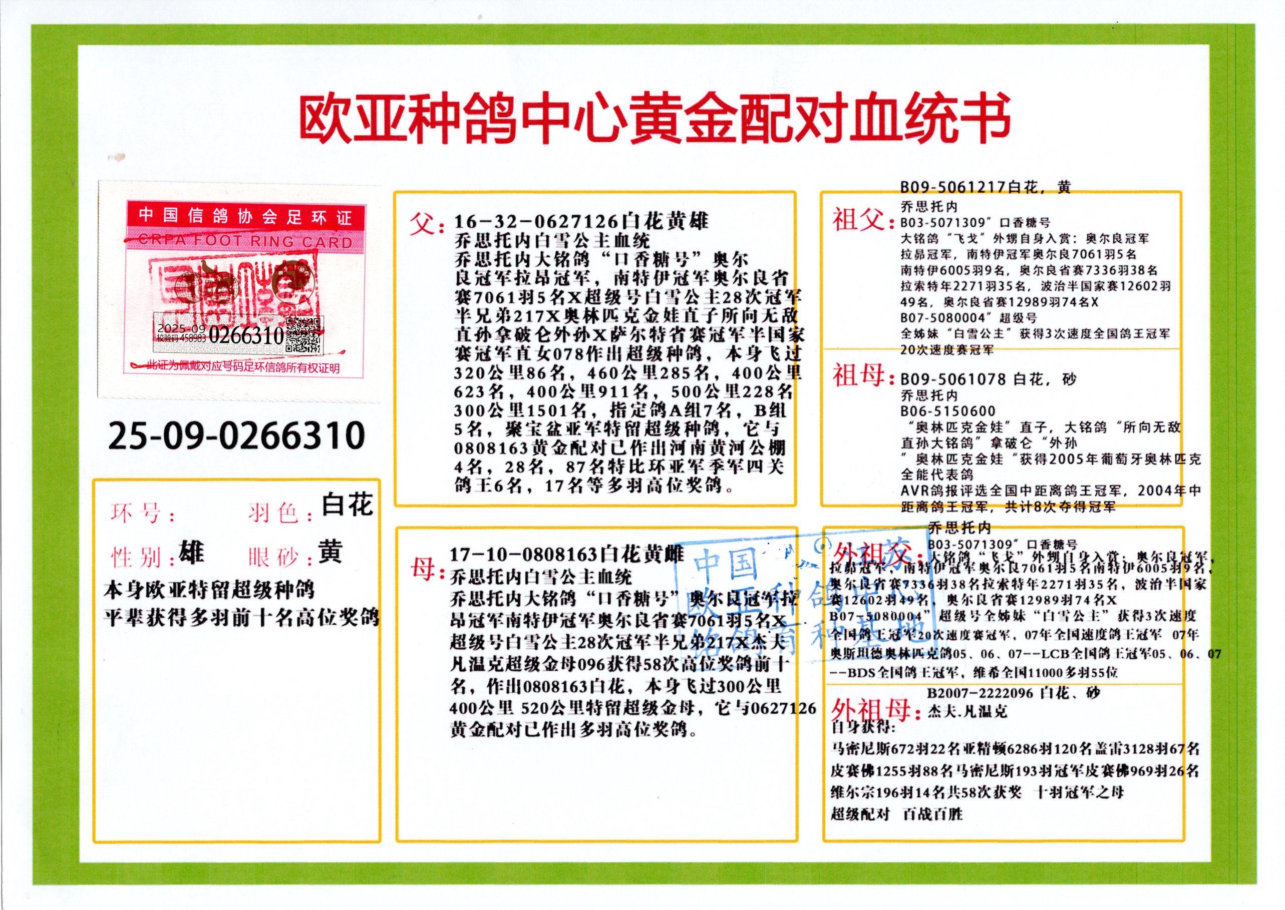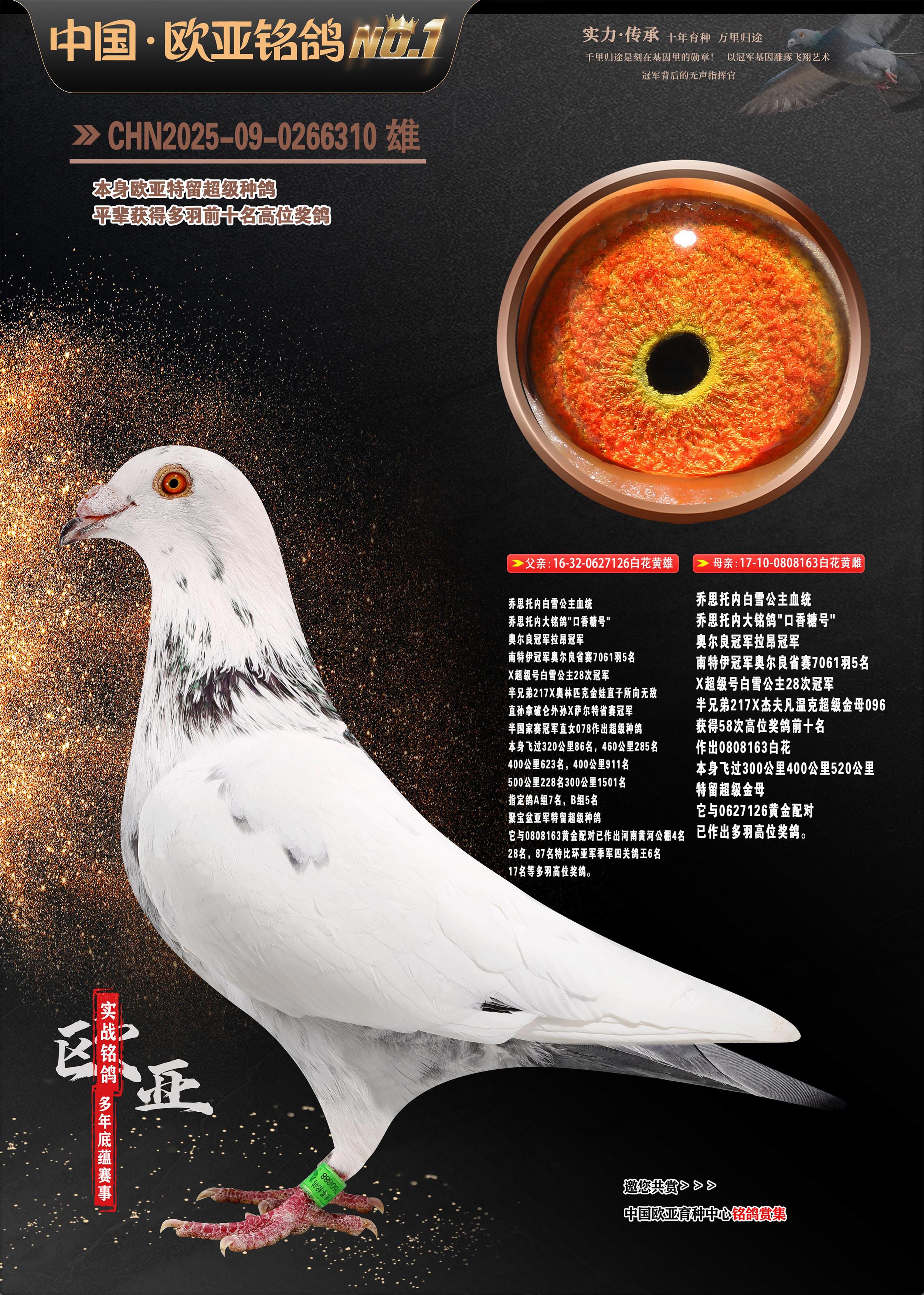 24年秋南京特比环欧亚荣获大团体冠军.小团体冠军551公里大特比13名.14名.16名.19名.20名.21名.24名.26名.27名.28名.42名.52名.54名.57名.65名.66名.68名.70名.71名.72名.74名.76名.80名.82名.83名.84名.85名.86名.90名.92名.110名.116名.121名.122名.128名.131名.158名.161名.164名.165名.166名.172名.174名.177名.182名.195名.196名.201名.205名.208名.210名.216名.253名.269名.275名.276名.294名.296名.299名,,24年秋云南天南铜都公棚决赛415名.天南铜都小棚决赛409名.云南玉活公棚决赛102名.490名.团体32名上笼二羽进二羽,天南铜都大棚506公里决赛445名。热烈祝贺河北省巨鹿县李兰生老师用欧亚泰山号血系连续十一年夺冠军,河北省国家赛冠军.全国季军等多次前十名高位,扬州王军王总用欧亚利奥24年春季获山东翔宇公棚决赛33名盖比53名。南京刘正龙刘总用欧亚盖比获得24年秋山东潍坊国际公棚决赛42名.精英赛30名.三关鸽王71名.决赛86名.加站赛16名.南京市特比环A组鸽王9名.B组鸽王5名.6名.C组鸽王5名.精英赛冠军4名.技能赛A组冠军4名.5名.秦淮区特比环荣获15名.46名.48名.87名。四川西昌徐亮徐总用欧亚利奥获得凉山州聚友决赛177名.第二关亚军双关鸽王19名.三关鸽王105名.云南豪庭公棚决赛603名。热烈祝贺24年四川重庆翔园鸽舍用欧亚泰山号荣获春季400公里冠军.秋季500公里冠军,河北王总用詹森X利奥获得千羽千翔公棚400公里冠军,广东蔡楷焕荣获24年秋爱好者 赛鸽俱乐部三关鸽王季军.一关420公里99名.二关450公里11名.三关520公里32名.单关季军.7名.12名,江西李卫兴荣获贵州红枫公棚8名.共翔俱乐部寄养棚四关综合鸽王30名.一关400公里78名.二关500公里55名.三关520公里37名.四关500公里57名.同父母获公棚18名.雷鸣获得武汉黄浦育翔中心冠军,四川陈文获得四川明鸿俱乐部300公里梦幻2名.3名.4名.9名.10名.13名.14名.15名.31名.34名.40名.41名.42名.43名.69名.71名.72名.73名.74名.94名.95名.97名.98名.99名.419公里决赛荣获总冠军7名.总共归巢9羽,四川徐亮获豪庭决赛603名,山西郑勇获得山西泰鑫公棚决赛255名詹森红狐,热烈祝贺马总获得开尔(飞跃队)决赛9名获奖金1310000万元.第一关52名,天津津福资赛180公里96名.获奖金429543万元,欧亚支持全国鸽友24年秋多人报喜 祝大家取得更好成绩,给欧亚报喜鸽友欧亚决定给每人赠送一羽超级种鸽。欧亚俱乐部特比环多关鸽王成绩:15年秋淮安特比环黑色星期一全会上笼9700多羽,当天无鸽归巢,第二天全会归巢357羽,本舍归巢158羽.前十名八羽.前一百名归巢57羽,16年春季获五关鸽王总冠军,总亚军四名.六名.七名.九名.十名.晶艺俱乐部520公里冠亚季军5名.6名.7名.9名.11名等,火车头冠军.季军6名.8名.9名.10名,16年秋晶艺俱乐部特比环520公里亚军.季军4名.6名.7名.9名,15年春南京白下特比环冠军.亚军.季军6名.7名.8名.9名.10名.指定鸽A B组获得冠军.亚军.季军4名.5名.,17年淮安特比环亚军.4名.5名.7名.8名.10名.六关鸽王总冠军.4名.6名.9名.10名,寄养棚宿迁刘总20羽特比环获冠军.季军.4名.7名.8名.9名等。18年荣获万羽特比环六关鸽王总冠军.总亚军.总季军.6名.8名.十名.单关四羽冠军.二羽亚军.四羽季军.前十名27羽。19年秋万羽特比环六关鸽王总亚军.总季军.5名.8名等,单关二羽冠军.三羽亚军.一羽季军前十名31羽。20年秋淮安市鸽会四关特比环大赛风雨无阻鸽王亚军.鸽王六名,金品俱乐部万羽特比环六关鸽王总冠军,总亚军.四名.五名.六名.七名.八名.十名.前二百名鸽王35羽,单关冠亚季军前十名四十多羽,火车头五关鸽王季军.六名.八名.前二百名鸽王十七羽。20年春荣获淮安五区一市四关鸽王总冠军.亚军.四名.八名.九名。21年秋荣获金品万羽特比环大赛六关鸽王总亚军.总季军.四名.七名.九名.十名.单关冠亚军季军前十名三十多羽。火车头协会鸽王六名.七名.十名.单关前十名十七羽。22年秋荣获鸽王总冠军.总亚军.5名.7名.8名.9名.11名.单关冠亚季军前十名三十多羽,第一关单关前二百名四十多羽,第二关前二百名三十多羽,第三关前二百名四十多羽,第四关前二百名四十多羽,第五关前一百名53羽。23年秋荣获鸽王季军.五名.八名.十名.13名.17名.20名.27名等多羽鸽王.单关前十名二十多羽。公棚.寄养棚部分成绩:16年秋宁夏黄河公棚总冠军电脑戈马力指定通炮冠军,17年送八羽参赛获得鸽王八名进奖四名,支持韩总荣获八名。支持鸽友荣获宁夏中卫公棚决赛总冠军.精英赛冠军,支持18年宁夏黄河公棚决赛冠军詹森X泰山。安徽鼎博寄养棚院内外四关鸽王总冠军.鸽王十七名.三十七名同窝,鸽王39名.42名.58名.67名。18年山东公棚预赛冠军.决赛65名.送八羽进奖五羽.指定获奔驰汽车一辆。支持鸽友获得云南蓝云公棚冠军.盖比X佛卡门。支持鸽友荣获云南银集公棚决赛冠军 詹森427X520血系 速度赛6700羽冠军。17年荣获金马俱乐部寄养棚四关鸽王总冠军.季军.六名.八名.第一关冠军.亚军.季军四名.七名.十一名.金牌教练奖。支持鸽友18年北京费翔公棚预赛九名电脑X桑杰士,支持鸽友荣获陕西威力公棚决赛11名.内蒙古临河寄养棚四关鸽王六名.詹森配泰山,支持河北王总用欧亚詹森427配胡本喜获20年秋开尔青年棚季军。云南东荣公棚16年预赛冠军.决赛77名.17年决赛12名.詹森红狐X泰山,17年平安公棚决赛4名 詹森427。欧亚获得21年金母寄养棚第一关四名.第二关5名.第三关5名.6名.7名.10名.三关鸽王总冠军,四关鸽王14名.十羽鸽王。支持河