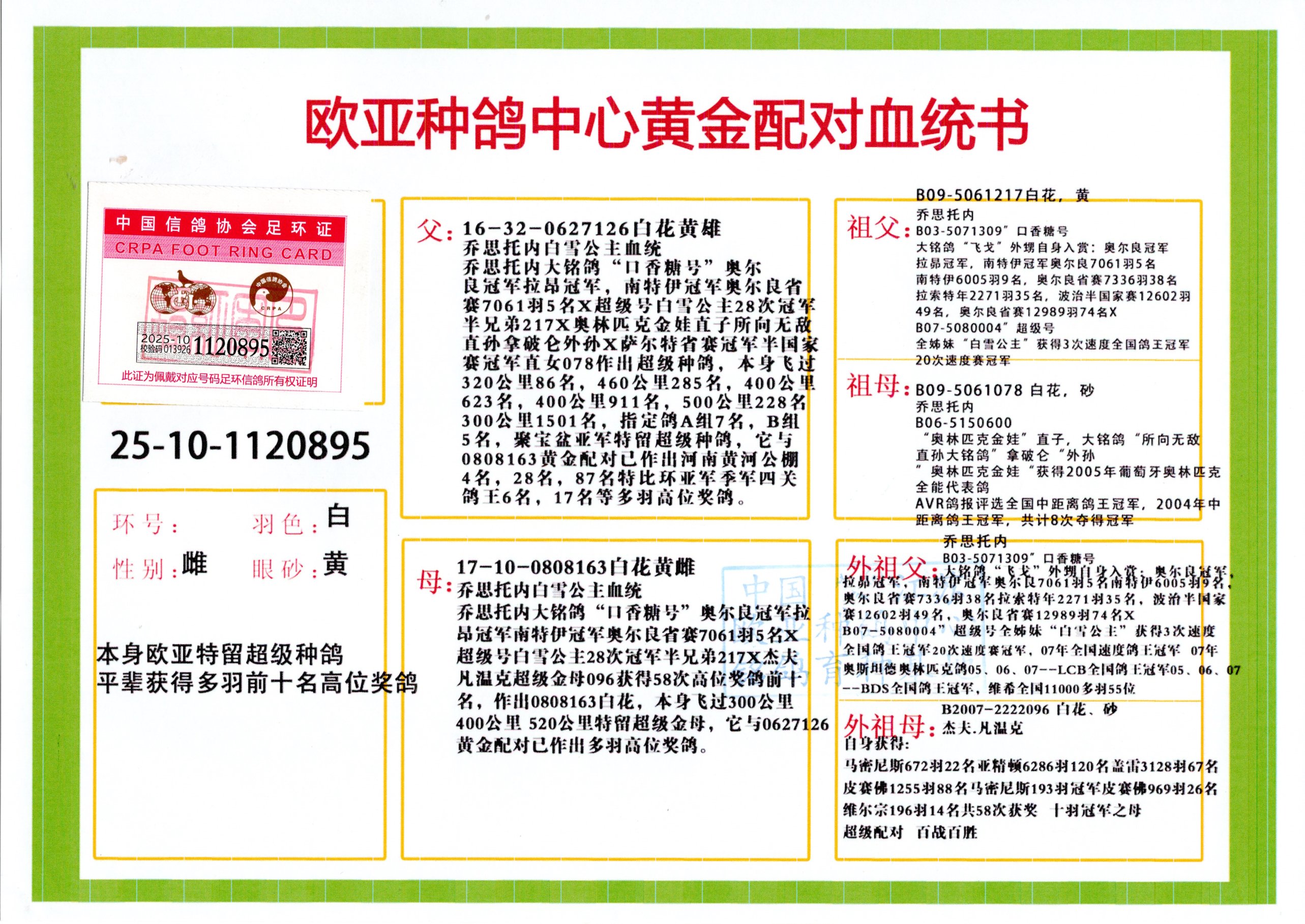 24年秋南京特比环欧亚荣获大团体冠军.小团体冠军551公里大特比13名.14名.16名.19名.20名.21名.24名.26名.27名.28名.42名.52名.54名.57名.65名.66名.68名.70名.71名.72名.74名.76名.80名.82名.83名.84名.85名.86名.90名.92名.110名.116名.121名.122名.128名.131名.158名.161名.164名.165名.166名.172名.174名.177名.182名.195名.196名.201名.205名.208名.210名.216名.253名.269名.275名.276名.294名.296名.299名,,24年秋云南天南铜都公棚决赛415名.天南铜都小棚决赛409名.云南玉活公棚决赛102名.490名.团体32名上笼二羽进二羽,天南铜都大棚506公里决赛445名。热烈祝贺河北省巨鹿县李兰生老师用欧亚泰山号血系连续十一年夺冠军,河北省国家赛冠军.全国季军等多次前十名高位,扬州王军王总用欧亚利奥24年春季获山东翔宇公棚决赛33名盖比53名。南京刘正龙刘总用欧亚盖比获得24年秋山东潍坊国际公棚决赛42名.精英赛30名.三关鸽王71名.决赛86名.加站赛16名.南京市特比环A组鸽王9名.B组鸽王5名.6名.C组鸽王5名.精英赛冠军4名.技能赛A组冠军4名.5名.秦淮区特比环荣获15名.46名.48名.87名。四川西昌徐亮徐总用欧亚利奥获得凉山州聚友决赛177名.第二关亚军双关鸽王19名.三关鸽王105名.云南豪庭公棚决赛603名。热烈祝贺24年四川重庆翔园鸽舍用欧亚泰山号荣获春季400公里冠军.秋季500公里冠军,河北王总用詹森X利奥获得千羽千翔公棚400公里冠军,广东蔡楷焕荣获24年秋爱好者 赛鸽俱乐部三关鸽王季军.一关420公里99名.二关450公里11名.三关520公里32名.单关季军.7名.12名,江西李卫兴荣获贵州红枫公棚8名.共翔俱乐部寄养棚四关综合鸽王30名.一关400公里78名.二关500公里55名.三关520公里37名.四关500公里57名.同父母获公棚18名.雷鸣获得武汉黄浦育翔中心冠军,四川陈文获得四川明鸿俱乐部300公里梦幻2名.3名.4名.9名.10名.13名.14名.15名.31名.34名.40名.41名.42名.43名.69名.71名.72名.73名.74名.94名.95名.97名.98名.99名.419公里决赛荣获总冠军7名.总共归巢9羽,四川徐亮获豪庭决赛603名,山西郑勇获得山西泰鑫公棚决赛255名詹森红狐,热烈祝贺马总获得开尔(飞跃队)决赛9名获奖金1310000万元.第一关52名,天津津福资赛180公里96名.获奖金429543万元,欧亚支持全国鸽友24年秋多人报喜 祝大家取得更好成绩,给欧亚报喜鸽友欧亚决定给每人赠送一羽超级种鸽。欧亚俱乐部特比环多关鸽王成绩:15年秋淮安特比环黑色星期一全会上笼9700多羽,当天无鸽归巢,第二天全会归巢357羽,本舍归巢158羽.前十名八羽.前一百名归巢57羽,16年春季获五关鸽王总冠军,总亚军四名.六名.七名.九名.十名.晶艺俱乐部520公里冠亚季军5名.6名.7名.9名.11名等,火车头冠军.季军6名.8名.9名.10名,16年秋晶艺俱乐部特比环520公里亚军.季军4名.6名.7名.9名,15年春南京白下特比环冠军.亚军.季军6名.7名.8名.9名.10名.指定鸽A B组获得冠军.亚军.季军4名.5名.,17年淮安特比环亚军.4名.5名.7名.8名.10名.六关鸽王总冠军.4名.6名.9名.10名,寄养棚宿迁刘总20羽特比环获冠军.季军.4名.7名.8名.9名等。18年荣获万羽特比环六关鸽王总冠军.总亚军.总季军.6名.8名.十名.单关四羽冠军.二羽亚军.四羽季军.前十名27羽。19年秋万羽特比环六关鸽王总亚军.总季军.5名.8名等,单关二羽冠军.三羽亚军.一羽季军前十名31羽。20年秋淮安市鸽会四关特比环大赛风雨无阻鸽王亚军.鸽王六名,金品俱乐部万羽特比环六关鸽王总冠军,总亚军.四名.五名.六名.七名.八名.十名.前二百名鸽王35羽,单关冠亚季军前十名四十多羽,火车头五关鸽王季军.六名.八名.前二百名鸽王十七羽。20年春荣获淮安五区一市四关鸽王总冠军.亚军.四名.八名.九名。21年秋荣获金品万羽特比环大赛六关鸽王总亚军.总季军.四名.七名.九名.十名.单关冠亚军季军前十名三十多羽。火车头协会鸽王六名.七名.十名.单关前十名十七羽。22年秋荣获鸽王总冠军.总亚军.5名.7名.8名.9名.11名.单关冠亚季军前十名三十多羽,第一关单关前二百名四十多羽,第二关前二百名三十多羽,第三关前二百名四十多羽,第四关前二百名四十多羽,第五关前一百名53羽。23年秋荣获鸽王季军.五名.八名.十名.13名.17名.20名.27名等多羽鸽王.单关前十名二十多羽。公棚.寄养棚部分成绩:16年秋宁夏黄河公棚总冠军电脑戈马力指定通炮冠军,17年送八羽参赛获得鸽王八名进奖四名,支持韩总荣获八名。支持鸽友荣获宁夏中卫公棚决赛总冠军.精英赛冠军,支持18年宁夏黄河公棚决赛冠军詹森X泰山。安徽鼎博寄养棚院内外四关鸽王总冠军.鸽王十七名.三十七名同窝,鸽王39名.42名.58名.67名。18年山东公棚预赛冠军.决赛65名.送八羽进奖五羽.指定获奔驰汽车一辆。支持鸽友获得云南蓝云公棚冠军.盖比X佛卡门。支持鸽友荣获云南银集公棚决赛冠军 詹森427X520血系 速度赛6700羽冠军。17年荣获金马俱乐部寄养棚四关鸽王总冠军.季军.六名.八名.第一关冠军.亚军.季军四名.七名.十一名.金牌教练奖。支持鸽友18年北京费翔公棚预赛九名电脑X桑杰士,支持鸽友荣获陕西威力公棚决赛11名.内蒙古临河寄养棚四关鸽王六名.詹森配泰山,支持河北王总用欧亚詹森427配胡本喜获20年秋开尔青年棚季军。云南东荣公棚16年预赛冠军.决赛77名.17年决赛12名.詹森红狐X泰山,17年平安公棚决赛4名 詹森427。欧亚获得21年金母寄养棚第一关四名.第二关5名.第三关5名.6名.7名.10名.三关鸽王总冠军,四关鸽王14名.十羽鸽王。支持河