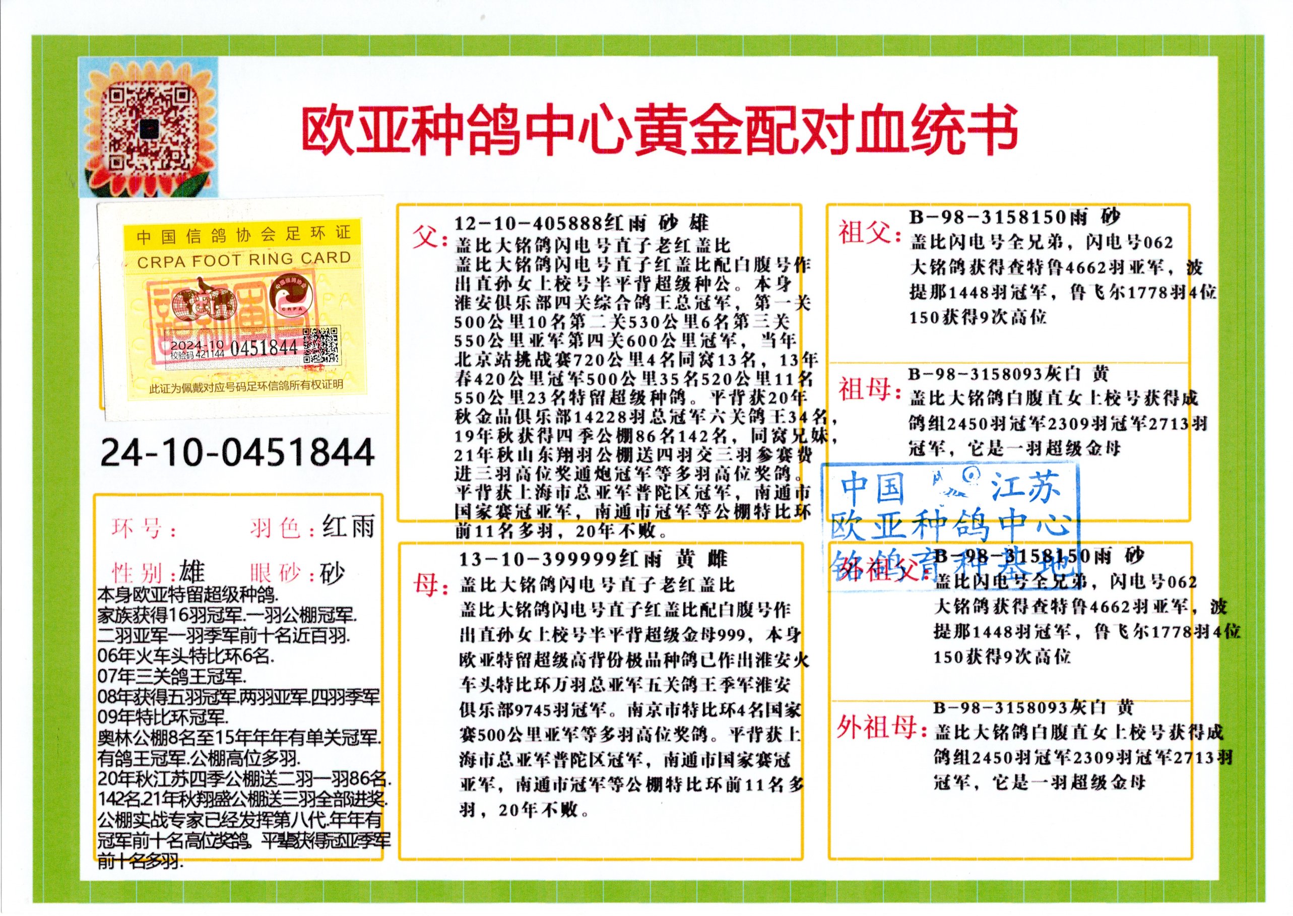 24年秋南京特比环欧亚荣获大团体冠军.小团体冠军551公里大特比13名.14名.16名.19名.20名.21名.24名.26名.27名.28名.42名.52名.54名.57名.65名.66名.68名.70名.71名.72名.74名.76名.80名.82名.83名.84名.85名.86名.90名.92名.110名.116名.121名.122名.128名.131名.158名.161名.164名.165名.166名.172名.174名.177名.182名.195名.196名.201名.205名.208名.210名.216名.253名.269名.275名.276名.294名.296名.299名,,24年秋云南天南铜都公棚决赛415名.天南铜都小棚决赛409名.云南玉活公棚决赛102名.490名.团体32名上笼二羽进二羽,天南铜都大棚506公里决赛445名。热烈祝贺河北省巨鹿县李兰生老师用欧亚泰山号血系连续十一年夺冠军,河北省国家赛冠军.全国季军等多次前十名高位,扬州王军王总用欧亚利奥24年春季获山东翔宇公棚决赛33名盖比53名。南京刘正龙刘总用欧亚盖比获得24年秋山东潍坊国际公棚决赛42名.精英赛30名.三关鸽王71名.决赛86名.加站赛16名.南京市特比环A组鸽王9名.B组鸽王5名.6名.C组鸽王5名.精英赛冠军4名.技能赛A组冠军4名.5名.秦淮区特比环荣获15名.46名.48名.87名。四川西昌徐亮徐总用欧亚利奥获得凉山州聚友决赛177名.第二关亚军双关鸽王19名.三关鸽王105名.云南豪庭公棚决赛603名。热烈祝贺24年四川重庆翔园鸽舍用欧亚泰山号荣获春季400公里冠军.秋季500公里冠军,河北王总用詹森X利奥获得千羽千翔公棚400公里冠军,广东蔡楷焕荣获24年秋爱好者 赛鸽俱乐部三关鸽王季军.一关420公里99名.二关450公里11名.三关520公里32名.单关季军.7名.12名,江西李卫兴荣获贵州红枫公棚8名.共翔俱乐部寄养棚四关综合鸽王30名.一关400公里78名.二关500公里55名.三关520公里37名.四关500公里57名.同父母获公棚18名.雷鸣获得武汉黄浦育翔中心冠军,四川陈文获得四川明鸿俱乐部300公里梦幻2名.3名.4名.9名.10名.13名.14名.15名.31名.34名.40名.41名.42名.43名.69名.71名.72名.73名.74名.94名.95名.97名.98名.99名.419公里决赛荣获总冠军7名.总共归巢9羽,四川徐亮获豪庭决赛603名,山西郑勇获得山西泰鑫公棚决赛255名詹森红狐,热烈祝贺马总获得开尔(飞跃队)决赛9名获奖金1310000万元.第一关52名,天津津福资赛180公里96名.获奖金429543万元,欧亚支持全国鸽友24年秋多人报喜 祝大家取得更好成绩,给欧亚报喜鸽友欧亚决定给每人赠送一羽超级种鸽。欧亚俱乐部特比环多关鸽王成绩:15年秋淮安特比环黑色星期一全会上笼9700多羽,当天无鸽归巢,第二天全会归巢357羽,本舍归巢158羽.前十名八羽.前一百名归巢57羽,16年春季获五关鸽王总冠军,总亚军四名.六名.七名.九名.十名.晶艺俱乐部520公里冠亚季军5名.6名.7名.9名.11名等,火车头冠军.季军6名.8名.9名.10名,16年秋晶艺俱乐部特比环520公里亚军.季军4名.6名.7名.9名,15年春南京白下特比环冠军.亚军.季军6名.7名.8名.9名.10名.指定鸽A B组获得冠军.亚军.季军4名.5名.,17年淮安特比环亚军.4名.5名.7名.8名.10名.六关鸽王总冠军.4名.6名.9名.10名,寄养棚宿迁刘总20羽特比环获冠军.季军.4名.7名.8名.9名等。18年荣获万羽特比环六关鸽王总冠军.总亚军.总季军.6名.8名.十名.单关四羽冠军.二羽亚军.四羽季军.前十名27羽。19年秋万羽特比环六关鸽王总亚军.总季军.5名.8名等,单关二羽冠军.三羽亚军.一羽季军前十名31羽。20年秋淮安市鸽会四关特比环大赛风雨无阻鸽王亚军.鸽王六名,金品俱乐部万羽特比环六关鸽王总冠军,总亚军.四名.五名.六名.七名.八名.十名.前二百名鸽王35羽,单关冠亚季军前十名四十多羽,火车头五关鸽王季军.六名.八名.前二百名鸽王十七羽。20年春荣获淮安五区一市四关鸽王总冠军.亚军.四名.八名.九名。21年秋荣获金品万羽特比环大赛六关鸽王总亚军.总季军.四名.七名.九名.十名.单关冠亚军季军前十名三十多羽。火车头协会鸽王六名.七名.十名.单关前十名十七羽。22年秋荣获鸽王总冠军.总亚军.5名.7名.8名.9名.11名.单关冠亚季军前十名三十多羽,第一关单关前二百名四十多羽,第二关前二百名三十多羽,第三关前二百名四十多羽,第四关前二百名四十多羽,第五关前一百名53羽。23年秋荣获鸽王季军.五名.八名.十名.13名.17名.20名.27名等多羽鸽王.单关前十名二十多羽。公棚.寄养棚部分成绩:16年秋宁夏黄河公棚总冠军电脑戈马力指定通炮冠军,17年送八羽参赛获得鸽王八名进奖四名,支持韩总荣获八名。支持鸽友荣获宁夏中卫公棚决赛总冠军.精英赛冠军,支持18年宁夏黄河公棚决赛冠军詹森X泰山。安徽鼎博寄养棚院内外四关鸽王总冠军.鸽王十七名.三十七名同窝,鸽王39名.42名.58名.67名。18年山东公棚预赛冠军.决赛65名.送八羽进奖五羽.指定获奔驰汽车一辆。支持鸽友获得云南蓝云公棚冠军.盖比X佛卡门。支持鸽友荣获云南银集公棚决赛冠军 詹森427X520血系 速度赛6700羽冠军。17年荣获金马俱乐部寄养棚四关鸽王总冠军.季军.六名.八名.第一关冠军.亚军.季军四名.七名.十一名.金牌教练奖。支持鸽友18年北京费翔公棚预赛九名电脑X桑杰士,支持鸽友荣获陕西威力公棚决赛11名.内蒙古临河寄养棚四关鸽王六名.詹森配泰山,支持河北王总用欧亚詹森427配胡本喜获20年秋开尔青年棚季军。云南东荣公棚16年预赛冠军.决赛77名.17年决赛12名.詹森红狐X泰山,17年平安公棚决赛4名 詹森427。欧亚获得21年金母寄养棚第一关四名.第二关5名.第三关5名.6名.7名.10名.三关鸽王总冠军,四关鸽王14名.十羽鸽王。支持河