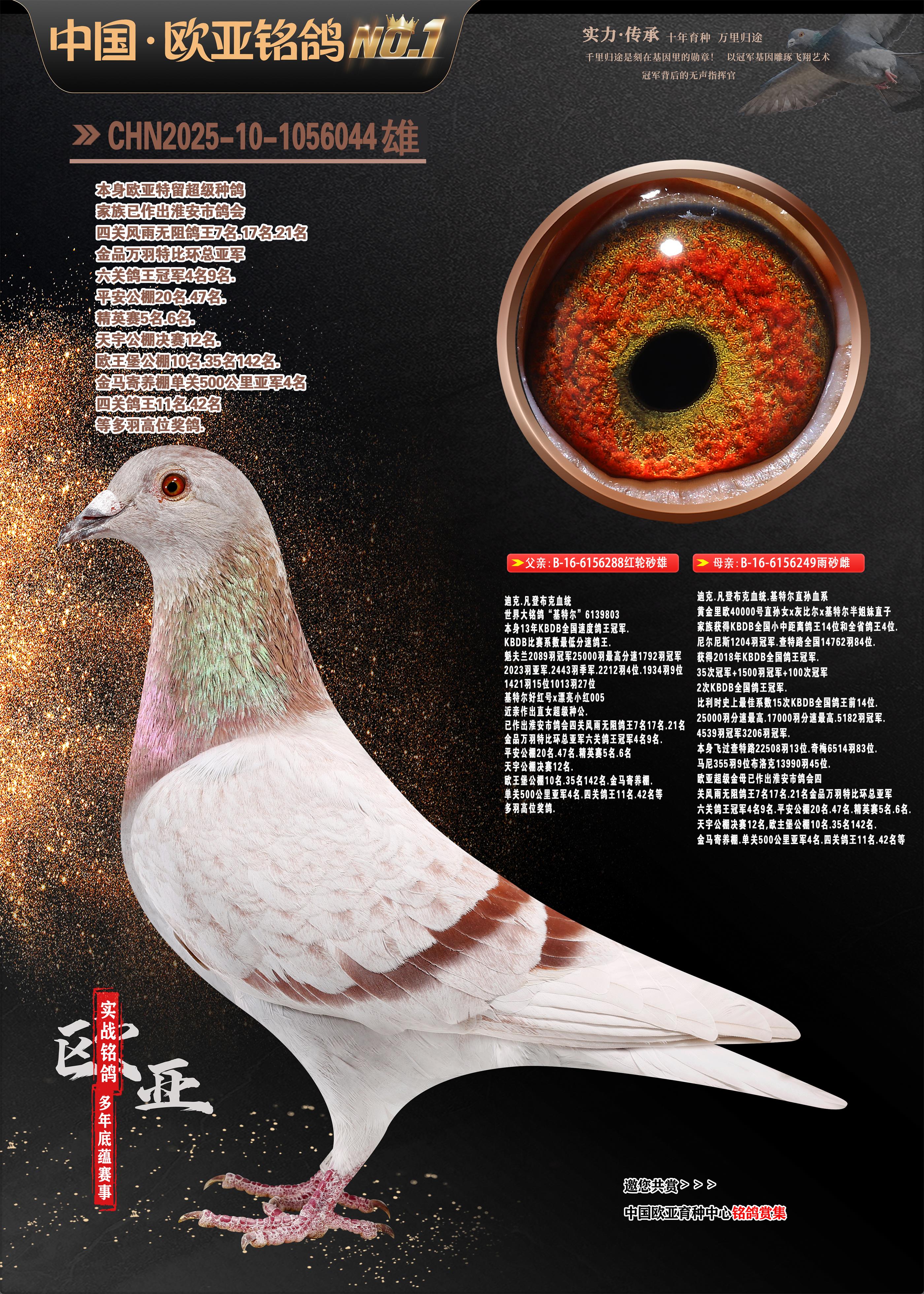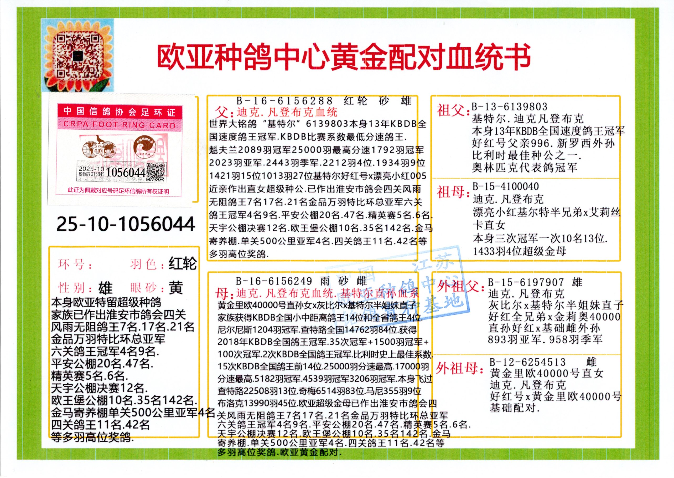 24年秋南京特比环欧亚荣获大团体冠军.小团体冠军551公里大特比13名.14名.16名.19名.20名.21名.24名.26名.27名.28名.42名.52名.54名.57名.65名.66名.68名.70名.71名.72名.74名.76名.80名.82名.83名.84名.85名.86名.90名.92名.110名.116名.121名.122名.128名.131名.158名.161名.164名.165名.166名.172名.174名.177名.182名.195名.196名.201名.205名.208名.210名.216名.253名.269名.275名.276名.294名.296名.299名,,24年秋云南天南铜都公棚决赛415名.天南铜都小棚决赛409名.云南玉活公棚决赛102名.490名.团体32名上笼二羽进二羽,天南铜都大棚506公里决赛445名。热烈祝贺河北省巨鹿县李兰生老师用欧亚泰山号血系连续十一年夺冠军,河北省国家赛冠军.全国季军等多次前十名高位,扬州王军王总用欧亚利奥24年春季获山东翔宇公棚决赛33名盖比53名。南京刘正龙刘总用欧亚盖比获得24年秋山东潍坊国际公棚决赛42名.精英赛30名.三关鸽王71名.决赛86名.加站赛16名.南京市特比环A组鸽王9名.B组鸽王5名.6名.C组鸽王5名.精英赛冠军4名.技能赛A组冠军4名.5名.秦淮区特比环荣获15名.46名.48名.87名。四川西昌徐亮徐总用欧亚利奥获得凉山州聚友决赛177名.第二关亚军双关鸽王19名.三关鸽王105名.云南豪庭公棚决赛603名。热烈祝贺24年四川重庆翔园鸽舍用欧亚泰山号荣获春季400公里冠军.秋季500公里冠军,河北王总用詹森X利奥获得千羽千翔公棚400公里冠军,广东蔡楷焕荣获24年秋爱好者 赛鸽俱乐部三关鸽王季军.一关420公里99名.二关450公里11名.三关520公里32名.单关季军.7名.12名,江西李卫兴荣获贵州红枫公棚8名.共翔俱乐部寄养棚四关综合鸽王30名.一关400公里78名.二关500公里55名.三关520公里37名.四关500公里57名.同父母获公棚18名.雷鸣获得武汉黄浦育翔中心冠军,四川陈文获得四川明鸿俱乐部300公里梦幻2名.3名.4名.9名.10名.13名.14名.15名.31名.34名.40名.41名.42名.43名.69名.71名.72名.73名.74名.94名.95名.97名.98名.99名.419公里决赛荣获总冠军7名.总共归巢9羽,四川徐亮获豪庭决赛603名,山西郑勇获得山西泰鑫公棚决赛255名詹森红狐,热烈祝贺马总获得开尔(飞跃队)决赛9名获奖金1310000万元.第一关52名,天津津福资赛180公里96名.获奖金429543万元,欧亚支持全国鸽友24年秋多人报喜 祝大家取得更好成绩,给欧亚报喜鸽友欧亚决定给每人赠送一羽超级种鸽。欧亚俱乐部特比环多关鸽王成绩:15年秋淮安特比环黑色星期一全会上笼9700多羽,当天无鸽归巢,第二天全会归巢357羽,本舍归巢158羽.前十名八羽.前一百名归巢57羽,16年春季获五关鸽王总冠军,总亚军四名.六名.七名.九名.十名.晶艺俱乐部520公里冠亚季军5名.6名.7名.9名.11名等,火车头冠军.季军6名.8名.9名.10名,16年秋晶艺俱乐部特比环520公里亚军.季军4名.6名.7名.9名,15年春南京白下特比环冠军.亚军.季军6名.7名.8名.9名.10名.指定鸽A B组获得冠军.亚军.季军4名.5名.,17年淮安特比环亚军.4名.5名.7名.8名.10名.六关鸽王总冠军.4名.6名.9名.10名,寄养棚宿迁刘总20羽特比环获冠军.季军.4名.7名.8名.9名等。18年荣获万羽特比环六关鸽王总冠军.总亚军.总季军.6名.8名.十名.单关四羽冠军.二羽亚军.四羽季军.前十名27羽。19年秋万羽特比环六关鸽王总亚军.总季军.5名.8名等,单关二羽冠军.三羽亚军.一羽季军前十名31羽。20年秋淮安市鸽会四关特比环大赛风雨无阻鸽王亚军.鸽王六名,金品俱乐部万羽特比环六关鸽王总冠军,总亚军.四名.五名.六名.七名.八名.十名.前二百名鸽王35羽,单关冠亚季军前十名四十多羽,火车头五关鸽王季军.六名.八名.前二百名鸽王十七羽。20年春荣获淮安五区一市四关鸽王总冠军.亚军.四名.八名.九名。21年秋荣获金品万羽特比环大赛六关鸽王总亚军.总季军.四名.七名.九名.十名.单关冠亚军季军前十名三十多羽。火车头协会鸽王六名.七名.十名.单关前十名十七羽。22年秋荣获鸽王总冠军.总亚军.5名.7名.8名.9名.11名.单关冠亚季军前十名三十多羽,第一关单关前二百名四十多羽,第二关前二百名三十多羽,第三关前二百名四十多羽,第四关前二百名四十多羽,第五关前一百名53羽。23年秋荣获鸽王季军.五名.八名.十名.13名.17名.20名.27名等多羽鸽王.单关前十名二十多羽。公棚.寄养棚部分成绩:16年秋宁夏黄河公棚总冠军电脑戈马力指定通炮冠军,17年送八羽参赛获得鸽王八名进奖四名,支持韩总荣获八名。支持鸽友荣获宁夏中卫公棚决赛总冠军.精英赛冠军,支持18年宁夏黄河公棚决赛冠军詹森X泰山。安徽鼎博寄养棚院内外四关鸽王总冠军.鸽王十七名.三十七名同窝,鸽王39名.42名.58名.67名。18年山东公棚预赛冠军.决赛65名.送八羽进奖五羽.指定获奔驰汽车一辆。支持鸽友获得云南蓝云公棚冠军.盖比X佛卡门。支持鸽友荣获云南银集公棚决赛冠军 詹森427X520血系 速度赛6700羽冠军。17年荣获金马俱乐部寄养棚四关鸽王总冠军.季军.六名.八名.第一关冠军.亚军.季军四名.七名.十一名.金牌教练奖。支持鸽友18年北京费翔公棚预赛九名电脑X桑杰士,支持鸽友荣获陕西威力公棚决赛11名.内蒙古临河寄养棚四关鸽王六名.詹森配泰山,支持河北王总用欧亚詹森427配胡本喜获20年秋开尔青年棚季军。云南东荣公棚16年预赛冠军.决赛77名.17年决赛12名.詹森红狐X泰山,17年平安公棚决赛4名 詹森427。欧亚获得21年金母寄养棚第一关四名.第二关5名.第三关5名.6名.7名.10名.三关鸽王总冠军,四关鸽王14名.十羽鸽王。支持河