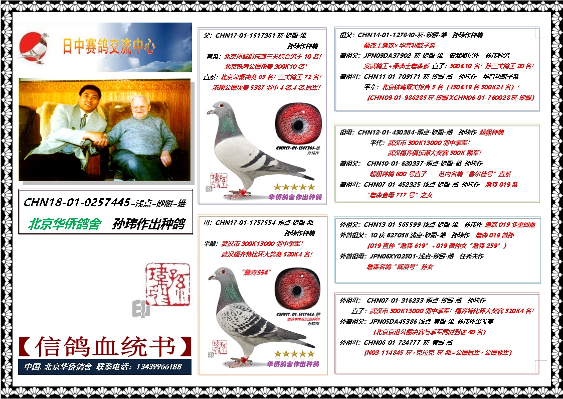 北京《华侨鸽舍》自1993年成立至今已经33年,其主血来自日本华侨名鸽收藏家任秀夫、胡英辉(已故)及日本鸽界的名人、名血、名系!
