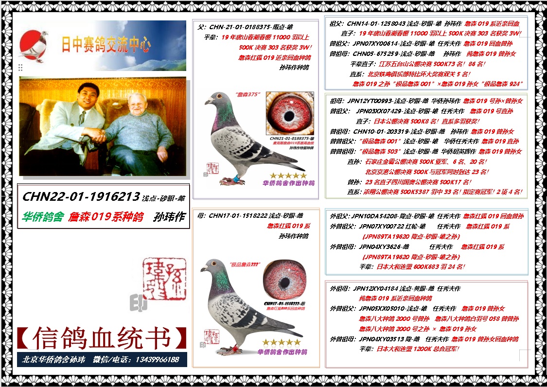 北京《华侨鸽舍》自1993年成立至今已经33年,其主血来自日本华侨名鸽收藏家任秀夫、胡英辉(已故)及日本鸽界的名人、名血、名系!