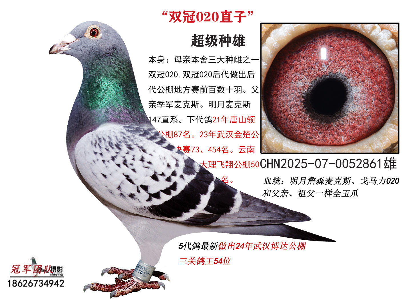 血统书足环卡随鸽发出,低价位高品质幼鸽,种赛皆宜。良心做人,所有成绩血统假一赔百,不做虚假宣传!