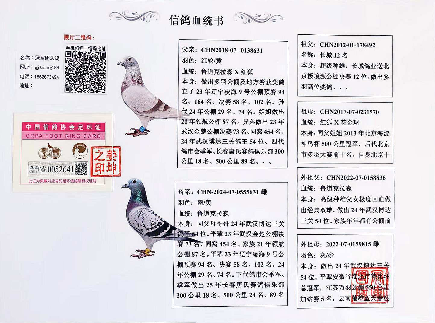 血统书足环卡随鸽发出,低价位高品质幼鸽,种赛皆宜。良心做人,所有成绩血统假一赔百,不做虚假宣传!