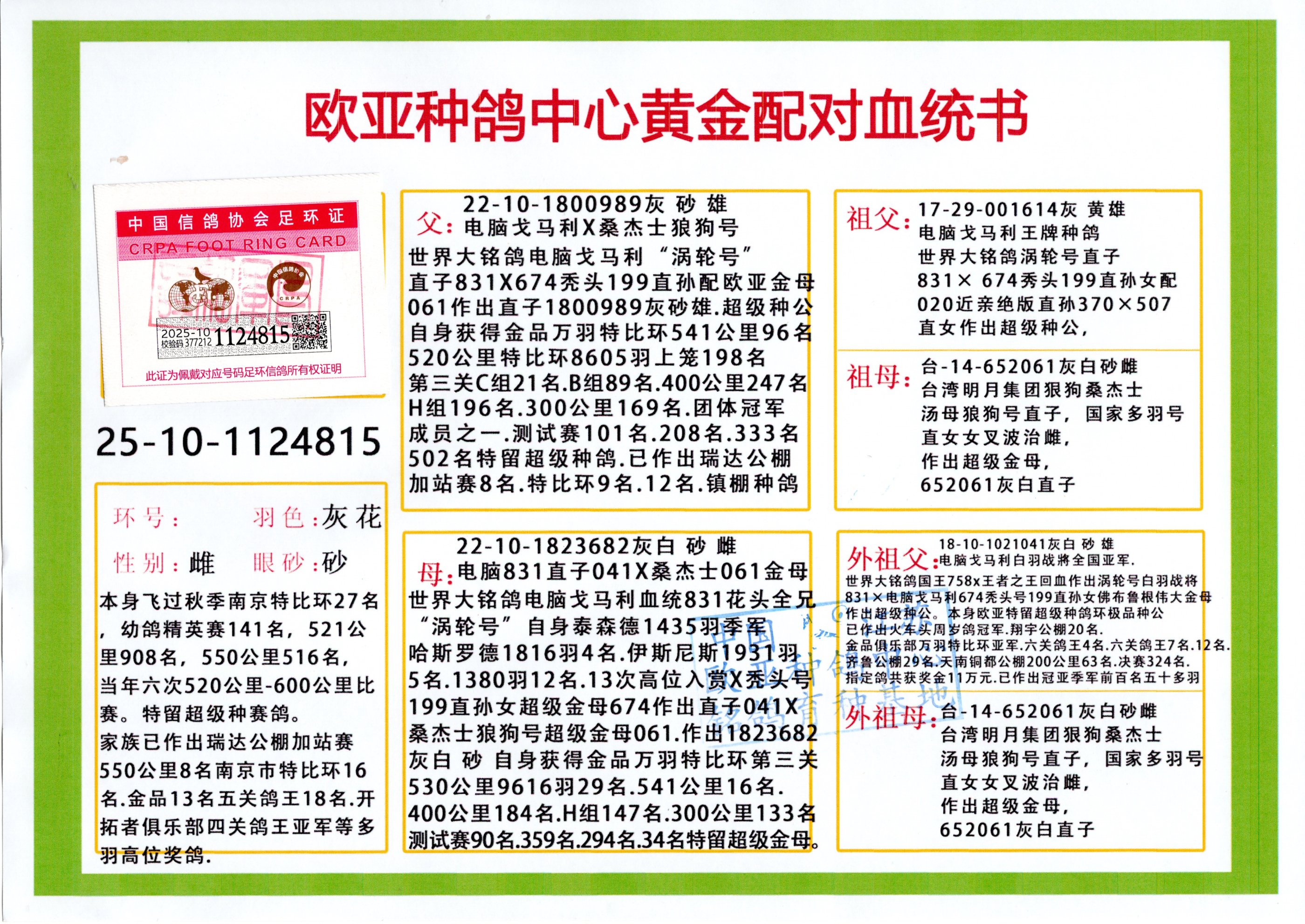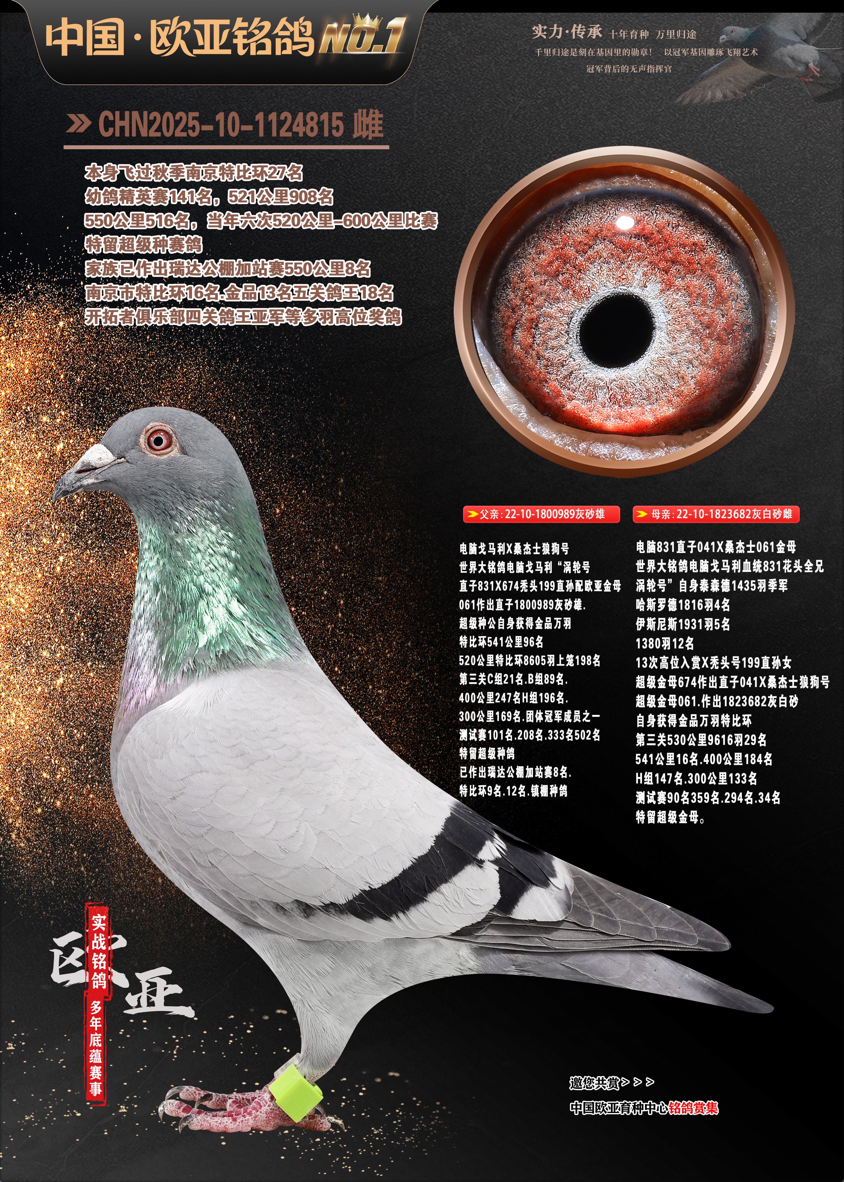 24年秋南京特比环欧亚荣获大团体冠军.小团体冠军551公里大特比13名.14名.16名.19名.20名.21名.24名.26名.27名.28名.42名.52名.54名.57名.65名.66名.68名.70名.71名.72名.74名.76名.80名.82名.83名.84名.85名.86名.90名.92名.110名.116名.121名.122名.128名.131名.158名.161名.164名.165名.166名.172名.174名.177名.182名.195名.196名.201名.205名.208名.210名.216名.253名.269名.275名.276名.294名.296名.299名,,24年秋云南天南铜都公棚决赛415名.天南铜都小棚决赛409名.云南玉活公棚决赛102名.490名.团体32名上笼二羽进二羽,天南铜都大棚506公里决赛445名。热烈祝贺河北省巨鹿县李兰生老师用欧亚泰山号血系连续十一年夺冠军,河北省国家赛冠军.全国季军等多次前十名高位,扬州王军王总用欧亚利奥24年春季获山东翔宇公棚决赛33名盖比53名。南京刘正龙刘总用欧亚盖比获得24年秋山东潍坊国际公棚决赛42名.精英赛30名.三关鸽王71名.决赛86名.加站赛16名.南京市特比环A组鸽王9名.B组鸽王5名.6名.C组鸽王5名.精英赛冠军4名.技能赛A组冠军4名.5名.秦淮区特比环荣获15名.46名.48名.87名。四川西昌徐亮徐总用欧亚利奥获得凉山州聚友决赛177名.第二关亚军双关鸽王19名.三关鸽王105名.云南豪庭公棚决赛603名。热烈祝贺24年四川重庆翔园鸽舍用欧亚泰山号荣获春季400公里冠军.秋季500公里冠军,河北王总用詹森X利奥获得千羽千翔公棚400公里冠军,广东蔡楷焕荣获24年秋爱好者 赛鸽俱乐部三关鸽王季军.一关420公里99名.二关450公里11名.三关520公里32名.单关季军.7名.12名,江西李卫兴荣获贵州红枫公棚8名.共翔俱乐部寄养棚四关综合鸽王30名.一关400公里78名.二关500公里55名.三关520公里37名.四关500公里57名.同父母获公棚18名.雷鸣获得武汉黄浦育翔中心冠军,四川陈文获得四川明鸿俱乐部300公里梦幻2名.3名.4名.9名.10名.13名.14名.15名.31名.34名.40名.41名.42名.43名.69名.71名.72名.73名.74名.94名.95名.97名.98名.99名.419公里决赛荣获总冠军7名.总共归巢9羽,四川徐亮获豪庭决赛603名,山西郑勇获得山西泰鑫公棚决赛255名詹森红狐,热烈祝贺马总获得开尔(飞跃队)决赛9名获奖金1310000万元.第一关52名,天津津福资赛180公里96名.获奖金429543万元,欧亚支持全国鸽友24年秋多人报喜 祝大家取得更好成绩,给欧亚报喜鸽友欧亚决定给每人赠送一羽超级种鸽。欧亚俱乐部特比环多关鸽王成绩:15年秋淮安特比环黑色星期一全会上笼9700多羽,当天无鸽归巢,第二天全会归巢357羽,本舍归巢158羽.前十名八羽.前一百名归巢57羽,16年春季获五关鸽王总冠军,总亚军四名.六名.七名.九名.十名.晶艺俱乐部520公里冠亚季军5名.6名.7名.9名.11名等,火车头冠军.季军6名.8名.9名.10名,16年秋晶艺俱乐部特比环520公里亚军.季军4名.6名.7名.9名,15年春南京白下特比环冠军.亚军.季军6名.7名.8名.9名.10名.指定鸽A B组获得冠军.亚军.季军4名.5名.,17年淮安特比环亚军.4名.5名.7名.8名.10名.六关鸽王总冠军.4名.6名.9名.10名,寄养棚宿迁刘总20羽特比环获冠军.季军.4名.7名.8名.9名等。18年荣获万羽特比环六关鸽王总冠军.总亚军.总季军.6名.8名.十名.单关四羽冠军.二羽亚军.四羽季军.前十名27羽。19年秋万羽特比环六关鸽王总亚军.总季军.5名.8名等,单关二羽冠军.三羽亚军.一羽季军前十名31羽。20年秋淮安市鸽会四关特比环大赛风雨无阻鸽王亚军.鸽王六名,金品俱乐部万羽特比环六关鸽王总冠军,总亚军.四名.五名.六名.七名.八名.十名.前二百名鸽王35羽,单关冠亚季军前十名四十多羽,火车头五关鸽王季军.六名.八名.前二百名鸽王十七羽。20年春荣获淮安五区一市四关鸽王总冠军.亚军.四名.八名.九名。21年秋荣获金品万羽特比环大赛六关鸽王总亚军.总季军.四名.七名.九名.十名.单关冠亚军季军前十名三十多羽。火车头协会鸽王六名.七名.十名.单关前十名十七羽。22年秋荣获鸽王总冠军.总亚军.5名.7名.8名.9名.11名.单关冠亚季军前十名三十多羽,第一关单关前二百名四十多羽,第二关前二百名三十多羽,第三关前二百名四十多羽,第四关前二百名四十多羽,第五关前一百名53羽。23年秋荣获鸽王季军.五名.八名.十名.13名.17名.20名.27名等多羽鸽王.单关前十名二十多羽。公棚.寄养棚部分成绩:16年秋宁夏黄河公棚总冠军电脑戈马力指定通炮冠军,17年送八羽参赛获得鸽王八名进奖四名,支持韩总荣获八名。支持鸽友荣获宁夏中卫公棚决赛总冠军.精英赛冠军,支持18年宁夏黄河公棚决赛冠军詹森X泰山。安徽鼎博寄养棚院内外四关鸽王总冠军.鸽王十七名.三十七名同窝,鸽王39名.42名.58名.67名。18年山东公棚预赛冠军.决赛65名.送八羽进奖五羽.指定获奔驰汽车一辆。支持鸽友获得云南蓝云公棚冠军.盖比X佛卡门。支持鸽友荣获云南银集公棚决赛冠军 詹森427X520血系 速度赛6700羽冠军。17年荣获金马俱乐部寄养棚四关鸽王总冠军.季军.六名.八名.第一关冠军.亚军.季军四名.七名.十一名.金牌教练奖。支持鸽友18年北京费翔公棚预赛九名电脑X桑杰士,支持鸽友荣获陕西威力公棚决赛11名.内蒙古临河寄养棚四关鸽王六名.詹森配泰山,支持河北王总用欧亚詹森427配胡本喜获20年秋开尔青年棚季军。云南东荣公棚16年预赛冠军.决赛77名.17年决赛12名.詹森红狐X泰山,17年平安公棚决赛4名 詹森427。欧亚获得21年金母寄养棚第一关四名.第二关5名.第三关5名.6名.7名.10名.三关鸽王总冠军,四关鸽王14名.十羽鸽王。支持河