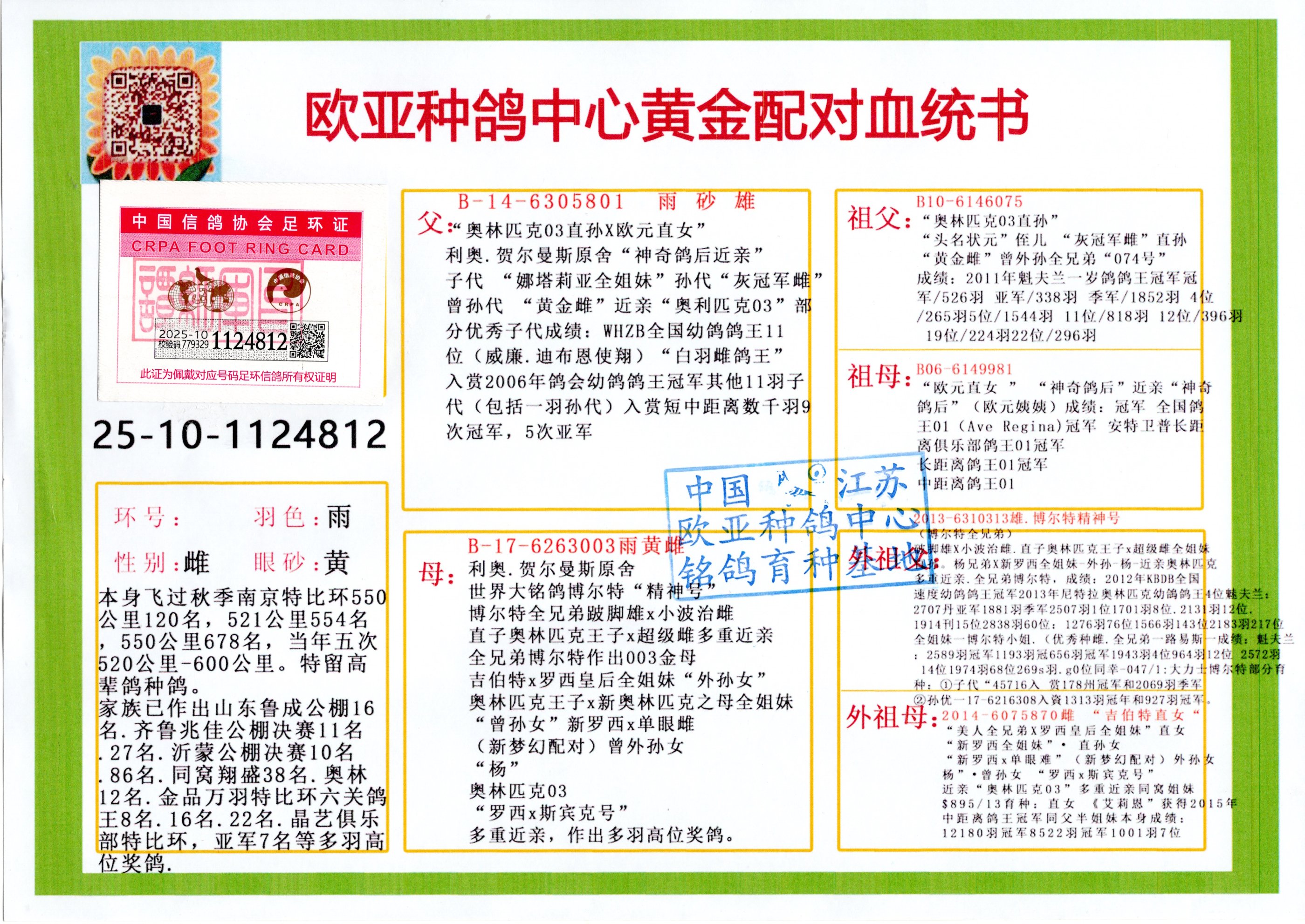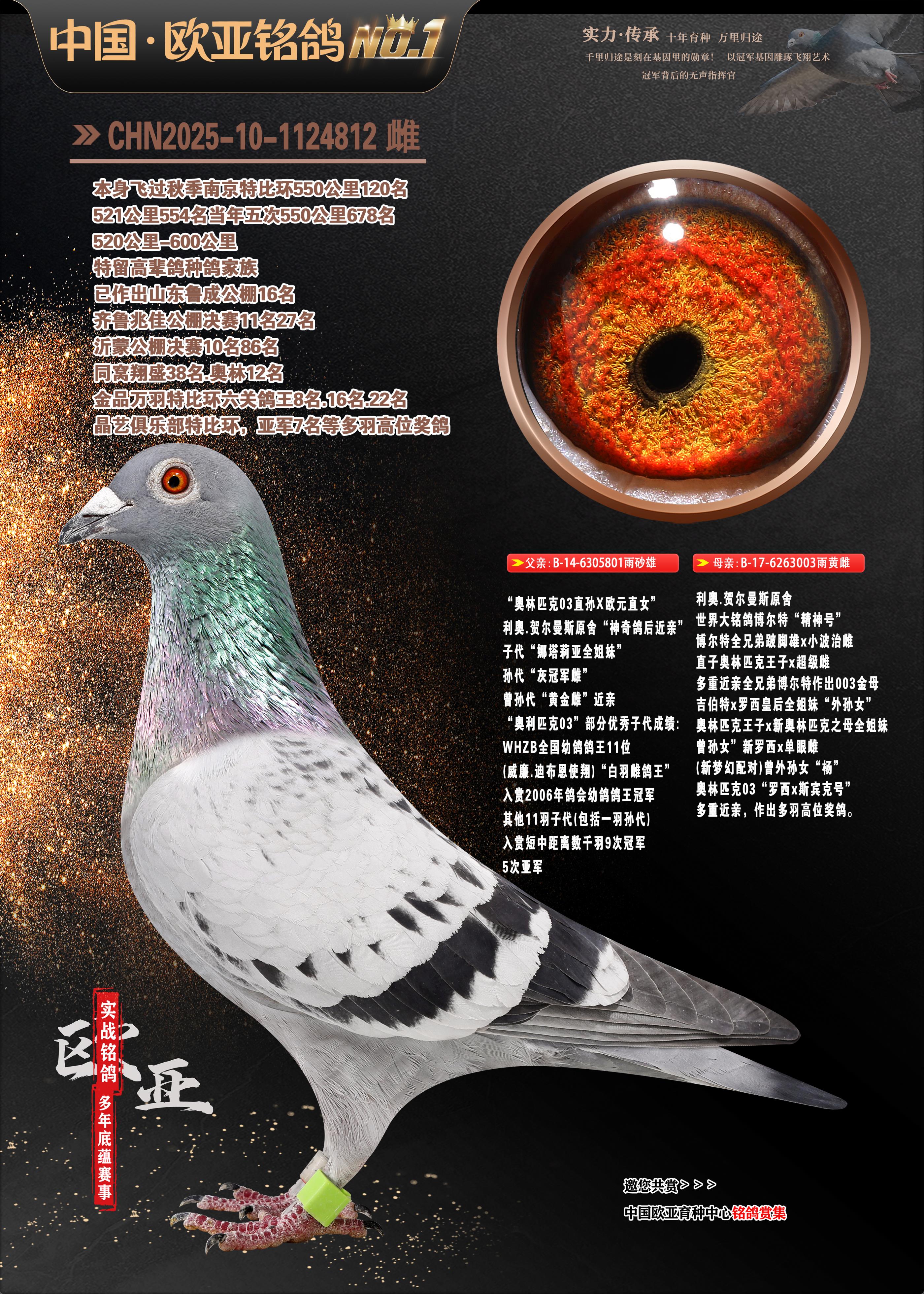 24年秋南京特比环欧亚荣获大团体冠军.小团体冠军551公里大特比13名.14名.16名.19名.20名.21名.24名.26名.27名.28名.42名.52名.54名.57名.65名.66名.68名.70名.71名.72名.74名.76名.80名.82名.83名.84名.85名.86名.90名.92名.110名.116名.121名.122名.128名.131名.158名.161名.164名.165名.166名.172名.174名.177名.182名.195名.196名.201名.205名.208名.210名.216名.253名.269名.275名.276名.294名.296名.299名,,24年秋云南天南铜都公棚决赛415名.天南铜都小棚决赛409名.云南玉活公棚决赛102名.490名.团体32名上笼二羽进二羽,天南铜都大棚506公里决赛445名。热烈祝贺河北省巨鹿县李兰生老师用欧亚泰山号血系连续十一年夺冠军,河北省国家赛冠军.全国季军等多次前十名高位,扬州王军王总用欧亚利奥24年春季获山东翔宇公棚决赛33名盖比53名。南京刘正龙刘总用欧亚盖比获得24年秋山东潍坊国际公棚决赛42名.精英赛30名.三关鸽王71名.决赛86名.加站赛16名.南京市特比环A组鸽王9名.B组鸽王5名.6名.C组鸽王5名.精英赛冠军4名.技能赛A组冠军4名.5名.秦淮区特比环荣获15名.46名.48名.87名。四川西昌徐亮徐总用欧亚利奥获得凉山州聚友决赛177名.第二关亚军双关鸽王19名.三关鸽王105名.云南豪庭公棚决赛603名。热烈祝贺24年四川重庆翔园鸽舍用欧亚泰山号荣获春季400公里冠军.秋季500公里冠军,河北王总用詹森X利奥获得千羽千翔公棚400公里冠军,广东蔡楷焕荣获24年秋爱好者 赛鸽俱乐部三关鸽王季军.一关420公里99名.二关450公里11名.三关520公里32名.单关季军.7名.12名,江西李卫兴荣获贵州红枫公棚8名.共翔俱乐部寄养棚四关综合鸽王30名.一关400公里78名.二关500公里55名.三关520公里37名.四关500公里57名.同父母获公棚18名.雷鸣获得武汉黄浦育翔中心冠军,四川陈文获得四川明鸿俱乐部300公里梦幻2名.3名.4名.9名.10名.13名.14名.15名.31名.34名.40名.41名.42名.43名.69名.71名.72名.73名.74名.94名.95名.97名.98名.99名.419公里决赛荣获总冠军7名.总共归巢9羽,四川徐亮获豪庭决赛603名,山西郑勇获得山西泰鑫公棚决赛255名詹森红狐,热烈祝贺马总获得开尔(飞跃队)决赛9名获奖金1310000万元.第一关52名,天津津福资赛180公里96名.获奖金429543万元,欧亚支持全国鸽友24年秋多人报喜 祝大家取得更好成绩,给欧亚报喜鸽友欧亚决定给每人赠送一羽超级种鸽。欧亚俱乐部特比环多关鸽王成绩:15年秋淮安特比环黑色星期一全会上笼9700多羽,当天无鸽归巢,第二天全会归巢357羽,本舍归巢158羽.前十名八羽.前一百名归巢57羽,16年春季获五关鸽王总冠军,总亚军四名.六名.七名.九名.十名.晶艺俱乐部520公里冠亚季军5名.6名.7名.9名.11名等,火车头冠军.季军6名.8名.9名.10名,16年秋晶艺俱乐部特比环520公里亚军.季军4名.6名.7名.9名,15年春南京白下特比环冠军.亚军.季军6名.7名.8名.9名.10名.指定鸽A B组获得冠军.亚军.季军4名.5名.,17年淮安特比环亚军.4名.5名.7名.8名.10名.六关鸽王总冠军.4名.6名.9名.10名,寄养棚宿迁刘总20羽特比环获冠军.季军.4名.7名.8名.9名等。18年荣获万羽特比环六关鸽王总冠军.总亚军.总季军.6名.8名.十名.单关四羽冠军.二羽亚军.四羽季军.前十名27羽。19年秋万羽特比环六关鸽王总亚军.总季军.5名.8名等,单关二羽冠军.三羽亚军.一羽季军前十名31羽。20年秋淮安市鸽会四关特比环大赛风雨无阻鸽王亚军.鸽王六名,金品俱乐部万羽特比环六关鸽王总冠军,总亚军.四名.五名.六名.七名.八名.十名.前二百名鸽王35羽,单关冠亚季军前十名四十多羽,火车头五关鸽王季军.六名.八名.前二百名鸽王十七羽。20年春荣获淮安五区一市四关鸽王总冠军.亚军.四名.八名.九名。21年秋荣获金品万羽特比环大赛六关鸽王总亚军.总季军.四名.七名.九名.十名.单关冠亚军季军前十名三十多羽。火车头协会鸽王六名.七名.十名.单关前十名十七羽。22年秋荣获鸽王总冠军.总亚军.5名.7名.8名.9名.11名.单关冠亚季军前十名三十多羽,第一关单关前二百名四十多羽,第二关前二百名三十多羽,第三关前二百名四十多羽,第四关前二百名四十多羽,第五关前一百名53羽。23年秋荣获鸽王季军.五名.八名.十名.13名.17名.20名.27名等多羽鸽王.单关前十名二十多羽。公棚.寄养棚部分成绩:16年秋宁夏黄河公棚总冠军电脑戈马力指定通炮冠军,17年送八羽参赛获得鸽王八名进奖四名,支持韩总荣获八名。支持鸽友荣获宁夏中卫公棚决赛总冠军.精英赛冠军,支持18年宁夏黄河公棚决赛冠军詹森X泰山。安徽鼎博寄养棚院内外四关鸽王总冠军.鸽王十七名.三十七名同窝,鸽王39名.42名.58名.67名。18年山东公棚预赛冠军.决赛65名.送八羽进奖五羽.指定获奔驰汽车一辆。支持鸽友获得云南蓝云公棚冠军.盖比X佛卡门。支持鸽友荣获云南银集公棚决赛冠军 詹森427X520血系 速度赛6700羽冠军。17年荣获金马俱乐部寄养棚四关鸽王总冠军.季军.六名.八名.第一关冠军.亚军.季军四名.七名.十一名.金牌教练奖。支持鸽友18年北京费翔公棚预赛九名电脑X桑杰士,支持鸽友荣获陕西威力公棚决赛11名.内蒙古临河寄养棚四关鸽王六名.詹森配泰山,支持河北王总用欧亚詹森427配胡本喜获20年秋开尔青年棚季军。云南东荣公棚16年预赛冠军.决赛77名.17年决赛12名.詹森红狐X泰山,17年平安公棚决赛4名 詹森427。欧亚获得21年金母寄养棚第一关四名.第二关5名.第三关5名.6名.7名.10名.三关鸽王总冠军,四关鸽王14名.十羽鸽王。支持河