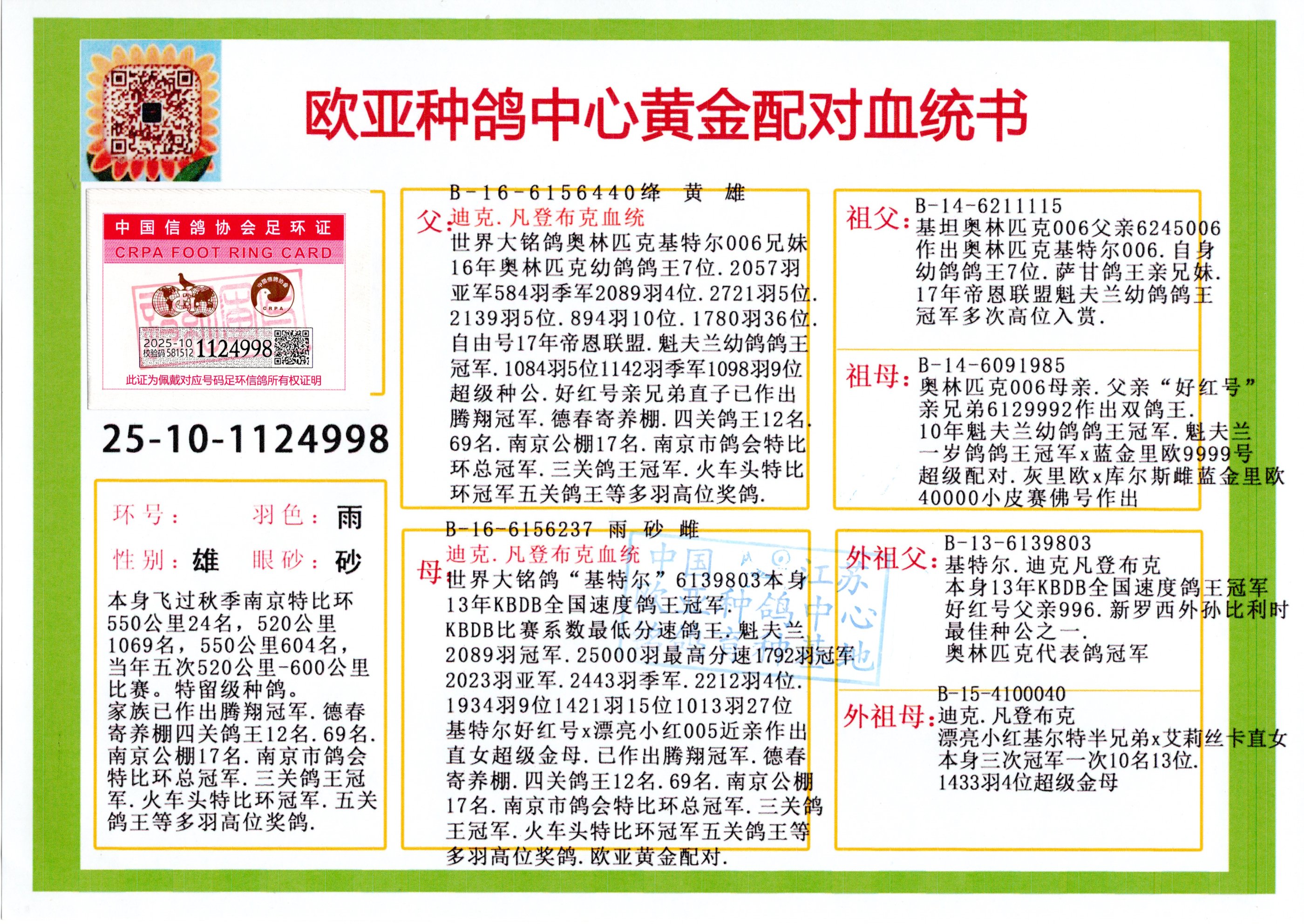 24年秋南京特比环欧亚荣获大团体冠军.小团体冠军551公里大特比13名.14名.16名.19名.20名.21名.24名.26名.27名.28名.42名.52名.54名.57名.65名.66名.68名.70名.71名.72名.74名.76名.80名.82名.83名.84名.85名.86名.90名.92名.110名.116名.121名.122名.128名.131名.158名.161名.164名.165名.166名.172名.174名.177名.182名.195名.196名.201名.205名.208名.210名.216名.253名.269名.275名.276名.294名.296名.299名,,24年秋云南天南铜都公棚决赛415名.天南铜都小棚决赛409名.云南玉活公棚决赛102名.490名.团体32名上笼二羽进二羽,天南铜都大棚506公里决赛445名。热烈祝贺河北省巨鹿县李兰生老师用欧亚泰山号血系连续十一年夺冠军,河北省国家赛冠军.全国季军等多次前十名高位,扬州王军王总用欧亚利奥24年春季获山东翔宇公棚决赛33名盖比53名。南京刘正龙刘总用欧亚盖比获得24年秋山东潍坊国际公棚决赛42名.精英赛30名.三关鸽王71名.决赛86名.加站赛16名.南京市特比环A组鸽王9名.B组鸽王5名.6名.C组鸽王5名.精英赛冠军4名.技能赛A组冠军4名.5名.秦淮区特比环荣获15名.46名.48名.87名。四川西昌徐亮徐总用欧亚利奥获得凉山州聚友决赛177名.第二关亚军双关鸽王19名.三关鸽王105名.云南豪庭公棚决赛603名。热烈祝贺24年四川重庆翔园鸽舍用欧亚泰山号荣获春季400公里冠军.秋季500公里冠军,河北王总用詹森X利奥获得千羽千翔公棚400公里冠军,广东蔡楷焕荣获24年秋爱好者 赛鸽俱乐部三关鸽王季军.一关420公里99名.二关450公里11名.三关520公里32名.单关季军.7名.12名,江西李卫兴荣获贵州红枫公棚8名.共翔俱乐部寄养棚四关综合鸽王30名.一关400公里78名.二关500公里55名.三关520公里37名.四关500公里57名.同父母获公棚18名.雷鸣获得武汉黄浦育翔中心冠军,四川陈文获得四川明鸿俱乐部300公里梦幻2名.3名.4名.9名.10名.13名.14名.15名.31名.34名.40名.41名.42名.43名.69名.71名.72名.73名.74名.94名.95名.97名.98名.99名.419公里决赛荣获总冠军7名.总共归巢9羽,四川徐亮获豪庭决赛603名,山西郑勇获得山西泰鑫公棚决赛255名詹森红狐,热烈祝贺马总获得开尔(飞跃队)决赛9名获奖金1310000万元.第一关52名,天津津福资赛180公里96名.获奖金429543万元,欧亚支持全国鸽友24年秋多人报喜 祝大家取得更好成绩,给欧亚报喜鸽友欧亚决定给每人赠送一羽超级种鸽。欧亚俱乐部特比环多关鸽王成绩:15年秋淮安特比环黑色星期一全会上笼9700多羽,当天无鸽归巢,第二天全会归巢357羽,本舍归巢158羽.前十名八羽.前一百名归巢57羽,16年春季获五关鸽王总冠军,总亚军四名.六名.七名.九名.十名.晶艺俱乐部520公里冠亚季军5名.6名.7名.9名.11名等,火车头冠军.季军6名.8名.9名.10名,16年秋晶艺俱乐部特比环520公里亚军.季军4名.6名.7名.9名,15年春南京白下特比环冠军.亚军.季军6名.7名.8名.9名.10名.指定鸽A B组获得冠军.亚军.季军4名.5名.,17年淮安特比环亚军.4名.5名.7名.8名.10名.六关鸽王总冠军.4名.6名.9名.10名,寄养棚宿迁刘总20羽特比环获冠军.季军.4名.7名.8名.9名等。18年荣获万羽特比环六关鸽王总冠军.总亚军.总季军.6名.8名.十名.单关四羽冠军.二羽亚军.四羽季军.前十名27羽。19年秋万羽特比环六关鸽王总亚军.总季军.5名.8名等,单关二羽冠军.三羽亚军.一羽季军前十名31羽。20年秋淮安市鸽会四关特比环大赛风雨无阻鸽王亚军.鸽王六名,金品俱乐部万羽特比环六关鸽王总冠军,总亚军.四名.五名.六名.七名.八名.十名.前二百名鸽王35羽,单关冠亚季军前十名四十多羽,火车头五关鸽王季军.六名.八名.前二百名鸽王十七羽。20年春荣获淮安五区一市四关鸽王总冠军.亚军.四名.八名.九名。21年秋荣获金品万羽特比环大赛六关鸽王总亚军.总季军.四名.七名.九名.十名.单关冠亚军季军前十名三十多羽。火车头协会鸽王六名.七名.十名.单关前十名十七羽。22年秋荣获鸽王总冠军.总亚军.5名.7名.8名.9名.11名.单关冠亚季军前十名三十多羽,第一关单关前二百名四十多羽,第二关前二百名三十多羽,第三关前二百名四十多羽,第四关前二百名四十多羽,第五关前一百名53羽。23年秋荣获鸽王季军.五名.八名.十名.13名.17名.20名.27名等多羽鸽王.单关前十名二十多羽。公棚.寄养棚部分成绩:16年秋宁夏黄河公棚总冠军电脑戈马力指定通炮冠军,17年送八羽参赛获得鸽王八名进奖四名,支持韩总荣获八名。支持鸽友荣获宁夏中卫公棚决赛总冠军.精英赛冠军,支持18年宁夏黄河公棚决赛冠军詹森X泰山。安徽鼎博寄养棚院内外四关鸽王总冠军.鸽王十七名.三十七名同窝,鸽王39名.42名.58名.67名。18年山东公棚预赛冠军.决赛65名.送八羽进奖五羽.指定获奔驰汽车一辆。支持鸽友获得云南蓝云公棚冠军.盖比X佛卡门。支持鸽友荣获云南银集公棚决赛冠军 詹森427X520血系 速度赛6700羽冠军。17年荣获金马俱乐部寄养棚四关鸽王总冠军.季军.六名.八名.第一关冠军.亚军.季军四名.七名.十一名.金牌教练奖。支持鸽友18年北京费翔公棚预赛九名电脑X桑杰士,支持鸽友荣获陕西威力公棚决赛11名.内蒙古临河寄养棚四关鸽王六名.詹森配泰山,支持河北王总用欧亚詹森427配胡本喜获20年秋开尔青年棚季军。云南东荣公棚16年预赛冠军.决赛77名.17年决赛12名.詹森红狐X泰山,17年平安公棚决赛4名 詹森427。欧亚获得21年金母寄养棚第一关四名.第二关5名.第三关5名.6名.7名.10名.三关鸽王总冠军,四关鸽王14名.十羽鸽王。支持河