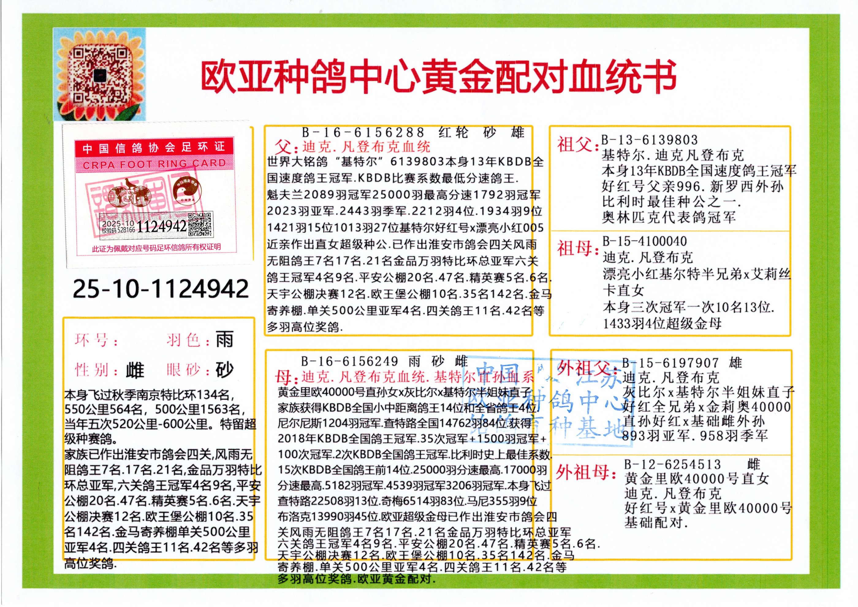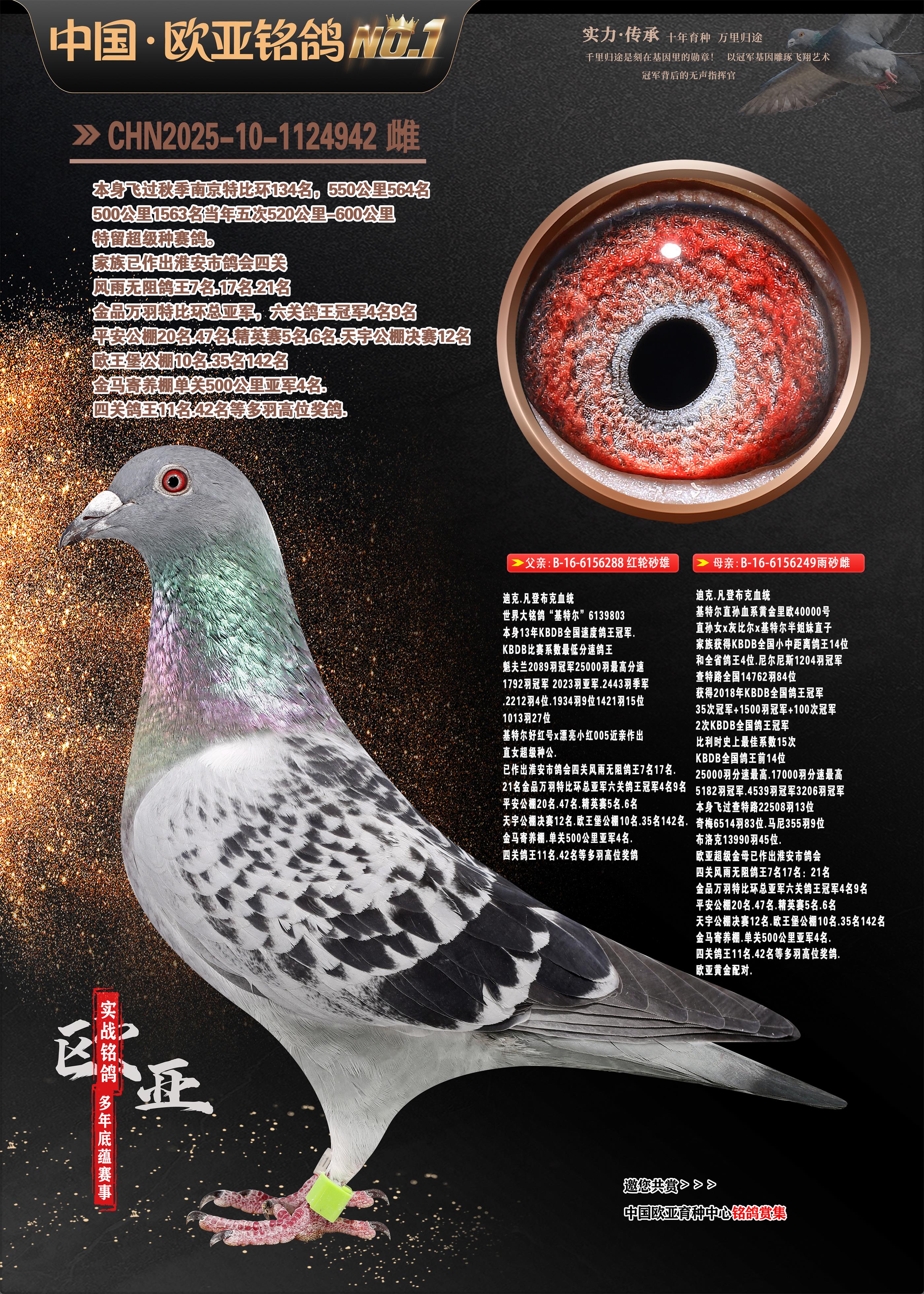 24年秋南京特比环欧亚荣获大团体冠军.小团体冠军551公里大特比13名.14名.16名.19名.20名.21名.24名.26名.27名.28名.42名.52名.54名.57名.65名.66名.68名.70名.71名.72名.74名.76名.80名.82名.83名.84名.85名.86名.90名.92名.110名.116名.121名.122名.128名.131名.158名.161名.164名.165名.166名.172名.174名.177名.182名.195名.196名.201名.205名.208名.210名.216名.253名.269名.275名.276名.294名.296名.299名,,24年秋云南天南铜都公棚决赛415名.天南铜都小棚决赛409名.云南玉活公棚决赛102名.490名.团体32名上笼二羽进二羽,天南铜都大棚506公里决赛445名。热烈祝贺河北省巨鹿县李兰生老师用欧亚泰山号血系连续十一年夺冠军,河北省国家赛冠军.全国季军等多次前十名高位,扬州王军王总用欧亚利奥24年春季获山东翔宇公棚决赛33名盖比53名。南京刘正龙刘总用欧亚盖比获得24年秋山东潍坊国际公棚决赛42名.精英赛30名.三关鸽王71名.决赛86名.加站赛16名.南京市特比环A组鸽王9名.B组鸽王5名.6名.C组鸽王5名.精英赛冠军4名.技能赛A组冠军4名.5名.秦淮区特比环荣获15名.46名.48名.87名。四川西昌徐亮徐总用欧亚利奥获得凉山州聚友决赛177名.第二关亚军双关鸽王19名.三关鸽王105名.云南豪庭公棚决赛603名。热烈祝贺24年四川重庆翔园鸽舍用欧亚泰山号荣获春季400公里冠军.秋季500公里冠军,河北王总用詹森X利奥获得千羽千翔公棚400公里冠军,广东蔡楷焕荣获24年秋爱好者 赛鸽俱乐部三关鸽王季军.一关420公里99名.二关450公里11名.三关520公里32名.单关季军.7名.12名,江西李卫兴荣获贵州红枫公棚8名.共翔俱乐部寄养棚四关综合鸽王30名.一关400公里78名.二关500公里55名.三关520公里37名.四关500公里57名.同父母获公棚18名.雷鸣获得武汉黄浦育翔中心冠军,四川陈文获得四川明鸿俱乐部300公里梦幻2名.3名.4名.9名.10名.13名.14名.15名.31名.34名.40名.41名.42名.43名.69名.71名.72名.73名.74名.94名.95名.97名.98名.99名.419公里决赛荣获总冠军7名.总共归巢9羽,四川徐亮获豪庭决赛603名,山西郑勇获得山西泰鑫公棚决赛255名詹森红狐,热烈祝贺马总获得开尔(飞跃队)决赛9名获奖金1310000万元.第一关52名,天津津福资赛180公里96名.获奖金429543万元,欧亚支持全国鸽友24年秋多人报喜 祝大家取得更好成绩,给欧亚报喜鸽友欧亚决定给每人赠送一羽超级种鸽。欧亚俱乐部特比环多关鸽王成绩:15年秋淮安特比环黑色星期一全会上笼9700多羽,当天无鸽归巢,第二天全会归巢357羽,本舍归巢158羽.前十名八羽.前一百名归巢57羽,16年春季获五关鸽王总冠军,总亚军四名.六名.七名.九名.十名.晶艺俱乐部520公里冠亚季军5名.6名.7名.9名.11名等,火车头冠军.季军6名.8名.9名.10名,16年秋晶艺俱乐部特比环520公里亚军.季军4名.6名.7名.9名,15年春南京白下特比环冠军.亚军.季军6名.7名.8名.9名.10名.指定鸽A B组获得冠军.亚军.季军4名.5名.,17年淮安特比环亚军.4名.5名.7名.8名.10名.六关鸽王总冠军.4名.6名.9名.10名,寄养棚宿迁刘总20羽特比环获冠军.季军.4名.7名.8名.9名等。18年荣获万羽特比环六关鸽王总冠军.总亚军.总季军.6名.8名.十名.单关四羽冠军.二羽亚军.四羽季军.前十名27羽。19年秋万羽特比环六关鸽王总亚军.总季军.5名.8名等,单关二羽冠军.三羽亚军.一羽季军前十名31羽。20年秋淮安市鸽会四关特比环大赛风雨无阻鸽王亚军.鸽王六名,金品俱乐部万羽特比环六关鸽王总冠军,总亚军.四名.五名.六名.七名.八名.十名.前二百名鸽王35羽,单关冠亚季军前十名四十多羽,火车头五关鸽王季军.六名.八名.前二百名鸽王十七羽。20年春荣获淮安五区一市四关鸽王总冠军.亚军.四名.八名.九名。21年秋荣获金品万羽特比环大赛六关鸽王总亚军.总季军.四名.七名.九名.十名.单关冠亚军季军前十名三十多羽。火车头协会鸽王六名.七名.十名.单关前十名十七羽。22年秋荣获鸽王总冠军.总亚军.5名.7名.8名.9名.11名.单关冠亚季军前十名三十多羽,第一关单关前二百名四十多羽,第二关前二百名三十多羽,第三关前二百名四十多羽,第四关前二百名四十多羽,第五关前一百名53羽。23年秋荣获鸽王季军.五名.八名.十名.13名.17名.20名.27名等多羽鸽王.单关前十名二十多羽。公棚.寄养棚部分成绩:16年秋宁夏黄河公棚总冠军电脑戈马力指定通炮冠军,17年送八羽参赛获得鸽王八名进奖四名,支持韩总荣获八名。支持鸽友荣获宁夏中卫公棚决赛总冠军.精英赛冠军,支持18年宁夏黄河公棚决赛冠军詹森X泰山。安徽鼎博寄养棚院内外四关鸽王总冠军.鸽王十七名.三十七名同窝,鸽王39名.42名.58名.67名。18年山东公棚预赛冠军.决赛65名.送八羽进奖五羽.指定获奔驰汽车一辆。支持鸽友获得云南蓝云公棚冠军.盖比X佛卡门。支持鸽友荣获云南银集公棚决赛冠军 詹森427X520血系 速度赛6700羽冠军。17年荣获金马俱乐部寄养棚四关鸽王总冠军.季军.六名.八名.第一关冠军.亚军.季军四名.七名.十一名.金牌教练奖。支持鸽友18年北京费翔公棚预赛九名电脑X桑杰士,支持鸽友荣获陕西威力公棚决赛11名.内蒙古临河寄养棚四关鸽王六名.詹森配泰山,支持河北王总用欧亚詹森427配胡本喜获20年秋开尔青年棚季军。云南东荣公棚16年预赛冠军.决赛77名.17年决赛12名.詹森红狐X泰山,17年平安公棚决赛4名 詹森427。欧亚获得21年金母寄养棚第一关四名.第二关5名.第三关5名.6名.7名.10名.三关鸽王总冠军,四关鸽王14名.十羽鸽王。支持河