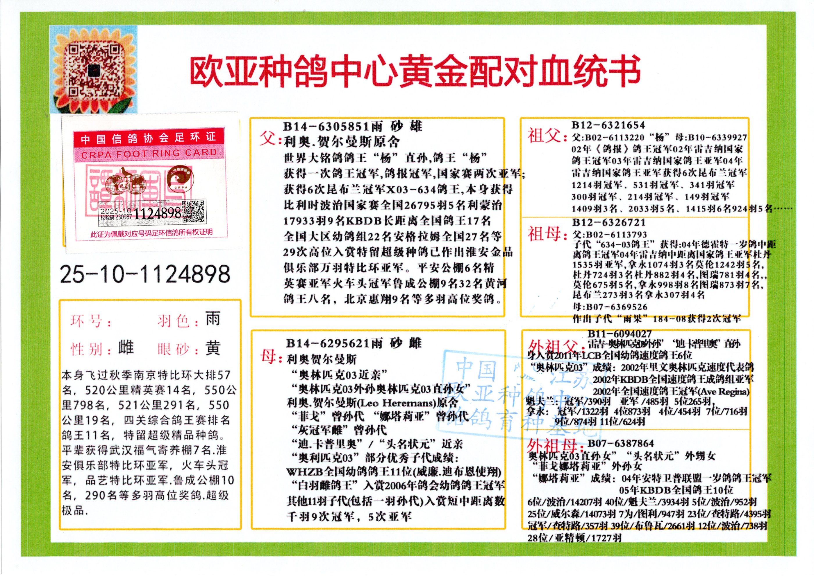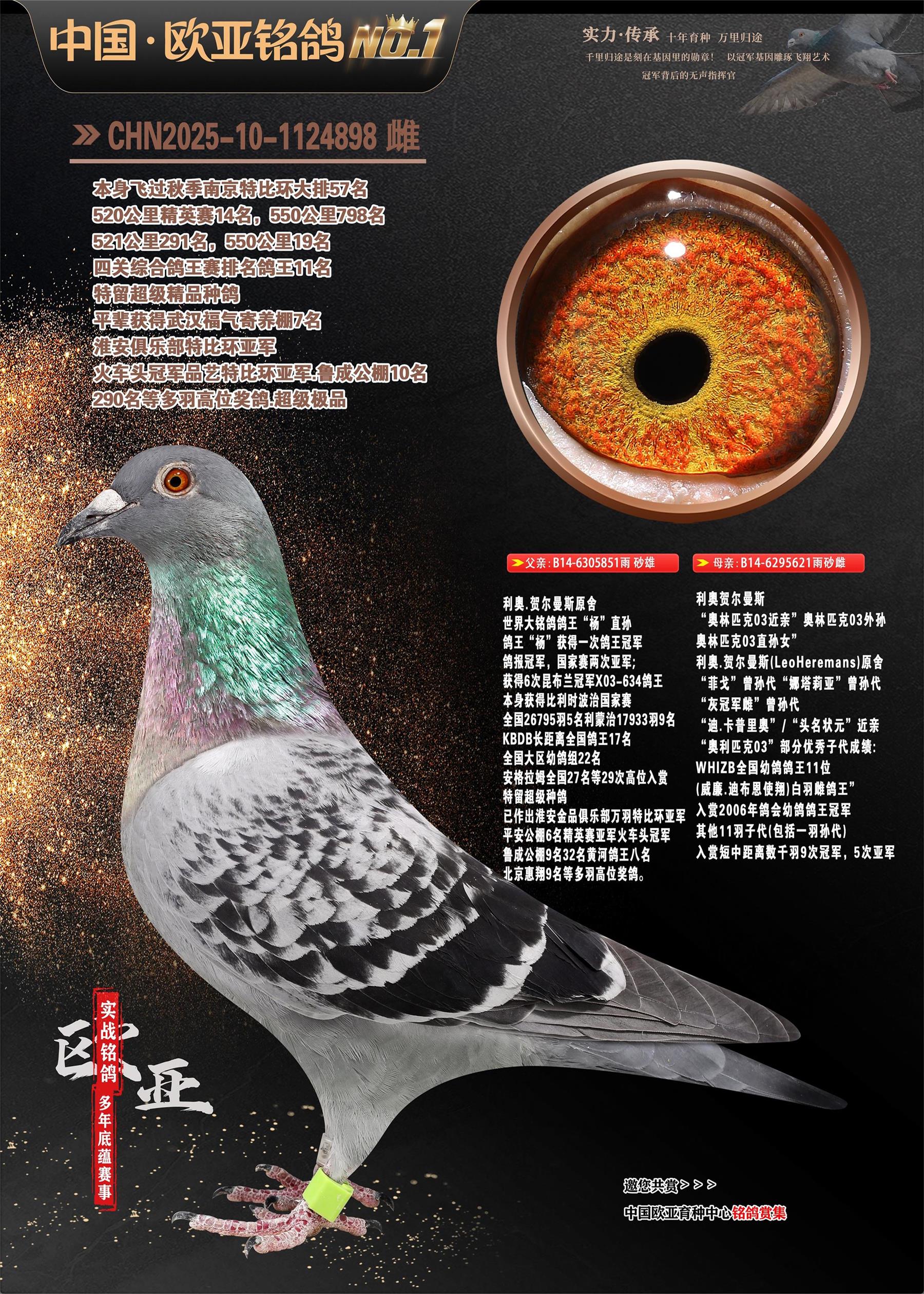 24年秋南京特比环欧亚荣获大团体冠军.小团体冠军551公里大特比13名.14名.16名.19名.20名.21名.24名.26名.27名.28名.42名.52名.54名.57名.65名.66名.68名.70名.71名.72名.74名.76名.80名.82名.83名.84名.85名.86名.90名.92名.110名.116名.121名.122名.128名.131名.158名.161名.164名.165名.166名.172名.174名.177名.182名.195名.196名.201名.205名.208名.210名.216名.253名.269名.275名.276名.294名.296名.299名,,24年秋云南天南铜都公棚决赛415名.天南铜都小棚决赛409名.云南玉活公棚决赛102名.490名.团体32名上笼二羽进二羽,天南铜都大棚506公里决赛445名。热烈祝贺河北省巨鹿县李兰生老师用欧亚泰山号血系连续十一年夺冠军,河北省国家赛冠军.全国季军等多次前十名高位,扬州王军王总用欧亚利奥24年春季获山东翔宇公棚决赛33名盖比53名。南京刘正龙刘总用欧亚盖比获得24年秋山东潍坊国际公棚决赛42名.精英赛30名.三关鸽王71名.决赛86名.加站赛16名.南京市特比环A组鸽王9名.B组鸽王5名.6名.C组鸽王5名.精英赛冠军4名.技能赛A组冠军4名.5名.秦淮区特比环荣获15名.46名.48名.87名。四川西昌徐亮徐总用欧亚利奥获得凉山州聚友决赛177名.第二关亚军双关鸽王19名.三关鸽王105名.云南豪庭公棚决赛603名。热烈祝贺24年四川重庆翔园鸽舍用欧亚泰山号荣获春季400公里冠军.秋季500公里冠军,河北王总用詹森X利奥获得千羽千翔公棚400公里冠军,广东蔡楷焕荣获24年秋爱好者 赛鸽俱乐部三关鸽王季军.一关420公里99名.二关450公里11名.三关520公里32名.单关季军.7名.12名,江西李卫兴荣获贵州红枫公棚8名.共翔俱乐部寄养棚四关综合鸽王30名.一关400公里78名.二关500公里55名.三关520公里37名.四关500公里57名.同父母获公棚18名.雷鸣获得武汉黄浦育翔中心冠军,四川陈文获得四川明鸿俱乐部300公里梦幻2名.3名.4名.9名.10名.13名.14名.15名.31名.34名.40名.41名.42名.43名.69名.71名.72名.73名.74名.94名.95名.97名.98名.99名.419公里决赛荣获总冠军7名.总共归巢9羽,四川徐亮获豪庭决赛603名,山西郑勇获得山西泰鑫公棚决赛255名詹森红狐,热烈祝贺马总获得开尔(飞跃队)决赛9名获奖金1310000万元.第一关52名,天津津福资赛180公里96名.获奖金429543万元,欧亚支持全国鸽友24年秋多人报喜 祝大家取得更好成绩,给欧亚报喜鸽友欧亚决定给每人赠送一羽超级种鸽。欧亚俱乐部特比环多关鸽王成绩:15年秋淮安特比环黑色星期一全会上笼9700多羽,当天无鸽归巢,第二天全会归巢357羽,本舍归巢158羽.前十名八羽.前一百名归巢57羽,16年春季获五关鸽王总冠军,总亚军四名.六名.七名.九名.十名.晶艺俱乐部520公里冠亚季军5名.6名.7名.9名.11名等,火车头冠军.季军6名.8名.9名.10名,16年秋晶艺俱乐部特比环520公里亚军.季军4名.6名.7名.9名,15年春南京白下特比环冠军.亚军.季军6名.7名.8名.9名.10名.指定鸽A B组获得冠军.亚军.季军4名.5名.,17年淮安特比环亚军.4名.5名.7名.8名.10名.六关鸽王总冠军.4名.6名.9名.10名,寄养棚宿迁刘总20羽特比环获冠军.季军.4名.7名.8名.9名等。18年荣获万羽特比环六关鸽王总冠军.总亚军.总季军.6名.8名.十名.单关四羽冠军.二羽亚军.四羽季军.前十名27羽。19年秋万羽特比环六关鸽王总亚军.总季军.5名.8名等,单关二羽冠军.三羽亚军.一羽季军前十名31羽。20年秋淮安市鸽会四关特比环大赛风雨无阻鸽王亚军.鸽王六名,金品俱乐部万羽特比环六关鸽王总冠军,总亚军.四名.五名.六名.七名.八名.十名.前二百名鸽王35羽,单关冠亚季军前十名四十多羽,火车头五关鸽王季军.六名.八名.前二百名鸽王十七羽。20年春荣获淮安五区一市四关鸽王总冠军.亚军.四名.八名.九名。21年秋荣获金品万羽特比环大赛六关鸽王总亚军.总季军.四名.七名.九名.十名.单关冠亚军季军前十名三十多羽。火车头协会鸽王六名.七名.十名.单关前十名十七羽。22年秋荣获鸽王总冠军.总亚军.5名.7名.8名.9名.11名.单关冠亚季军前十名三十多羽,第一关单关前二百名四十多羽,第二关前二百名三十多羽,第三关前二百名四十多羽,第四关前二百名四十多羽,第五关前一百名53羽。23年秋荣获鸽王季军.五名.八名.十名.13名.17名.20名.27名等多羽鸽王.单关前十名二十多羽。公棚.寄养棚部分成绩:16年秋宁夏黄河公棚总冠军电脑戈马力指定通炮冠军,17年送八羽参赛获得鸽王八名进奖四名,支持韩总荣获八名。支持鸽友荣获宁夏中卫公棚决赛总冠军.精英赛冠军,支持18年宁夏黄河公棚决赛冠军詹森X泰山。安徽鼎博寄养棚院内外四关鸽王总冠军.鸽王十七名.三十七名同窝,鸽王39名.42名.58名.67名。18年山东公棚预赛冠军.决赛65名.送八羽进奖五羽.指定获奔驰汽车一辆。支持鸽友获得云南蓝云公棚冠军.盖比X佛卡门。支持鸽友荣获云南银集公棚决赛冠军 詹森427X520血系 速度赛6700羽冠军。17年荣获金马俱乐部寄养棚四关鸽王总冠军.季军.六名.八名.第一关冠军.亚军.季军四名.七名.十一名.金牌教练奖。支持鸽友18年北京费翔公棚预赛九名电脑X桑杰士,支持鸽友荣获陕西威力公棚决赛11名.内蒙古临河寄养棚四关鸽王六名.詹森配泰山,支持河北王总用欧亚詹森427配胡本喜获20年秋开尔青年棚季军。云南东荣公棚16年预赛冠军.决赛77名.17年决赛12名.詹森红狐X泰山,17年平安公棚决赛4名 詹森427。欧亚获得21年金母寄养棚第一关四名.第二关5名.第三关5名.6名.7名.10名.三关鸽王总冠军,四关鸽王14名.十羽鸽王。支持河