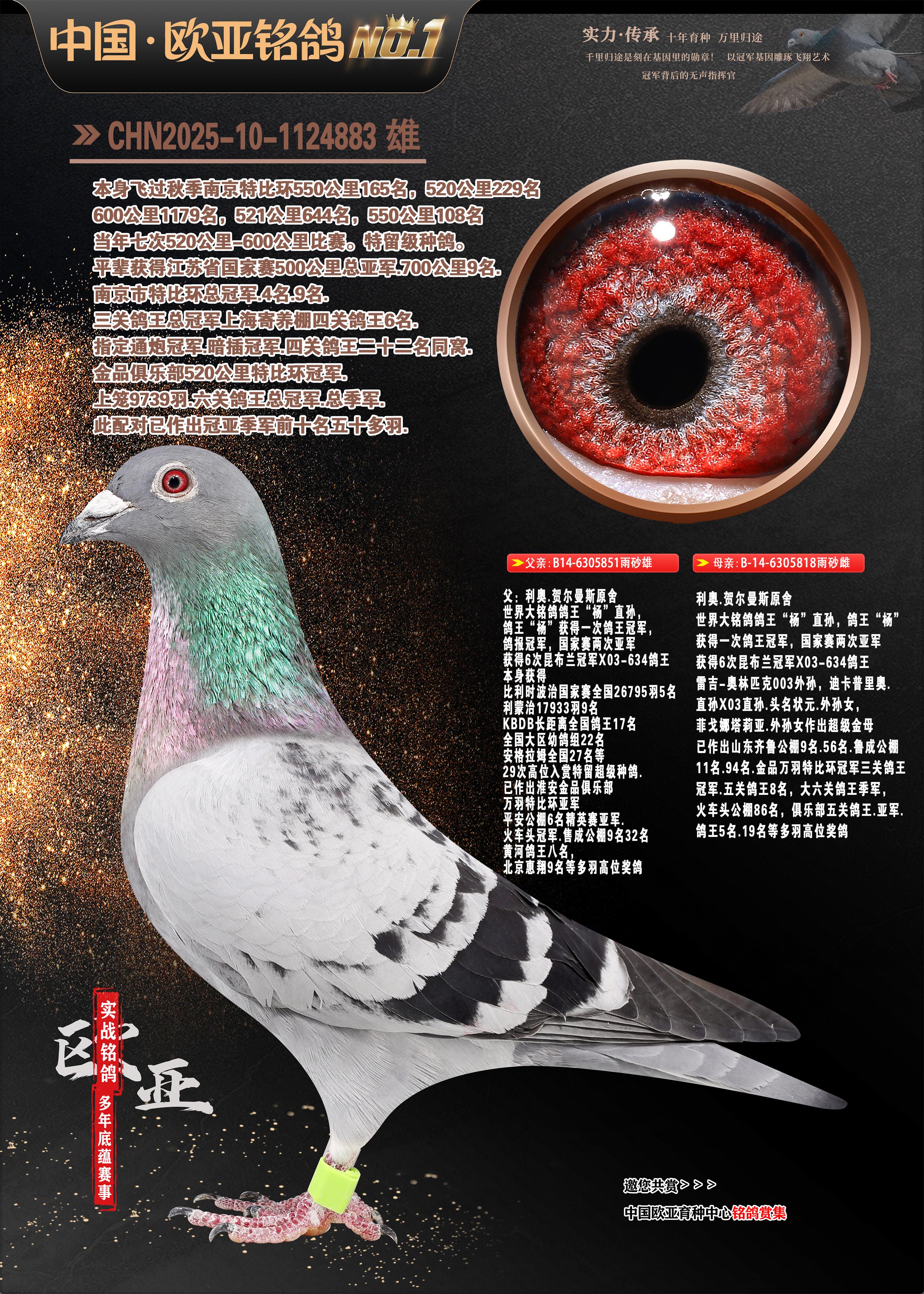 24年秋南京特比环欧亚荣获大团体冠军.小团体冠军551公里大特比13名.14名.16名.19名.20名.21名.24名.26名.27名.28名.42名.52名.54名.57名.65名.66名.68名.70名.71名.72名.74名.76名.80名.82名.83名.84名.85名.86名.90名.92名.110名.116名.121名.122名.128名.131名.158名.161名.164名.165名.166名.172名.174名.177名.182名.195名.196名.201名.205名.208名.210名.216名.253名.269名.275名.276名.294名.296名.299名,,24年秋云南天南铜都公棚决赛415名.天南铜都小棚决赛409名.云南玉活公棚决赛102名.490名.团体32名上笼二羽进二羽,天南铜都大棚506公里决赛445名。热烈祝贺河北省巨鹿县李兰生老师用欧亚泰山号血系连续十一年夺冠军,河北省国家赛冠军.全国季军等多次前十名高位,扬州王军王总用欧亚利奥24年春季获山东翔宇公棚决赛33名盖比53名。南京刘正龙刘总用欧亚盖比获得24年秋山东潍坊国际公棚决赛42名.精英赛30名.三关鸽王71名.决赛86名.加站赛16名.南京市特比环A组鸽王9名.B组鸽王5名.6名.C组鸽王5名.精英赛冠军4名.技能赛A组冠军4名.5名.秦淮区特比环荣获15名.46名.48名.87名。四川西昌徐亮徐总用欧亚利奥获得凉山州聚友决赛177名.第二关亚军双关鸽王19名.三关鸽王105名.云南豪庭公棚决赛603名。热烈祝贺24年四川重庆翔园鸽舍用欧亚泰山号荣获春季400公里冠军.秋季500公里冠军,河北王总用詹森X利奥获得千羽千翔公棚400公里冠军,广东蔡楷焕荣获24年秋爱好者 赛鸽俱乐部三关鸽王季军.一关420公里99名.二关450公里11名.三关520公里32名.单关季军.7名.12名,江西李卫兴荣获贵州红枫公棚8名.共翔俱乐部寄养棚四关综合鸽王30名.一关400公里78名.二关500公里55名.三关520公里37名.四关500公里57名.同父母获公棚18名.雷鸣获得武汉黄浦育翔中心冠军,四川陈文获得四川明鸿俱乐部300公里梦幻2名.3名.4名.9名.10名.13名.14名.15名.31名.34名.40名.41名.42名.43名.69名.71名.72名.73名.74名.94名.95名.97名.98名.99名.419公里决赛荣获总冠军7名.总共归巢9羽,四川徐亮获豪庭决赛603名,山西郑勇获得山西泰鑫公棚决赛255名詹森红狐,热烈祝贺马总获得开尔(飞跃队)决赛9名获奖金1310000万元.第一关52名,天津津福资赛180公里96名.获奖金429543万元,欧亚支持全国鸽友24年秋多人报喜 祝大家取得更好成绩,给欧亚报喜鸽友欧亚决定给每人赠送一羽超级种鸽。欧亚俱乐部特比环多关鸽王成绩:15年秋淮安特比环黑色星期一全会上笼9700多羽,当天无鸽归巢,第二天全会归巢357羽,本舍归巢158羽.前十名八羽.前一百名归巢57羽,16年春季获五关鸽王总冠军,总亚军四名.六名.七名.九名.十名.晶艺俱乐部520公里冠亚季军5名.6名.7名.9名.11名等,火车头冠军.季军6名.8名.9名.10名,16年秋晶艺俱乐部特比环520公里亚军.季军4名.6名.7名.9名,15年春南京白下特比环冠军.亚军.季军6名.7名.8名.9名.10名.指定鸽A B组获得冠军.亚军.季军4名.5名.,17年淮安特比环亚军.4名.5名.7名.8名.10名.六关鸽王总冠军.4名.6名.9名.10名,寄养棚宿迁刘总20羽特比环获冠军.季军.4名.7名.8名.9名等。18年荣获万羽特比环六关鸽王总冠军.总亚军.总季军.6名.8名.十名.单关四羽冠军.二羽亚军.四羽季军.前十名27羽。19年秋万羽特比环六关鸽王总亚军.总季军.5名.8名等,单关二羽冠军.三羽亚军.一羽季军前十名31羽。20年秋淮安市鸽会四关特比环大赛风雨无阻鸽王亚军.鸽王六名,金品俱乐部万羽特比环六关鸽王总冠军,总亚军.四名.五名.六名.七名.八名.十名.前二百名鸽王35羽,单关冠亚季军前十名四十多羽,火车头五关鸽王季军.六名.八名.前二百名鸽王十七羽。20年春荣获淮安五区一市四关鸽王总冠军.亚军.四名.八名.九名。21年秋荣获金品万羽特比环大赛六关鸽王总亚军.总季军.四名.七名.九名.十名.单关冠亚军季军前十名三十多羽。火车头协会鸽王六名.七名.十名.单关前十名十七羽。22年秋荣获鸽王总冠军.总亚军.5名.7名.8名.9名.11名.单关冠亚季军前十名三十多羽,第一关单关前二百名四十多羽,第二关前二百名三十多羽,第三关前二百名四十多羽,第四关前二百名四十多羽,第五关前一百名53羽。23年秋荣获鸽王季军.五名.八名.十名.13名.17名.20名.27名等多羽鸽王.单关前十名二十多羽。公棚.寄养棚部分成绩:16年秋宁夏黄河公棚总冠军电脑戈马力指定通炮冠军,17年送八羽参赛获得鸽王八名进奖四名,支持韩总荣获八名。支持鸽友荣获宁夏中卫公棚决赛总冠军.精英赛冠军,支持18年宁夏黄河公棚决赛冠军詹森X泰山。安徽鼎博寄养棚院内外四关鸽王总冠军.鸽王十七名.三十七名同窝,鸽王39名.42名.58名.67名。18年山东公棚预赛冠军.决赛65名.送八羽进奖五羽.指定获奔驰汽车一辆。支持鸽友获得云南蓝云公棚冠军.盖比X佛卡门。支持鸽友荣获云南银集公棚决赛冠军 詹森427X520血系 速度赛6700羽冠军。17年荣获金马俱乐部寄养棚四关鸽王总冠军.季军.六名.八名.第一关冠军.亚军.季军四名.七名.十一名.金牌教练奖。支持鸽友18年北京费翔公棚预赛九名电脑X桑杰士,支持鸽友荣获陕西威力公棚决赛11名.内蒙古临河寄养棚四关鸽王六名.詹森配泰山,支持河北王总用欧亚詹森427配胡本喜获20年秋开尔青年棚季军。云南东荣公棚16年预赛冠军.决赛77名.17年决赛12名.詹森红狐X泰山,17年平安公棚决赛4名 詹森427。欧亚获得21年金母寄养棚第一关四名.第二关5名.第三关5名.6名.7名.10名.三关鸽王总冠军,四关鸽王14名.十羽鸽王。支持河