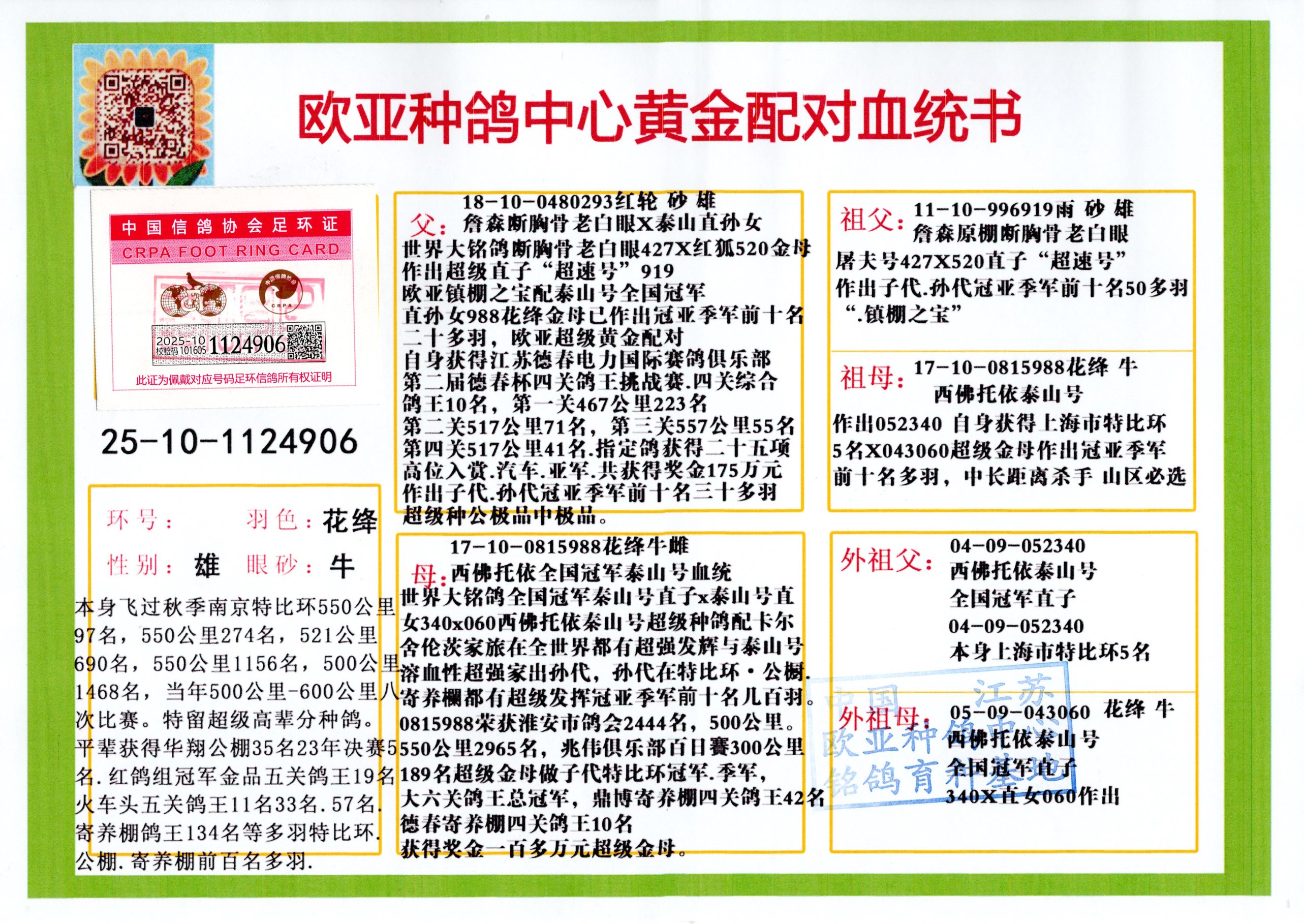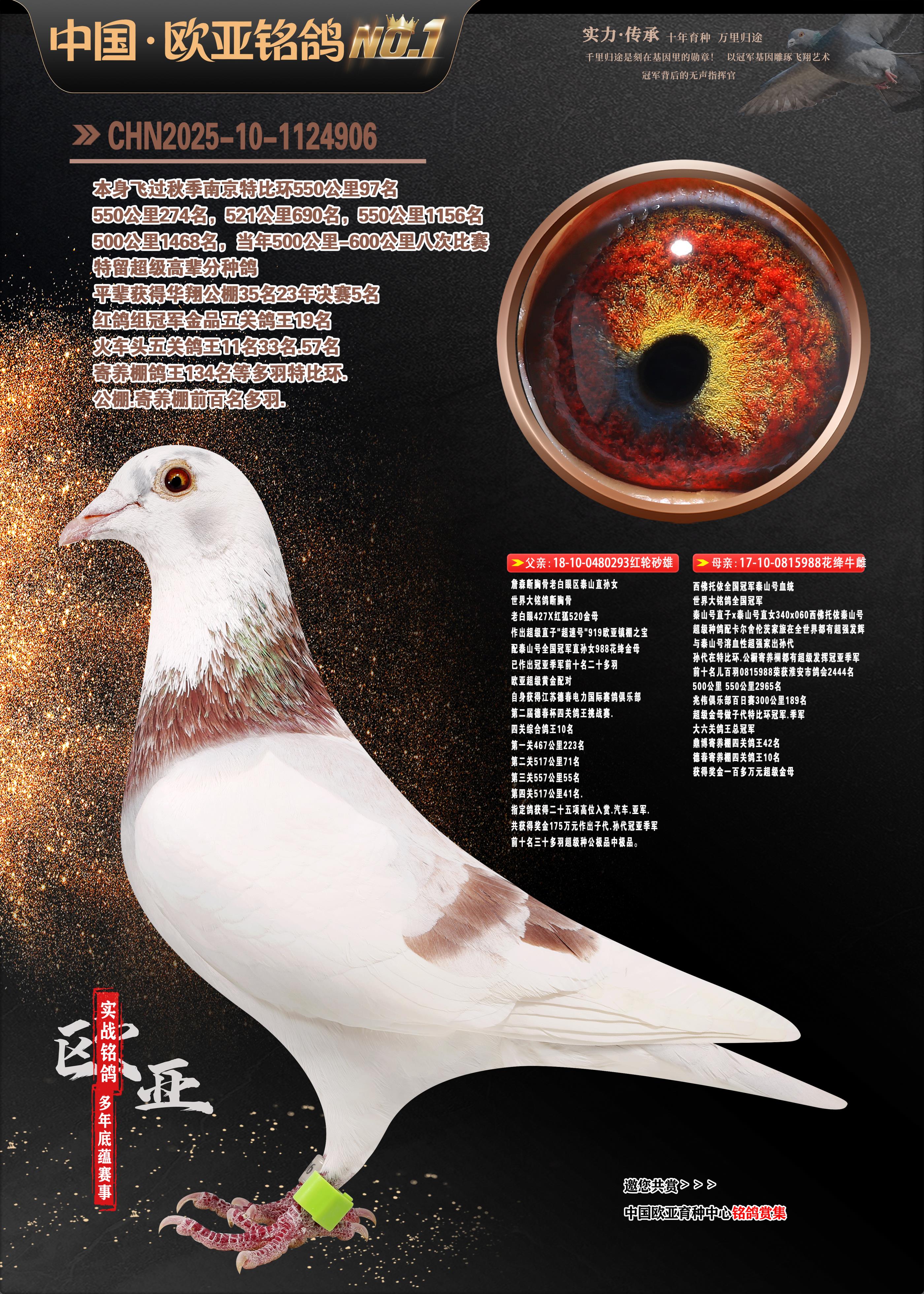 24年秋南京特比环欧亚荣获大团体冠军.小团体冠军551公里大特比13名.14名.16名.19名.20名.21名.24名.26名.27名.28名.42名.52名.54名.57名.65名.66名.68名.70名.71名.72名.74名.76名.80名.82名.83名.84名.85名.86名.90名.92名.110名.116名.121名.122名.128名.131名.158名.161名.164名.165名.166名.172名.174名.177名.182名.195名.196名.201名.205名.208名.210名.216名.253名.269名.275名.276名.294名.296名.299名,,24年秋云南天南铜都公棚决赛415名.天南铜都小棚决赛409名.云南玉活公棚决赛102名.490名.团体32名上笼二羽进二羽,天南铜都大棚506公里决赛445名。热烈祝贺河北省巨鹿县李兰生老师用欧亚泰山号血系连续十一年夺冠军,河北省国家赛冠军.全国季军等多次前十名高位,扬州王军王总用欧亚利奥24年春季获山东翔宇公棚决赛33名盖比53名。南京刘正龙刘总用欧亚盖比获得24年秋山东潍坊国际公棚决赛42名.精英赛30名.三关鸽王71名.决赛86名.加站赛16名.南京市特比环A组鸽王9名.B组鸽王5名.6名.C组鸽王5名.精英赛冠军4名.技能赛A组冠军4名.5名.秦淮区特比环荣获15名.46名.48名.87名。四川西昌徐亮徐总用欧亚利奥获得凉山州聚友决赛177名.第二关亚军双关鸽王19名.三关鸽王105名.云南豪庭公棚决赛603名。热烈祝贺24年四川重庆翔园鸽舍用欧亚泰山号荣获春季400公里冠军.秋季500公里冠军,河北王总用詹森X利奥获得千羽千翔公棚400公里冠军,广东蔡楷焕荣获24年秋爱好者 赛鸽俱乐部三关鸽王季军.一关420公里99名.二关450公里11名.三关520公里32名.单关季军.7名.12名,江西李卫兴荣获贵州红枫公棚8名.共翔俱乐部寄养棚四关综合鸽王30名.一关400公里78名.二关500公里55名.三关520公里37名.四关500公里57名.同父母获公棚18名.雷鸣获得武汉黄浦育翔中心冠军,四川陈文获得四川明鸿俱乐部300公里梦幻2名.3名.4名.9名.10名.13名.14名.15名.31名.34名.40名.41名.42名.43名.69名.71名.72名.73名.74名.94名.95名.97名.98名.99名.419公里决赛荣获总冠军7名.总共归巢9羽,四川徐亮获豪庭决赛603名,山西郑勇获得山西泰鑫公棚决赛255名詹森红狐,热烈祝贺马总获得开尔(飞跃队)决赛9名获奖金1310000万元.第一关52名,天津津福资赛180公里96名.获奖金429543万元,欧亚支持全国鸽友24年秋多人报喜 祝大家取得更好成绩,给欧亚报喜鸽友欧亚决定给每人赠送一羽超级种鸽。欧亚俱乐部特比环多关鸽王成绩:15年秋淮安特比环黑色星期一全会上笼9700多羽,当天无鸽归巢,第二天全会归巢357羽,本舍归巢158羽.前十名八羽.前一百名归巢57羽,16年春季获五关鸽王总冠军,总亚军四名.六名.七名.九名.十名.晶艺俱乐部520公里冠亚季军5名.6名.7名.9名.11名等,火车头冠军.季军6名.8名.9名.10名,16年秋晶艺俱乐部特比环520公里亚军.季军4名.6名.7名.9名,15年春南京白下特比环冠军.亚军.季军6名.7名.8名.9名.10名.指定鸽A B组获得冠军.亚军.季军4名.5名.,17年淮安特比环亚军.4名.5名.7名.8名.10名.六关鸽王总冠军.4名.6名.9名.10名,寄养棚宿迁刘总20羽特比环获冠军.季军.4名.7名.8名.9名等。18年荣获万羽特比环六关鸽王总冠军.总亚军.总季军.6名.8名.十名.单关四羽冠军.二羽亚军.四羽季军.前十名27羽。19年秋万羽特比环六关鸽王总亚军.总季军.5名.8名等,单关二羽冠军.三羽亚军.一羽季军前十名31羽。20年秋淮安市鸽会四关特比环大赛风雨无阻鸽王亚军.鸽王六名,金品俱乐部万羽特比环六关鸽王总冠军,总亚军.四名.五名.六名.七名.八名.十名.前二百名鸽王35羽,单关冠亚季军前十名四十多羽,火车头五关鸽王季军.六名.八名.前二百名鸽王十七羽。20年春荣获淮安五区一市四关鸽王总冠军.亚军.四名.八名.九名。21年秋荣获金品万羽特比环大赛六关鸽王总亚军.总季军.四名.七名.九名.十名.单关冠亚军季军前十名三十多羽。火车头协会鸽王六名.七名.十名.单关前十名十七羽。22年秋荣获鸽王总冠军.总亚军.5名.7名.8名.9名.11名.单关冠亚季军前十名三十多羽,第一关单关前二百名四十多羽,第二关前二百名三十多羽,第三关前二百名四十多羽,第四关前二百名四十多羽,第五关前一百名53羽。23年秋荣获鸽王季军.五名.八名.十名.13名.17名.20名.27名等多羽鸽王.单关前十名二十多羽。公棚.寄养棚部分成绩:16年秋宁夏黄河公棚总冠军电脑戈马力指定通炮冠军,17年送八羽参赛获得鸽王八名进奖四名,支持韩总荣获八名。支持鸽友荣获宁夏中卫公棚决赛总冠军.精英赛冠军,支持18年宁夏黄河公棚决赛冠军詹森X泰山。安徽鼎博寄养棚院内外四关鸽王总冠军.鸽王十七名.三十七名同窝,鸽王39名.42名.58名.67名。18年山东公棚预赛冠军.决赛65名.送八羽进奖五羽.指定获奔驰汽车一辆。支持鸽友获得云南蓝云公棚冠军.盖比X佛卡门。支持鸽友荣获云南银集公棚决赛冠军 詹森427X520血系 速度赛6700羽冠军。17年荣获金马俱乐部寄养棚四关鸽王总冠军.季军.六名.八名.第一关冠军.亚军.季军四名.七名.十一名.金牌教练奖。支持鸽友18年北京费翔公棚预赛九名电脑X桑杰士,支持鸽友荣获陕西威力公棚决赛11名.内蒙古临河寄养棚四关鸽王六名.詹森配泰山,支持河北王总用欧亚詹森427配胡本喜获20年秋开尔青年棚季军。云南东荣公棚16年预赛冠军.决赛77名.17年决赛12名.詹森红狐X泰山,17年平安公棚决赛4名 詹森427。欧亚获得21年金母寄养棚第一关四名.第二关5名.第三关5名.6名.7名.10名.三关鸽王总冠军,四关鸽王14名.十羽鸽王。支持河