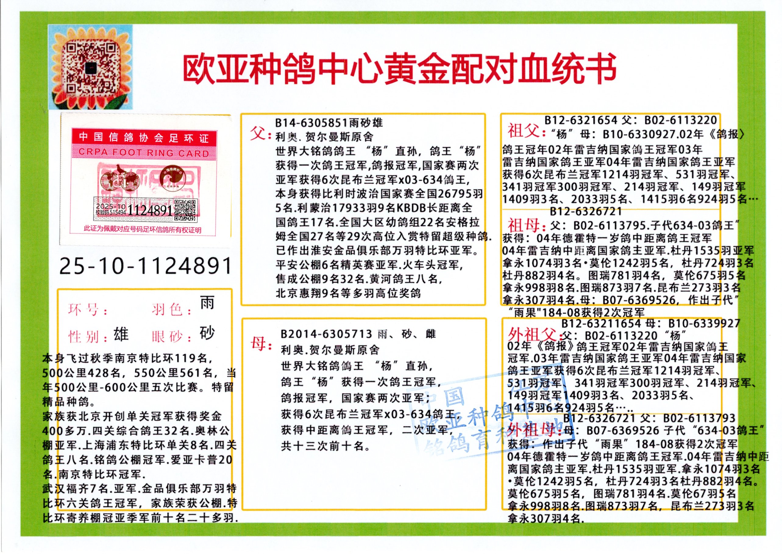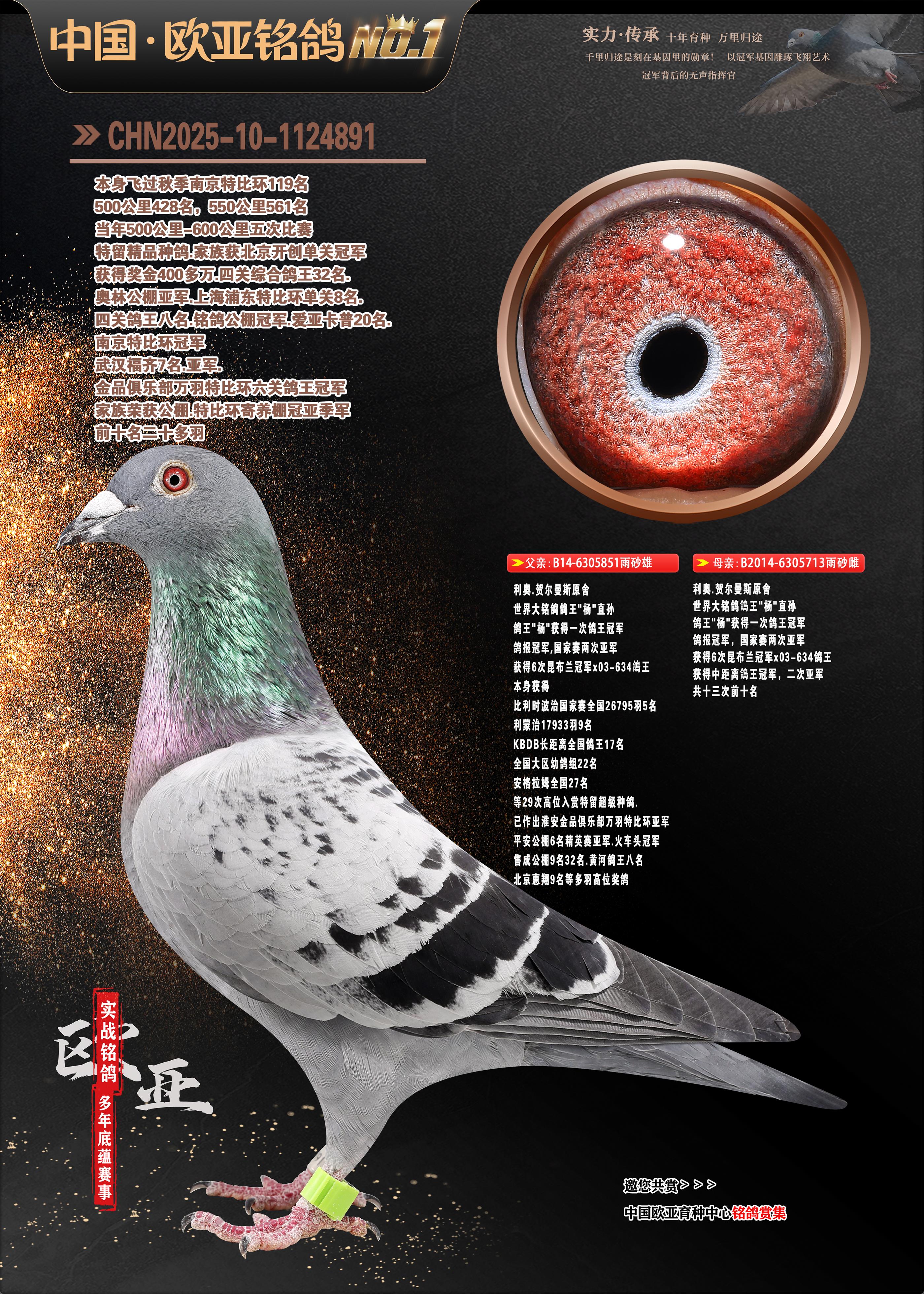24年秋南京特比环欧亚荣获大团体冠军.小团体冠军551公里大特比13名.14名.16名.19名.20名.21名.24名.26名.27名.28名.42名.52名.54名.57名.65名.66名.68名.70名.71名.72名.74名.76名.80名.82名.83名.84名.85名.86名.90名.92名.110名.116名.121名.122名.128名.131名.158名.161名.164名.165名.166名.172名.174名.177名.182名.195名.196名.201名.205名.208名.210名.216名.253名.269名.275名.276名.294名.296名.299名,,24年秋云南天南铜都公棚决赛415名.天南铜都小棚决赛409名.云南玉活公棚决赛102名.490名.团体32名上笼二羽进二羽,天南铜都大棚506公里决赛445名。热烈祝贺河北省巨鹿县李兰生老师用欧亚泰山号血系连续十一年夺冠军,河北省国家赛冠军.全国季军等多次前十名高位,扬州王军王总用欧亚利奥24年春季获山东翔宇公棚决赛33名盖比53名。南京刘正龙刘总用欧亚盖比获得24年秋山东潍坊国际公棚决赛42名.精英赛30名.三关鸽王71名.决赛86名.加站赛16名.南京市特比环A组鸽王9名.B组鸽王5名.6名.C组鸽王5名.精英赛冠军4名.技能赛A组冠军4名.5名.秦淮区特比环荣获15名.46名.48名.87名。四川西昌徐亮徐总用欧亚利奥获得凉山州聚友决赛177名.第二关亚军双关鸽王19名.三关鸽王105名.云南豪庭公棚决赛603名。热烈祝贺24年四川重庆翔园鸽舍用欧亚泰山号荣获春季400公里冠军.秋季500公里冠军,河北王总用詹森X利奥获得千羽千翔公棚400公里冠军,广东蔡楷焕荣获24年秋爱好者 赛鸽俱乐部三关鸽王季军.一关420公里99名.二关450公里11名.三关520公里32名.单关季军.7名.12名,江西李卫兴荣获贵州红枫公棚8名.共翔俱乐部寄养棚四关综合鸽王30名.一关400公里78名.二关500公里55名.三关520公里37名.四关500公里57名.同父母获公棚18名.雷鸣获得武汉黄浦育翔中心冠军,四川陈文获得四川明鸿俱乐部300公里梦幻2名.3名.4名.9名.10名.13名.14名.15名.31名.34名.40名.41名.42名.43名.69名.71名.72名.73名.74名.94名.95名.97名.98名.99名.419公里决赛荣获总冠军7名.总共归巢9羽,四川徐亮获豪庭决赛603名,山西郑勇获得山西泰鑫公棚决赛255名詹森红狐,热烈祝贺马总获得开尔(飞跃队)决赛9名获奖金1310000万元.第一关52名,天津津福资赛180公里96名.获奖金429543万元,欧亚支持全国鸽友24年秋多人报喜 祝大家取得更好成绩,给欧亚报喜鸽友欧亚决定给每人赠送一羽超级种鸽。欧亚俱乐部特比环多关鸽王成绩:15年秋淮安特比环黑色星期一全会上笼9700多羽,当天无鸽归巢,第二天全会归巢357羽,本舍归巢158羽.前十名八羽.前一百名归巢57羽,16年春季获五关鸽王总冠军,总亚军四名.六名.七名.九名.十名.晶艺俱乐部520公里冠亚季军5名.6名.7名.9名.11名等,火车头冠军.季军6名.8名.9名.10名,16年秋晶艺俱乐部特比环520公里亚军.季军4名.6名.7名.9名,15年春南京白下特比环冠军.亚军.季军6名.7名.8名.9名.10名.指定鸽A B组获得冠军.亚军.季军4名.5名.,17年淮安特比环亚军.4名.5名.7名.8名.10名.六关鸽王总冠军.4名.6名.9名.10名,寄养棚宿迁刘总20羽特比环获冠军.季军.4名.7名.8名.9名等。18年荣获万羽特比环六关鸽王总冠军.总亚军.总季军.6名.8名.十名.单关四羽冠军.二羽亚军.四羽季军.前十名27羽。19年秋万羽特比环六关鸽王总亚军.总季军.5名.8名等,单关二羽冠军.三羽亚军.一羽季军前十名31羽。20年秋淮安市鸽会四关特比环大赛风雨无阻鸽王亚军.鸽王六名,金品俱乐部万羽特比环六关鸽王总冠军,总亚军.四名.五名.六名.七名.八名.十名.前二百名鸽王35羽,单关冠亚季军前十名四十多羽,火车头五关鸽王季军.六名.八名.前二百名鸽王十七羽。20年春荣获淮安五区一市四关鸽王总冠军.亚军.四名.八名.九名。21年秋荣获金品万羽特比环大赛六关鸽王总亚军.总季军.四名.七名.九名.十名.单关冠亚军季军前十名三十多羽。火车头协会鸽王六名.七名.十名.单关前十名十七羽。22年秋荣获鸽王总冠军.总亚军.5名.7名.8名.9名.11名.单关冠亚季军前十名三十多羽,第一关单关前二百名四十多羽,第二关前二百名三十多羽,第三关前二百名四十多羽,第四关前二百名四十多羽,第五关前一百名53羽。23年秋荣获鸽王季军.五名.八名.十名.13名.17名.20名.27名等多羽鸽王.单关前十名二十多羽。公棚.寄养棚部分成绩:16年秋宁夏黄河公棚总冠军电脑戈马力指定通炮冠军,17年送八羽参赛获得鸽王八名进奖四名,支持韩总荣获八名。支持鸽友荣获宁夏中卫公棚决赛总冠军.精英赛冠军,支持18年宁夏黄河公棚决赛冠军詹森X泰山。安徽鼎博寄养棚院内外四关鸽王总冠军.鸽王十七名.三十七名同窝,鸽王39名.42名.58名.67名。18年山东公棚预赛冠军.决赛65名.送八羽进奖五羽.指定获奔驰汽车一辆。支持鸽友获得云南蓝云公棚冠军.盖比X佛卡门。支持鸽友荣获云南银集公棚决赛冠军 詹森427X520血系 速度赛6700羽冠军。17年荣获金马俱乐部寄养棚四关鸽王总冠军.季军.六名.八名.第一关冠军.亚军.季军四名.七名.十一名.金牌教练奖。支持鸽友18年北京费翔公棚预赛九名电脑X桑杰士,支持鸽友荣获陕西威力公棚决赛11名.内蒙古临河寄养棚四关鸽王六名.詹森配泰山,支持河北王总用欧亚詹森427配胡本喜获20年秋开尔青年棚季军。云南东荣公棚16年预赛冠军.决赛77名.17年决赛12名.詹森红狐X泰山,17年平安公棚决赛4名 詹森427。欧亚获得21年金母寄养棚第一关四名.第二关5名.第三关5名.6名.7名.10名.三关鸽王总冠军,四关鸽王14名.十羽鸽王。支持河