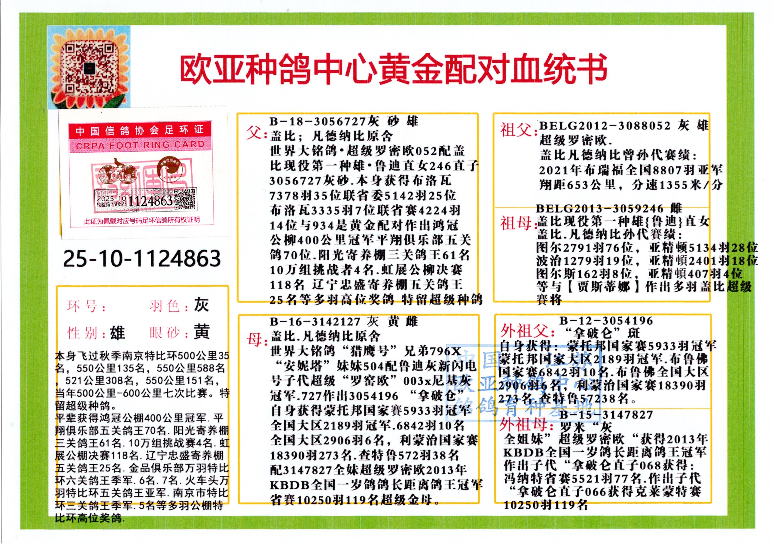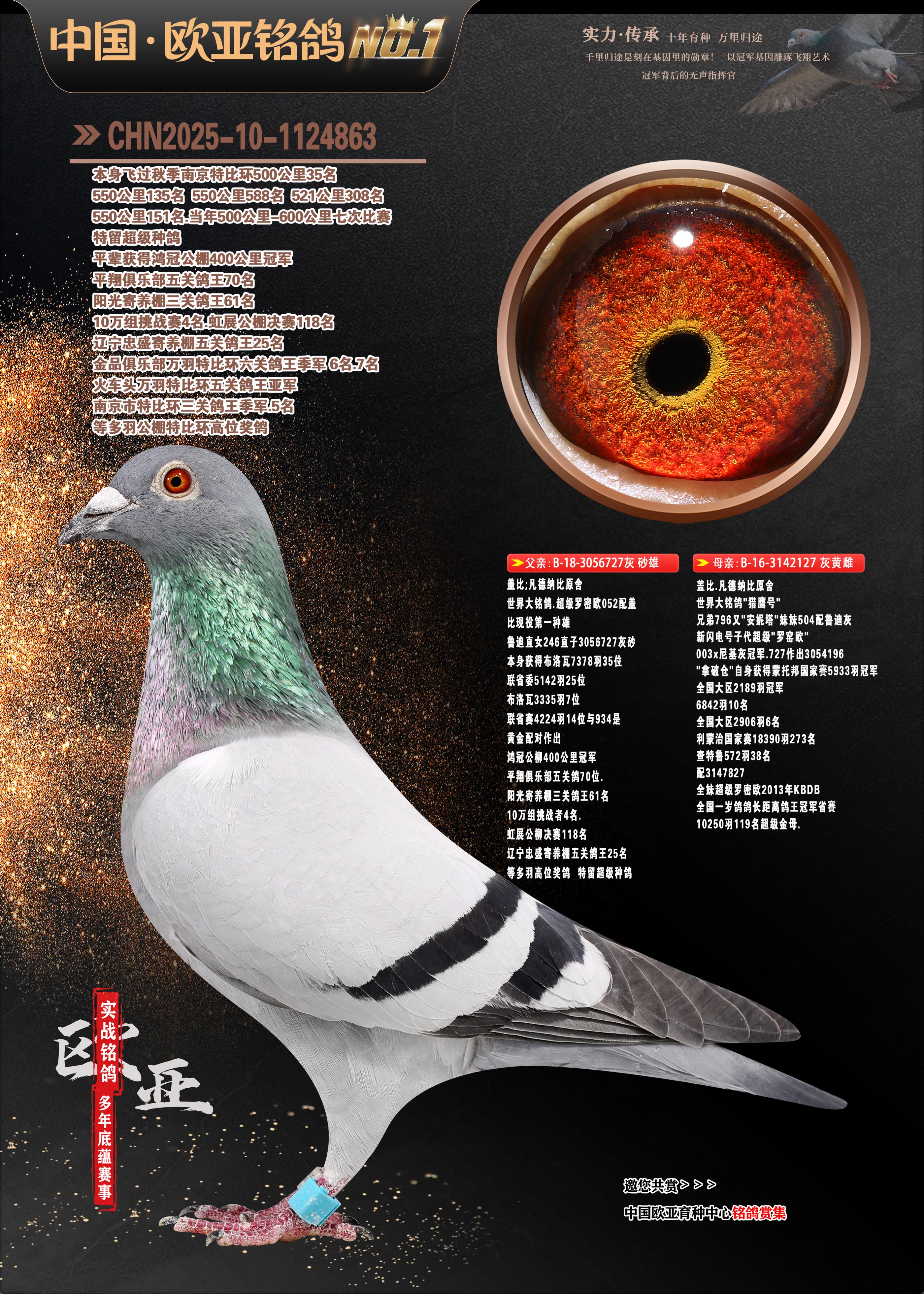 24年秋南京特比环欧亚荣获大团体冠军.小团体冠军551公里大特比13名.14名.16名.19名.20名.21名.24名.26名.27名.28名.42名.52名.54名.57名.65名.66名.68名.70名.71名.72名.74名.76名.80名.82名.83名.84名.85名.86名.90名.92名.110名.116名.121名.122名.128名.131名.158名.161名.164名.165名.166名.172名.174名.177名.182名.195名.196名.201名.205名.208名.210名.216名.253名.269名.275名.276名.294名.296名.299名,,24年秋云南天南铜都公棚决赛415名.天南铜都小棚决赛409名.云南玉活公棚决赛102名.490名.团体32名上笼二羽进二羽,天南铜都大棚506公里决赛445名。热烈祝贺河北省巨鹿县李兰生老师用欧亚泰山号血系连续十一年夺冠军,河北省国家赛冠军.全国季军等多次前十名高位,扬州王军王总用欧亚利奥24年春季获山东翔宇公棚决赛33名盖比53名。南京刘正龙刘总用欧亚盖比获得24年秋山东潍坊国际公棚决赛42名.精英赛30名.三关鸽王71名.决赛86名.加站赛16名.南京市特比环A组鸽王9名.B组鸽王5名.6名.C组鸽王5名.精英赛冠军4名.技能赛A组冠军4名.5名.秦淮区特比环荣获15名.46名.48名.87名。四川西昌徐亮徐总用欧亚利奥获得凉山州聚友决赛177名.第二关亚军双关鸽王19名.三关鸽王105名.云南豪庭公棚决赛603名。热烈祝贺24年四川重庆翔园鸽舍用欧亚泰山号荣获春季400公里冠军.秋季500公里冠军,河北王总用詹森X利奥获得千羽千翔公棚400公里冠军,广东蔡楷焕荣获24年秋爱好者 赛鸽俱乐部三关鸽王季军.一关420公里99名.二关450公里11名.三关520公里32名.单关季军.7名.12名,江西李卫兴荣获贵州红枫公棚8名.共翔俱乐部寄养棚四关综合鸽王30名.一关400公里78名.二关500公里55名.三关520公里37名.四关500公里57名.同父母获公棚18名.雷鸣获得武汉黄浦育翔中心冠军,四川陈文获得四川明鸿俱乐部300公里梦幻2名.3名.4名.9名.10名.13名.14名.15名.31名.34名.40名.41名.42名.43名.69名.71名.72名.73名.74名.94名.95名.97名.98名.99名.419公里决赛荣获总冠军7名.总共归巢9羽,四川徐亮获豪庭决赛603名,山西郑勇获得山西泰鑫公棚决赛255名詹森红狐,热烈祝贺马总获得开尔(飞跃队)决赛9名获奖金1310000万元.第一关52名,天津津福资赛180公里96名.获奖金429543万元,欧亚支持全国鸽友24年秋多人报喜 祝大家取得更好成绩,给欧亚报喜鸽友欧亚决定给每人赠送一羽超级种鸽。欧亚俱乐部特比环多关鸽王成绩:15年秋淮安特比环黑色星期一全会上笼9700多羽,当天无鸽归巢,第二天全会归巢357羽,本舍归巢158羽.前十名八羽.前一百名归巢57羽,16年春季获五关鸽王总冠军,总亚军四名.六名.七名.九名.十名.晶艺俱乐部520公里冠亚季军5名.6名.7名.9名.11名等,火车头冠军.季军6名.8名.9名.10名,16年秋晶艺俱乐部特比环520公里亚军.季军4名.6名.7名.9名,15年春南京白下特比环冠军.亚军.季军6名.7名.8名.9名.10名.指定鸽A B组获得冠军.亚军.季军4名.5名.,17年淮安特比环亚军.4名.5名.7名.8名.10名.六关鸽王总冠军.4名.6名.9名.10名,寄养棚宿迁刘总20羽特比环获冠军.季军.4名.7名.8名.9名等。18年荣获万羽特比环六关鸽王总冠军.总亚军.总季军.6名.8名.十名.单关四羽冠军.二羽亚军.四羽季军.前十名27羽。19年秋万羽特比环六关鸽王总亚军.总季军.5名.8名等,单关二羽冠军.三羽亚军.一羽季军前十名31羽。20年秋淮安市鸽会四关特比环大赛风雨无阻鸽王亚军.鸽王六名,金品俱乐部万羽特比环六关鸽王总冠军,总亚军.四名.五名.六名.七名.八名.十名.前二百名鸽王35羽,单关冠亚季军前十名四十多羽,火车头五关鸽王季军.六名.八名.前二百名鸽王十七羽。20年春荣获淮安五区一市四关鸽王总冠军.亚军.四名.八名.九名。21年秋荣获金品万羽特比环大赛六关鸽王总亚军.总季军.四名.七名.九名.十名.单关冠亚军季军前十名三十多羽。火车头协会鸽王六名.七名.十名.单关前十名十七羽。22年秋荣获鸽王总冠军.总亚军.5名.7名.8名.9名.11名.单关冠亚季军前十名三十多羽,第一关单关前二百名四十多羽,第二关前二百名三十多羽,第三关前二百名四十多羽,第四关前二百名四十多羽,第五关前一百名53羽。23年秋荣获鸽王季军.五名.八名.十名.13名.17名.20名.27名等多羽鸽王.单关前十名二十多羽。公棚.寄养棚部分成绩:16年秋宁夏黄河公棚总冠军电脑戈马力指定通炮冠军,17年送八羽参赛获得鸽王八名进奖四名,支持韩总荣获八名。支持鸽友荣获宁夏中卫公棚决赛总冠军.精英赛冠军,支持18年宁夏黄河公棚决赛冠军詹森X泰山。安徽鼎博寄养棚院内外四关鸽王总冠军.鸽王十七名.三十七名同窝,鸽王39名.42名.58名.67名。18年山东公棚预赛冠军.决赛65名.送八羽进奖五羽.指定获奔驰汽车一辆。支持鸽友获得云南蓝云公棚冠军.盖比X佛卡门。支持鸽友荣获云南银集公棚决赛冠军 詹森427X520血系 速度赛6700羽冠军。17年荣获金马俱乐部寄养棚四关鸽王总冠军.季军.六名.八名.第一关冠军.亚军.季军四名.七名.十一名.金牌教练奖。支持鸽友18年北京费翔公棚预赛九名电脑X桑杰士,支持鸽友荣获陕西威力公棚决赛11名.内蒙古临河寄养棚四关鸽王六名.詹森配泰山,支持河北王总用欧亚詹森427配胡本喜获20年秋开尔青年棚季军。云南东荣公棚16年预赛冠军.决赛77名.17年决赛12名.詹森红狐X泰山,17年平安公棚决赛4名 詹森427。欧亚获得21年金母寄养棚第一关四名.第二关5名.第三关5名.6名.7名.10名.三关鸽王总冠军,四关鸽王14名.十羽鸽王。支持河
