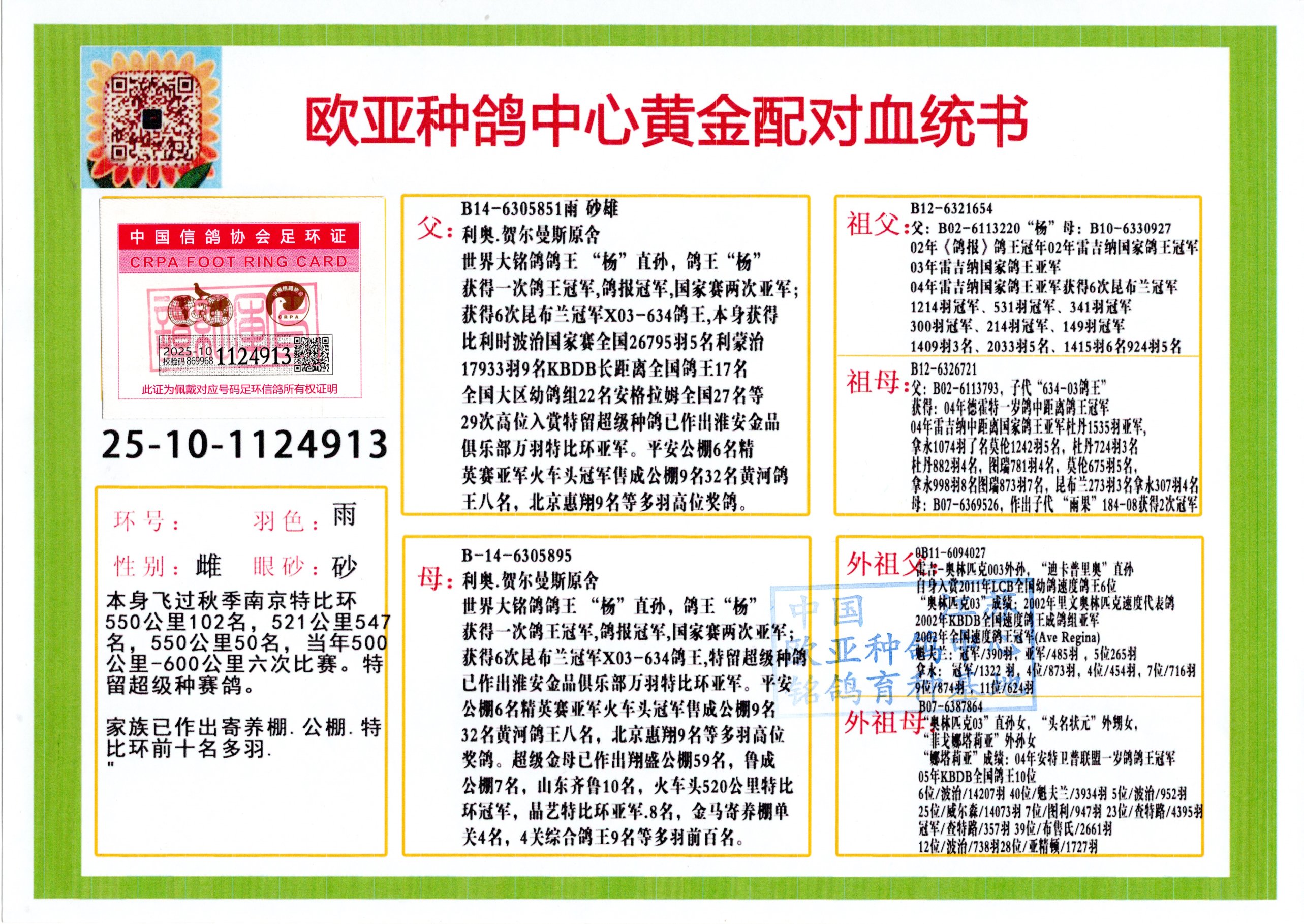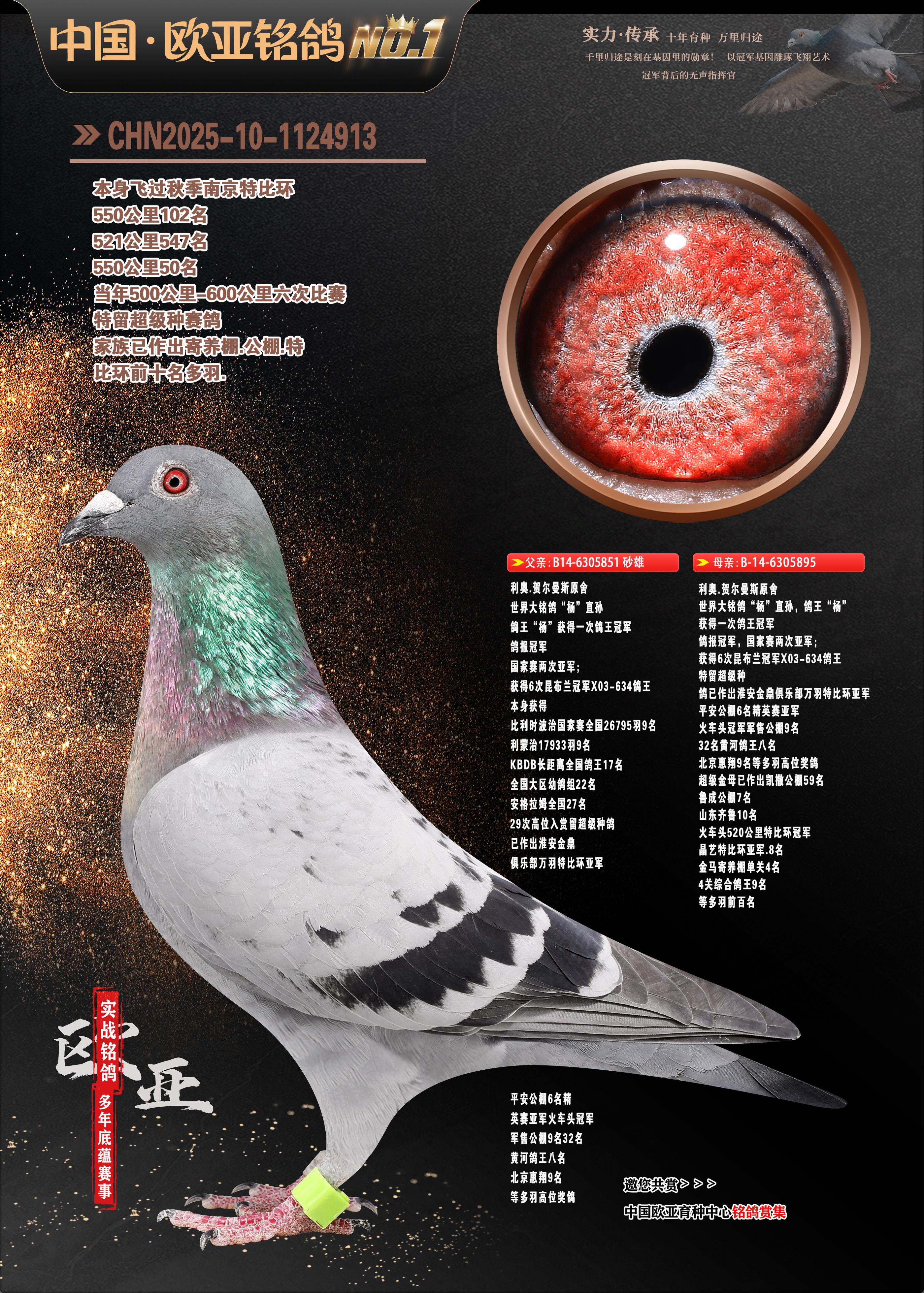 24年秋南京特比环欧亚荣获大团体冠军.小团体冠军551公里大特比13名.14名.16名.19名.20名.21名.24名.26名.27名.28名.42名.52名.54名.57名.65名.66名.68名.70名.71名.72名.74名.76名.80名.82名.83名.84名.85名.86名.90名.92名.110名.116名.121名.122名.128名.131名.158名.161名.164名.165名.166名.172名.174名.177名.182名.195名.196名.201名.205名.208名.210名.216名.253名.269名.275名.276名.294名.296名.299名,,24年秋云南天南铜都公棚决赛415名.天南铜都小棚决赛409名.云南玉活公棚决赛102名.490名.团体32名上笼二羽进二羽,天南铜都大棚506公里决赛445名。热烈祝贺河北省巨鹿县李兰生老师用欧亚泰山号血系连续十一年夺冠军,河北省国家赛冠军.全国季军等多次前十名高位,扬州王军王总用欧亚利奥24年春季获山东翔宇公棚决赛33名盖比53名。南京刘正龙刘总用欧亚盖比获得24年秋山东潍坊国际公棚决赛42名.精英赛30名.三关鸽王71名.决赛86名.加站赛16名.南京市特比环A组鸽王9名.B组鸽王5名.6名.C组鸽王5名.精英赛冠军4名.技能赛A组冠军4名.5名.秦淮区特比环荣获15名.46名.48名.87名。四川西昌徐亮徐总用欧亚利奥获得凉山州聚友决赛177名.第二关亚军双关鸽王19名.三关鸽王105名.云南豪庭公棚决赛603名。热烈祝贺24年四川重庆翔园鸽舍用欧亚泰山号荣获春季400公里冠军.秋季500公里冠军,河北王总用詹森X利奥获得千羽千翔公棚400公里冠军,广东蔡楷焕荣获24年秋爱好者 赛鸽俱乐部三关鸽王季军.一关420公里99名.二关450公里11名.三关520公里32名.单关季军.7名.12名,江西李卫兴荣获贵州红枫公棚8名.共翔俱乐部寄养棚四关综合鸽王30名.一关400公里78名.二关500公里55名.三关520公里37名.四关500公里57名.同父母获公棚18名.雷鸣获得武汉黄浦育翔中心冠军,四川陈文获得四川明鸿俱乐部300公里梦幻2名.3名.4名.9名.10名.13名.14名.15名.31名.34名.40名.41名.42名.43名.69名.71名.72名.73名.74名.94名.95名.97名.98名.99名.419公里决赛荣获总冠军7名.总共归巢9羽,四川徐亮获豪庭决赛603名,山西郑勇获得山西泰鑫公棚决赛255名詹森红狐,热烈祝贺马总获得开尔(飞跃队)决赛9名获奖金1310000万元.第一关52名,天津津福资赛180公里96名.获奖金429543万元,欧亚支持全国鸽友24年秋多人报喜 祝大家取得更好成绩,给欧亚报喜鸽友欧亚决定给每人赠送一羽超级种鸽。欧亚俱乐部特比环多关鸽王成绩:15年秋淮安特比环黑色星期一全会上笼9700多羽,当天无鸽归巢,第二天全会归巢357羽,本舍归巢158羽.前十名八羽.前一百名归巢57羽,16年春季获五关鸽王总冠军,总亚军四名.六名.七名.九名.十名.晶艺俱乐部520公里冠亚季军5名.6名.7名.9名.11名等,火车头冠军.季军6名.8名.9名.10名,16年秋晶艺俱乐部特比环520公里亚军.季军4名.6名.7名.9名,15年春南京白下特比环冠军.亚军.季军6名.7名.8名.9名.10名.指定鸽A B组获得冠军.亚军.季军4名.5名.,17年淮安特比环亚军.4名.5名.7名.8名.10名.六关鸽王总冠军.4名.6名.9名.10名,寄养棚宿迁刘总20羽特比环获冠军.季军.4名.7名.8名.9名等。18年荣获万羽特比环六关鸽王总冠军.总亚军.总季军.6名.8名.十名.单关四羽冠军.二羽亚军.四羽季军.前十名27羽。19年秋万羽特比环六关鸽王总亚军.总季军.5名.8名等,单关二羽冠军.三羽亚军.一羽季军前十名31羽。20年秋淮安市鸽会四关特比环大赛风雨无阻鸽王亚军.鸽王六名,金品俱乐部万羽特比环六关鸽王总冠军,总亚军.四名.五名.六名.七名.八名.十名.前二百名鸽王35羽,单关冠亚季军前十名四十多羽,火车头五关鸽王季军.六名.八名.前二百名鸽王十七羽。20年春荣获淮安五区一市四关鸽王总冠军.亚军.四名.八名.九名。21年秋荣获金品万羽特比环大赛六关鸽王总亚军.总季军.四名.七名.九名.十名.单关冠亚军季军前十名三十多羽。火车头协会鸽王六名.七名.十名.单关前十名十七羽。22年秋荣获鸽王总冠军.总亚军.5名.7名.8名.9名.11名.单关冠亚季军前十名三十多羽,第一关单关前二百名四十多羽,第二关前二百名三十多羽,第三关前二百名四十多羽,第四关前二百名四十多羽,第五关前一百名53羽。23年秋荣获鸽王季军.五名.八名.十名.13名.17名.20名.27名等多羽鸽王.单关前十名二十多羽。公棚.寄养棚部分成绩:16年秋宁夏黄河公棚总冠军电脑戈马力指定通炮冠军,17年送八羽参赛获得鸽王八名进奖四名,支持韩总荣获八名。支持鸽友荣获宁夏中卫公棚决赛总冠军.精英赛冠军,支持18年宁夏黄河公棚决赛冠军詹森X泰山。安徽鼎博寄养棚院内外四关鸽王总冠军.鸽王十七名.三十七名同窝,鸽王39名.42名.58名.67名。18年山东公棚预赛冠军.决赛65名.送八羽进奖五羽.指定获奔驰汽车一辆。支持鸽友获得云南蓝云公棚冠军.盖比X佛卡门。支持鸽友荣获云南银集公棚决赛冠军 詹森427X520血系 速度赛6700羽冠军。17年荣获金马俱乐部寄养棚四关鸽王总冠军.季军.六名.八名.第一关冠军.亚军.季军四名.七名.十一名.金牌教练奖。支持鸽友18年北京费翔公棚预赛九名电脑X桑杰士,支持鸽友荣获陕西威力公棚决赛11名.内蒙古临河寄养棚四关鸽王六名.詹森配泰山,支持河北王总用欧亚詹森427配胡本喜获20年秋开尔青年棚季军。云南东荣公棚16年预赛冠军.决赛77名.17年决赛12名.詹森红狐X泰山,17年平安公棚决赛4名 詹森427。欧亚获得21年金母寄养棚第一关四名.第二关5名.第三关5名.6名.7名.10名.三关鸽王总冠军,四关鸽王14名.十羽鸽王。支持河