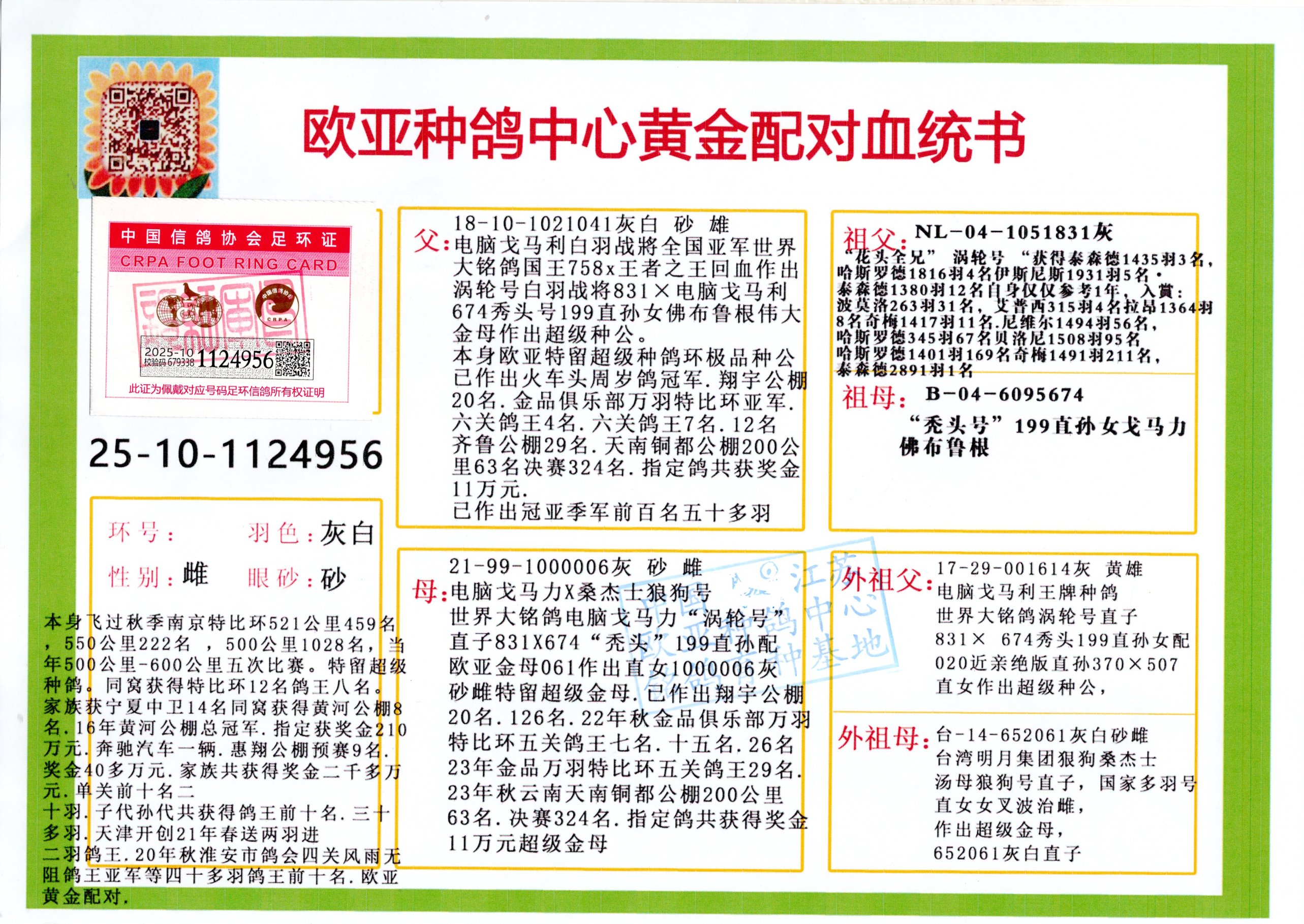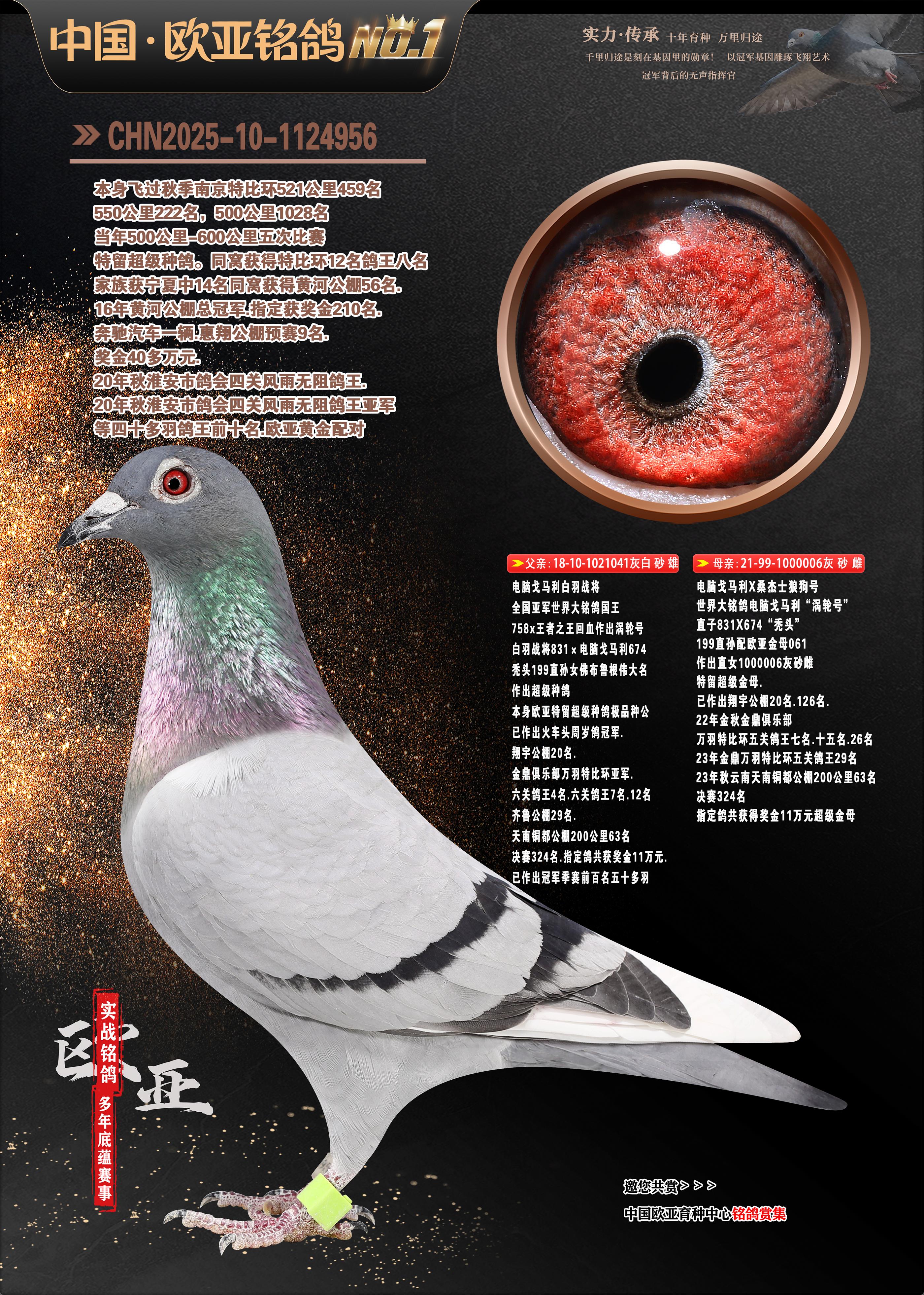 24年秋南京特比环欧亚荣获大团体冠军.小团体冠军551公里大特比13名.14名.16名.19名.20名.21名.24名.26名.27名.28名.42名.52名.54名.57名.65名.66名.68名.70名.71名.72名.74名.76名.80名.82名.83名.84名.85名.86名.90名.92名.110名.116名.121名.122名.128名.131名.158名.161名.164名.165名.166名.172名.174名.177名.182名.195名.196名.201名.205名.208名.210名.216名.253名.269名.275名.276名.294名.296名.299名,,24年秋云南天南铜都公棚决赛415名.天南铜都小棚决赛409名.云南玉活公棚决赛102名.490名.团体32名上笼二羽进二羽,天南铜都大棚506公里决赛445名。热烈祝贺河北省巨鹿县李兰生老师用欧亚泰山号血系连续十一年夺冠军,河北省国家赛冠军.全国季军等多次前十名高位,扬州王军王总用欧亚利奥24年春季获山东翔宇公棚决赛33名盖比53名。南京刘正龙刘总用欧亚盖比获得24年秋山东潍坊国际公棚决赛42名.精英赛30名.三关鸽王71名.决赛86名.加站赛16名.南京市特比环A组鸽王9名.B组鸽王5名.6名.C组鸽王5名.精英赛冠军4名.技能赛A组冠军4名.5名.秦淮区特比环荣获15名.46名.48名.87名。四川西昌徐亮徐总用欧亚利奥获得凉山州聚友决赛177名.第二关亚军双关鸽王19名.三关鸽王105名.云南豪庭公棚决赛603名。热烈祝贺24年四川重庆翔园鸽舍用欧亚泰山号荣获春季400公里冠军.秋季500公里冠军,河北王总用詹森X利奥获得千羽千翔公棚400公里冠军,广东蔡楷焕荣获24年秋爱好者 赛鸽俱乐部三关鸽王季军.一关420公里99名.二关450公里11名.三关520公里32名.单关季军.7名.12名,江西李卫兴荣获贵州红枫公棚8名.共翔俱乐部寄养棚四关综合鸽王30名.一关400公里78名.二关500公里55名.三关520公里37名.四关500公里57名.同父母获公棚18名.雷鸣获得武汉黄浦育翔中心冠军,四川陈文获得四川明鸿俱乐部300公里梦幻2名.3名.4名.9名.10名.13名.14名.15名.31名.34名.40名.41名.42名.43名.69名.71名.72名.73名.74名.94名.95名.97名.98名.99名.419公里决赛荣获总冠军7名.总共归巢9羽,四川徐亮获豪庭决赛603名,山西郑勇获得山西泰鑫公棚决赛255名詹森红狐,热烈祝贺马总获得开尔(飞跃队)决赛9名获奖金1310000万元.第一关52名,天津津福资赛180公里96名.获奖金429543万元,欧亚支持全国鸽友24年秋多人报喜 祝大家取得更好成绩,给欧亚报喜鸽友欧亚决定给每人赠送一羽超级种鸽。欧亚俱乐部特比环多关鸽王成绩:15年秋淮安特比环黑色星期一全会上笼9700多羽,当天无鸽归巢,第二天全会归巢357羽,本舍归巢158羽.前十名八羽.前一百名归巢57羽,16年春季获五关鸽王总冠军,总亚军四名.六名.七名.九名.十名.晶艺俱乐部520公里冠亚季军5名.6名.7名.9名.11名等,火车头冠军.季军6名.8名.9名.10名,16年秋晶艺俱乐部特比环520公里亚军.季军4名.6名.7名.9名,15年春南京白下特比环冠军.亚军.季军6名.7名.8名.9名.10名.指定鸽A B组获得冠军.亚军.季军4名.5名.,17年淮安特比环亚军.4名.5名.7名.8名.10名.六关鸽王总冠军.4名.6名.9名.10名,寄养棚宿迁刘总20羽特比环获冠军.季军.4名.7名.8名.9名等。18年荣获万羽特比环六关鸽王总冠军.总亚军.总季军.6名.8名.十名.单关四羽冠军.二羽亚军.四羽季军.前十名27羽。19年秋万羽特比环六关鸽王总亚军.总季军.5名.8名等,单关二羽冠军.三羽亚军.一羽季军前十名31羽。20年秋淮安市鸽会四关特比环大赛风雨无阻鸽王亚军.鸽王六名,金品俱乐部万羽特比环六关鸽王总冠军,总亚军.四名.五名.六名.七名.八名.十名.前二百名鸽王35羽,单关冠亚季军前十名四十多羽,火车头五关鸽王季军.六名.八名.前二百名鸽王十七羽。20年春荣获淮安五区一市四关鸽王总冠军.亚军.四名.八名.九名。21年秋荣获金品万羽特比环大赛六关鸽王总亚军.总季军.四名.七名.九名.十名.单关冠亚军季军前十名三十多羽。火车头协会鸽王六名.七名.十名.单关前十名十七羽。22年秋荣获鸽王总冠军.总亚军.5名.7名.8名.9名.11名.单关冠亚季军前十名三十多羽,第一关单关前二百名四十多羽,第二关前二百名三十多羽,第三关前二百名四十多羽,第四关前二百名四十多羽,第五关前一百名53羽。23年秋荣获鸽王季军.五名.八名.十名.13名.17名.20名.27名等多羽鸽王.单关前十名二十多羽。公棚.寄养棚部分成绩:16年秋宁夏黄河公棚总冠军电脑戈马力指定通炮冠军,17年送八羽参赛获得鸽王八名进奖四名,支持韩总荣获八名。支持鸽友荣获宁夏中卫公棚决赛总冠军.精英赛冠军,支持18年宁夏黄河公棚决赛冠军詹森X泰山。安徽鼎博寄养棚院内外四关鸽王总冠军.鸽王十七名.三十七名同窝,鸽王39名.42名.58名.67名。18年山东公棚预赛冠军.决赛65名.送八羽进奖五羽.指定获奔驰汽车一辆。支持鸽友获得云南蓝云公棚冠军.盖比X佛卡门。支持鸽友荣获云南银集公棚决赛冠军 詹森427X520血系 速度赛6700羽冠军。17年荣获金马俱乐部寄养棚四关鸽王总冠军.季军.六名.八名.第一关冠军.亚军.季军四名.七名.十一名.金牌教练奖。支持鸽友18年北京费翔公棚预赛九名电脑X桑杰士,支持鸽友荣获陕西威力公棚决赛11名.内蒙古临河寄养棚四关鸽王六名.詹森配泰山,支持河北王总用欧亚詹森427配胡本喜获20年秋开尔青年棚季军。云南东荣公棚16年预赛冠军.决赛77名.17年决赛12名.詹森红狐X泰山,17年平安公棚决赛4名 詹森427。欧亚获得21年金母寄养棚第一关四名.第二关5名.第三关5名.6名.7名.10名.三关鸽王总冠军,四关鸽王14名.十羽鸽王。支持河