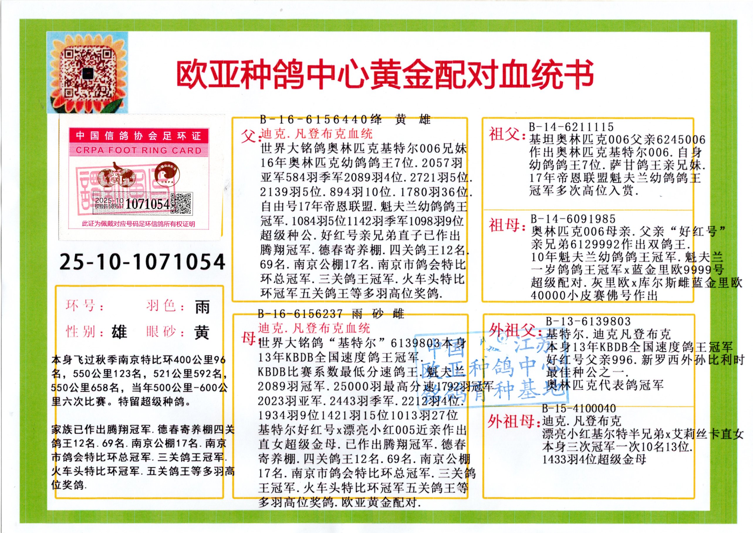 24年秋南京特比环欧亚荣获大团体冠军.小团体冠军551公里大特比13名.14名.16名.19名.20名.21名.24名.26名.27名.28名.42名.52名.54名.57名.65名.66名.68名.70名.71名.72名.74名.76名.80名.82名.83名.84名.85名.86名.90名.92名.110名.116名.121名.122名.128名.131名.158名.161名.164名.165名.166名.172名.174名.177名.182名.195名.196名.201名.205名.208名.210名.216名.253名.269名.275名.276名.294名.296名.299名,,24年秋云南天南铜都公棚决赛415名.天南铜都小棚决赛409名.云南玉活公棚决赛102名.490名.团体32名上笼二羽进二羽,天南铜都大棚506公里决赛445名。热烈祝贺河北省巨鹿县李兰生老师用欧亚泰山号血系连续十一年夺冠军,河北省国家赛冠军.全国季军等多次前十名高位,扬州王军王总用欧亚利奥24年春季获山东翔宇公棚决赛33名盖比53名。南京刘正龙刘总用欧亚盖比获得24年秋山东潍坊国际公棚决赛42名.精英赛30名.三关鸽王71名.决赛86名.加站赛16名.南京市特比环A组鸽王9名.B组鸽王5名.6名.C组鸽王5名.精英赛冠军4名.技能赛A组冠军4名.5名.秦淮区特比环荣获15名.46名.48名.87名。四川西昌徐亮徐总用欧亚利奥获得凉山州聚友决赛177名.第二关亚军双关鸽王19名.三关鸽王105名.云南豪庭公棚决赛603名。热烈祝贺24年四川重庆翔园鸽舍用欧亚泰山号荣获春季400公里冠军.秋季500公里冠军,河北王总用詹森X利奥获得千羽千翔公棚400公里冠军,广东蔡楷焕荣获24年秋爱好者 赛鸽俱乐部三关鸽王季军.一关420公里99名.二关450公里11名.三关520公里32名.单关季军.7名.12名,江西李卫兴荣获贵州红枫公棚8名.共翔俱乐部寄养棚四关综合鸽王30名.一关400公里78名.二关500公里55名.三关520公里37名.四关500公里57名.同父母获公棚18名.雷鸣获得武汉黄浦育翔中心冠军,四川陈文获得四川明鸿俱乐部300公里梦幻2名.3名.4名.9名.10名.13名.14名.15名.31名.34名.40名.41名.42名.43名.69名.71名.72名.73名.74名.94名.95名.97名.98名.99名.419公里决赛荣获总冠军7名.总共归巢9羽,四川徐亮获豪庭决赛603名,山西郑勇获得山西泰鑫公棚决赛255名詹森红狐,热烈祝贺马总获得开尔(飞跃队)决赛9名获奖金1310000万元.第一关52名,天津津福资赛180公里96名.获奖金429543万元,欧亚支持全国鸽友24年秋多人报喜 祝大家取得更好成绩,给欧亚报喜鸽友欧亚决定给每人赠送一羽超级种鸽。欧亚俱乐部特比环多关鸽王成绩:15年秋淮安特比环黑色星期一全会上笼9700多羽,当天无鸽归巢,第二天全会归巢357羽,本舍归巢158羽.前十名八羽.前一百名归巢57羽,16年春季获五关鸽王总冠军,总亚军四名.六名.七名.九名.十名.晶艺俱乐部520公里冠亚季军5名.6名.7名.9名.11名等,火车头冠军.季军6名.8名.9名.10名,16年秋晶艺俱乐部特比环520公里亚军.季军4名.6名.7名.9名,15年春南京白下特比环冠军.亚军.季军6名.7名.8名.9名.10名.指定鸽A B组获得冠军.亚军.季军4名.5名.,17年淮安特比环亚军.4名.5名.7名.8名.10名.六关鸽王总冠军.4名.6名.9名.10名,寄养棚宿迁刘总20羽特比环获冠军.季军.4名.7名.8名.9名等。18年荣获万羽特比环六关鸽王总冠军.总亚军.总季军.6名.8名.十名.单关四羽冠军.二羽亚军.四羽季军.前十名27羽。19年秋万羽特比环六关鸽王总亚军.总季军.5名.8名等,单关二羽冠军.三羽亚军.一羽季军前十名31羽。20年秋淮安市鸽会四关特比环大赛风雨无阻鸽王亚军.鸽王六名,金品俱乐部万羽特比环六关鸽王总冠军,总亚军.四名.五名.六名.七名.八名.十名.前二百名鸽王35羽,单关冠亚季军前十名四十多羽,火车头五关鸽王季军.六名.八名.前二百名鸽王十七羽。20年春荣获淮安五区一市四关鸽王总冠军.亚军.四名.八名.九名。21年秋荣获金品万羽特比环大赛六关鸽王总亚军.总季军.四名.七名.九名.十名.单关冠亚军季军前十名三十多羽。火车头协会鸽王六名.七名.十名.单关前十名十七羽。22年秋荣获鸽王总冠军.总亚军.5名.7名.8名.9名.11名.单关冠亚季军前十名三十多羽,第一关单关前二百名四十多羽,第二关前二百名三十多羽,第三关前二百名四十多羽,第四关前二百名四十多羽,第五关前一百名53羽。23年秋荣获鸽王季军.五名.八名.十名.13名.17名.20名.27名等多羽鸽王.单关前十名二十多羽。公棚.寄养棚部分成绩:16年秋宁夏黄河公棚总冠军电脑戈马力指定通炮冠军,17年送八羽参赛获得鸽王八名进奖四名,支持韩总荣获八名。支持鸽友荣获宁夏中卫公棚决赛总冠军.精英赛冠军,支持18年宁夏黄河公棚决赛冠军詹森X泰山。安徽鼎博寄养棚院内外四关鸽王总冠军.鸽王十七名.三十七名同窝,鸽王39名.42名.58名.67名。18年山东公棚预赛冠军.决赛65名.送八羽进奖五羽.指定获奔驰汽车一辆。支持鸽友获得云南蓝云公棚冠军.盖比X佛卡门。支持鸽友荣获云南银集公棚决赛冠军 詹森427X520血系 速度赛6700羽冠军。17年荣获金马俱乐部寄养棚四关鸽王总冠军.季军.六名.八名.第一关冠军.亚军.季军四名.七名.十一名.金牌教练奖。支持鸽友18年北京费翔公棚预赛九名电脑X桑杰士,支持鸽友荣获陕西威力公棚决赛11名.内蒙古临河寄养棚四关鸽王六名.詹森配泰山,支持河北王总用欧亚詹森427配胡本喜获20年秋开尔青年棚季军。云南东荣公棚16年预赛冠军.决赛77名.17年决赛12名.詹森红狐X泰山,17年平安公棚决赛4名 詹森427。欧亚获得21年金母寄养棚第一关四名.第二关5名.第三关5名.6名.7名.10名.三关鸽王总冠军,四关鸽王14名.十羽鸽王。支持河