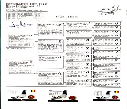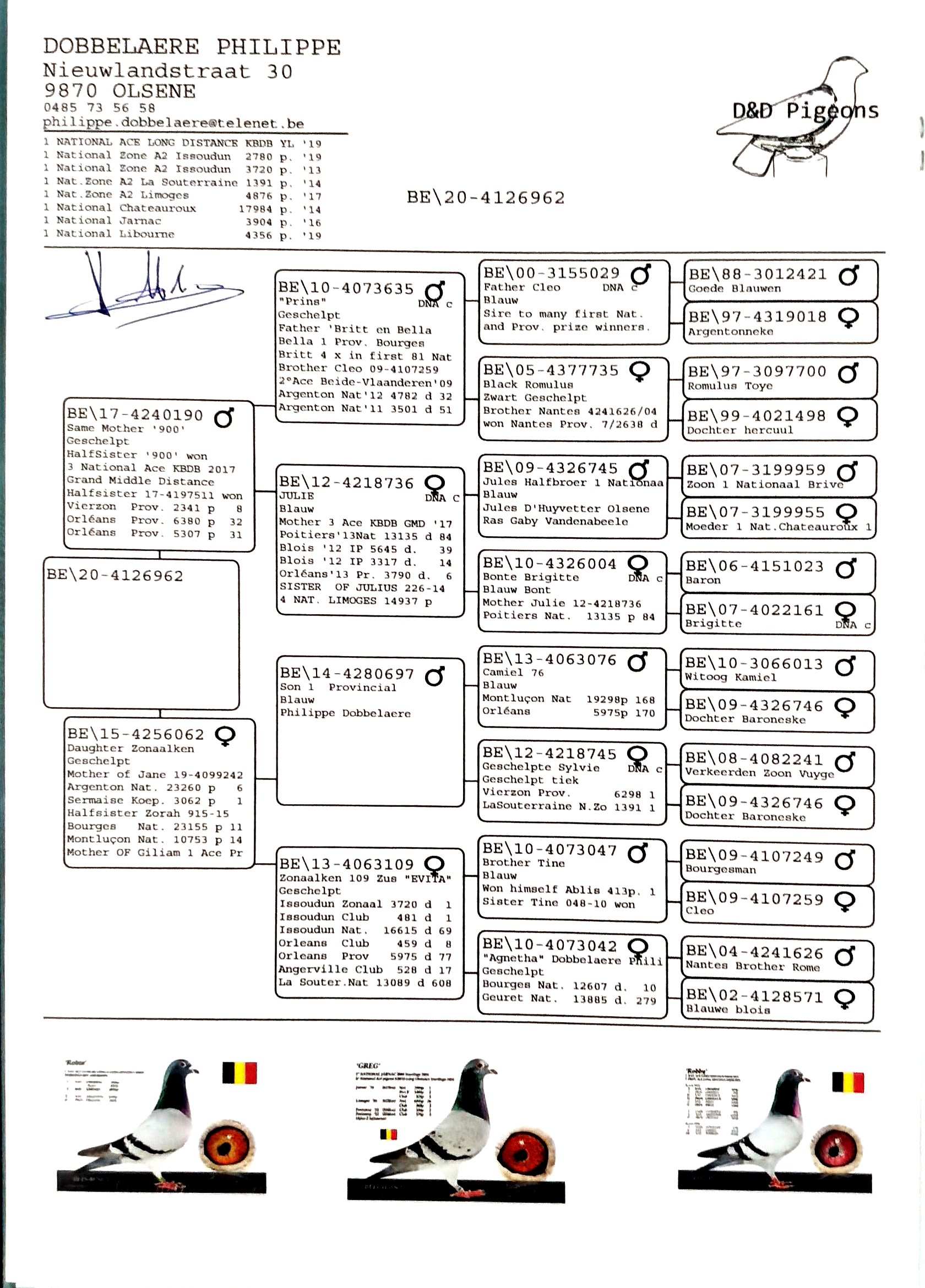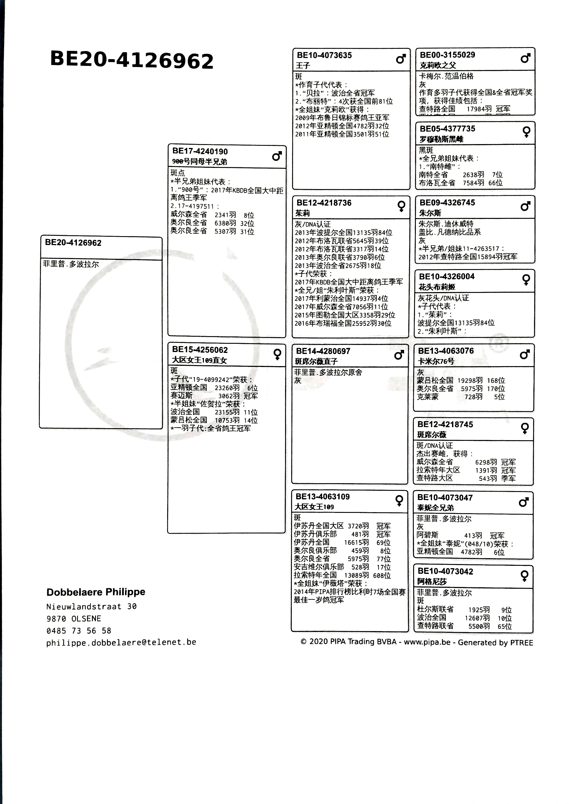 BE2020-4126962 平辈:1.“简妮”(19-4099242):亚精顿全国 23260羽 6位赛迈斯 3062羽 冠军2.“小黑”(457-17):波治全国 19123羽 76位*母亲姐妹“佐贺拉”(915-15):波治全国 23155羽 11位蒙吕松全国 10753羽 14位~作育子代“吉列姆”(038-18):2019年KBDB全省中距离鸽王冠军2019年KBDB- FCI世界中距离最佳赛将亚军2020年奥林匹克希望B组中距离代表鸽亚军父亲BE2017-4240190 半平辈获得:1.“900号”2017年KBDB全国大中距离鸽王季军2017年长距离杯全国鸽王冠军2.“贝拉”:波治全省冠军3.“布丽特”:4次获全国前81位母亲BE2015-4256062