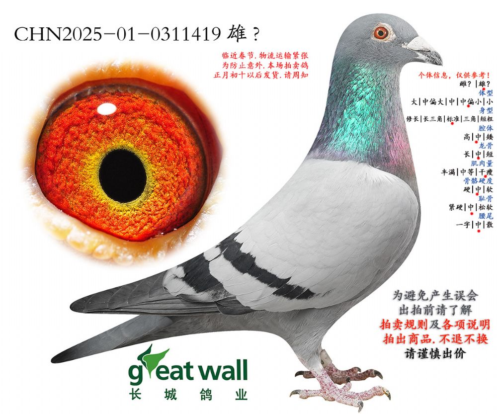 因拍卖鸽均是未做育过的种鸽或幼鸽,图内所标雌雄仅供参考,实际性别已实物为准。不做退换理由。