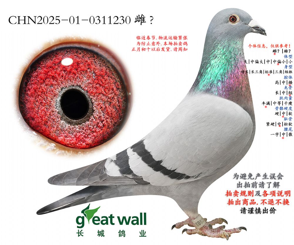 因拍卖鸽均是未做育过的种鸽或幼鸽,图内所标雌雄仅供参考,实际性别已实物为准。不做退换理由。