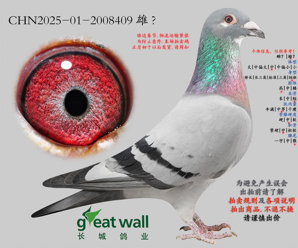 因拍卖鸽均是未做育过的种鸽或幼鸽,图内所标雌雄仅供参考,实际性别已实物为准。不做退换理由。