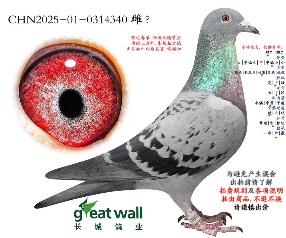 因拍卖鸽均是未做育过的种鸽或幼鸽,图内所标雌雄仅供参考,实际性别已实物为准。不做退换理由。