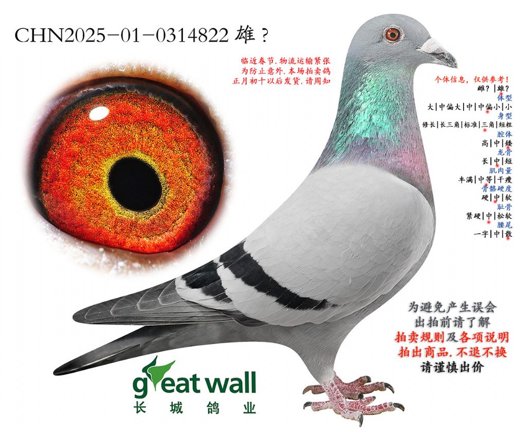 因拍卖鸽均是未做育过的种鸽或幼鸽,图内所标雌雄仅供参考,实际性别已实物为准。不做退换理由。