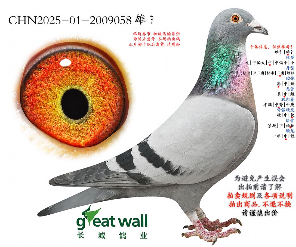 因拍卖鸽均是未做育过的种鸽或幼鸽,图内所标雌雄仅供参考,实际性别已实物为准。不做退换理由。