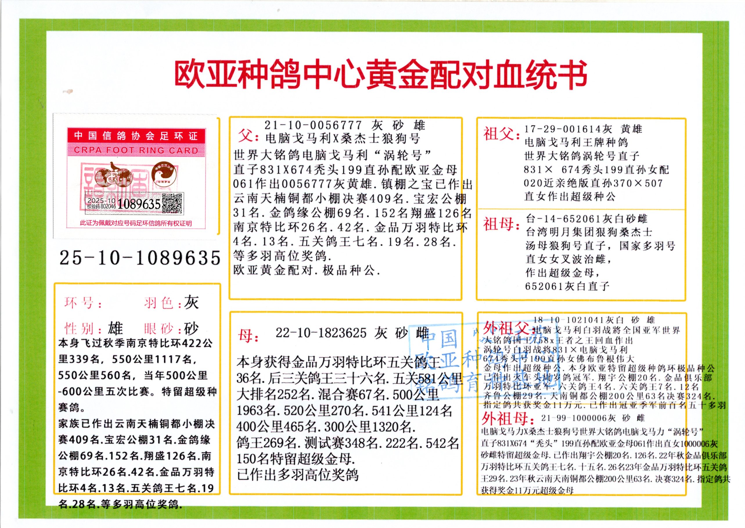 24年秋南京特比环欧亚荣获大团体冠军.小团体冠军551公里大特比13名.14名.16名.19名.20名.21名.24名.26名.27名.28名.42名.52名.54名.57名.65名.66名.68名.70名.71名.72名.74名.76名.80名.82名.83名.84名.85名.86名.90名.92名.110名.116名.121名.122名.128名.131名.158名.161名.164名.165名.166名.172名.174名.177名.182名.195名.196名.201名.205名.208名.210名.216名.253名.269名.275名.276名.294名.296名.299名,,24年秋云南天南铜都公棚决赛415名.天南铜都小棚决赛409名.云南玉活公棚决赛102名.490名.团体32名上笼二羽进二羽,天南铜都大棚506公里决赛445名。热烈祝贺河北省巨鹿县李兰生老师用欧亚泰山号血系连续十一年夺冠军,河北省国家赛冠军.全国季军等多次前十名高位,扬州王军王总用欧亚利奥24年春季获山东翔宇公棚决赛33名盖比53名。南京刘正龙刘总用欧亚盖比获得24年秋山东潍坊国际公棚决赛42名.精英赛30名.三关鸽王71名.决赛86名.加站赛16名.南京市特比环A组鸽王9名.B组鸽王5名.6名.C组鸽王5名.精英赛冠军4名.技能赛A组冠军4名.5名.秦淮区特比环荣获15名.46名.48名.87名。四川西昌徐亮徐总用欧亚利奥获得凉山州聚友决赛177名.第二关亚军双关鸽王19名.三关鸽王105名.云南豪庭公棚决赛603名。热烈祝贺24年四川重庆翔园鸽舍用欧亚泰山号荣获春季400公里冠军.秋季500公里冠军,河北王总用詹森X利奥获得千羽千翔公棚400公里冠军,广东蔡楷焕荣获24年秋爱好者 赛鸽俱乐部三关鸽王季军.一关420公里99名.二关450公里11名.三关520公里32名.单关季军.7名.12名,江西李卫兴荣获贵州红枫公棚8名.共翔俱乐部寄养棚四关综合鸽王30名.一关400公里78名.二关500公里55名.三关520公里37名.四关500公里57名.同父母获公棚18名.雷鸣获得武汉黄浦育翔中心冠军,四川陈文获得四川明鸿俱乐部300公里梦幻2名.3名.4名.9名.10名.13名.14名.15名.31名.34名.40名.41名.42名.43名.69名.71名.72名.73名.74名.94名.95名.97名.98名.99名.419公里决赛荣获总冠军7名.总共归巢9羽,四川徐亮获豪庭决赛603名,山西郑勇获得山西泰鑫公棚决赛255名詹森红狐,热烈祝贺马总获得开尔(飞跃队)决赛9名获奖金1310000万元.第一关52名,天津津福资赛180公里96名.获奖金429543万元,欧亚支持全国鸽友24年秋多人报喜 祝大家取得更好成绩,给欧亚报喜鸽友欧亚决定给每人赠送一羽超级种鸽。欧亚俱乐部特比环多关鸽王成绩:15年秋淮安特比环黑色星期一全会上笼9700多羽,当天无鸽归巢,第二天全会归巢357羽,本舍归巢158羽.前十名八羽.前一百名归巢57羽,16年春季获五关鸽王总冠军,总亚军四名.六名.七名.九名.十名.晶艺俱乐部520公里冠亚季军5名.6名.7名.9名.11名等,火车头冠军.季军6名.8名.9名.10名,16年秋晶艺俱乐部特比环520公里亚军.季军4名.6名.7名.9名,15年春南京白下特比环冠军.亚军.季军6名.7名.8名.9名.10名.指定鸽A B组获得冠军.亚军.季军4名.5名.,17年淮安特比环亚军.4名.5名.7名.8名.10名.六关鸽王总冠军.4名.6名.9名.10名,寄养棚宿迁刘总20羽特比环获冠军.季军.4名.7名.8名.9名等。18年荣获万羽特比环六关鸽王总冠军.总亚军.总季军.6名.8名.十名.单关四羽冠军.二羽亚军.四羽季军.前十名27羽。19年秋万羽特比环六关鸽王总亚军.总季军.5名.8名等,单关二羽冠军.三羽亚军.一羽季军前十名31羽。20年秋淮安市鸽会四关特比环大赛风雨无阻鸽王亚军.鸽王六名,金品俱乐部万羽特比环六关鸽王总冠军,总亚军.四名.五名.六名.七名.八名.十名.前二百名鸽王35羽,单关冠亚季军前十名四十多羽,火车头五关鸽王季军.六名.八名.前二百名鸽王十七羽。20年春荣获淮安五区一市四关鸽王总冠军.亚军.四名.八名.九名。21年秋荣获金品万羽特比环大赛六关鸽王总亚军.总季军.四名.七名.九名.十名.单关冠亚军季军前十名三十多羽。火车头协会鸽王六名.七名.十名.单关前十名十七羽。22年秋荣获鸽王总冠军.总亚军.5名.7名.8名.9名.11名.单关冠亚季军前十名三十多羽,第一关单关前二百名四十多羽,第二关前二百名三十多羽,第三关前二百名四十多羽,第四关前二百名四十多羽,第五关前一百名53羽。23年秋荣获鸽王季军.五名.八名.十名.13名.17名.20名.27名等多羽鸽王.单关前十名二十多羽。公棚.寄养棚部分成绩:16年秋宁夏黄河公棚总冠军电脑戈马力指定通炮冠军,17年送八羽参赛获得鸽王八名进奖四名,支持韩总荣获八名。支持鸽友荣获宁夏中卫公棚决赛总冠军.精英赛冠军,支持18年宁夏黄河公棚决赛冠军詹森X泰山。安徽鼎博寄养棚院内外四关鸽王总冠军.鸽王十七名.三十七名同窝,鸽王39名.42名.58名.67名。18年山东公棚预赛冠军.决赛65名.送八羽进奖五羽.指定获奔驰汽车一辆。支持鸽友获得云南蓝云公棚冠军.盖比X佛卡门。支持鸽友荣获云南银集公棚决赛冠军 詹森427X520血系 速度赛6700羽冠军。17年荣获金马俱乐部寄养棚四关鸽王总冠军.季军.六名.八名.第一关冠军.亚军.季军四名.七名.十一名.金牌教练奖。支持鸽友18年北京费翔公棚预赛九名电脑X桑杰士,支持鸽友荣获陕西威力公棚决赛11名.内蒙古临河寄养棚四关鸽王六名.詹森配泰山,支持河北王总用欧亚詹森427配胡本喜获20年秋开尔青年棚季军。云南东荣公棚16年预赛冠军.决赛77名.17年决赛12名.詹森红狐X泰山,17年平安公棚决赛4名 詹森427。欧亚获得21年金母寄养棚第一关四名.第二关5名.第三关5名.6名.7名.10名.三关鸽王总冠军,四关鸽王14名.十羽鸽王。支持河