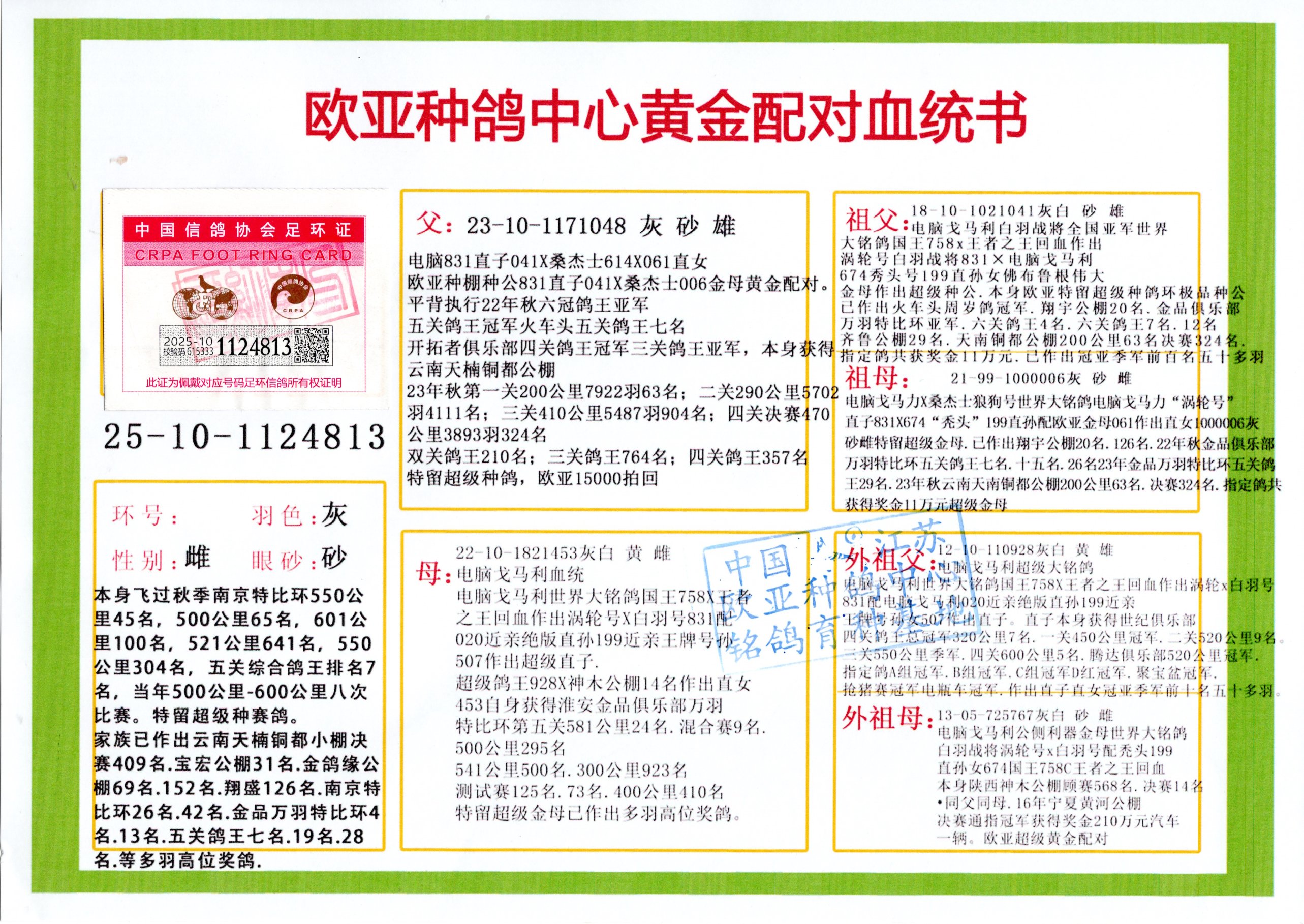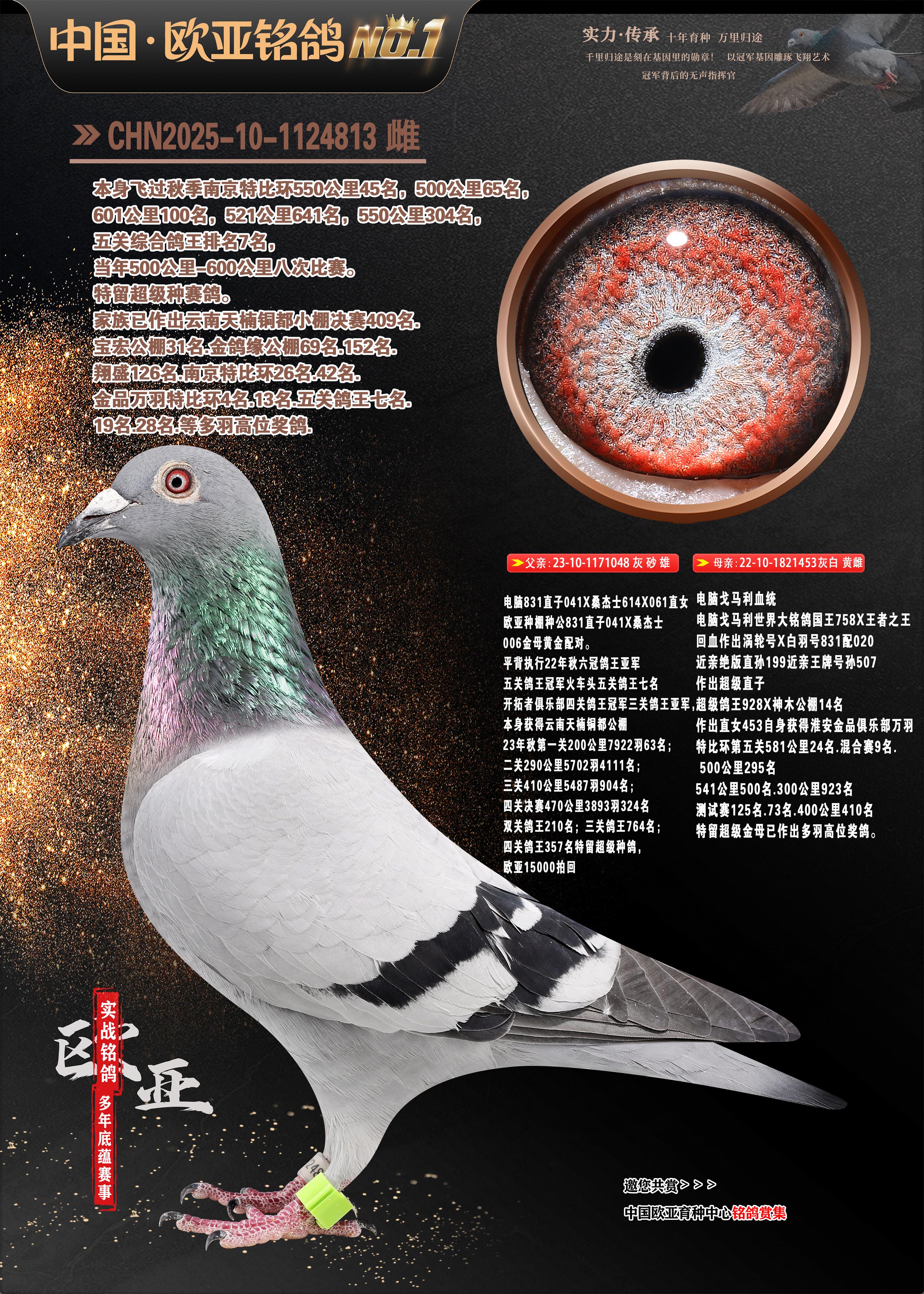 24年秋南京特比环欧亚荣获大团体冠军.小团体冠军551公里大特比13名.14名.16名.19名.20名.21名.24名.26名.27名.28名.42名.52名.54名.57名.65名.66名.68名.70名.71名.72名.74名.76名.80名.82名.83名.84名.85名.86名.90名.92名.110名.116名.121名.122名.128名.131名.158名.161名.164名.165名.166名.172名.174名.177名.182名.195名.196名.201名.205名.208名.210名.216名.253名.269名.275名.276名.294名.296名.299名,,24年秋云南天南铜都公棚决赛415名.天南铜都小棚决赛409名.云南玉活公棚决赛102名.490名.团体32名上笼二羽进二羽,天南铜都大棚506公里决赛445名。热烈祝贺河北省巨鹿县李兰生老师用欧亚泰山号血系连续十一年夺冠军,河北省国家赛冠军.全国季军等多次前十名高位,扬州王军王总用欧亚利奥24年春季获山东翔宇公棚决赛33名盖比53名。南京刘正龙刘总用欧亚盖比获得24年秋山东潍坊国际公棚决赛42名.精英赛30名.三关鸽王71名.决赛86名.加站赛16名.南京市特比环A组鸽王9名.B组鸽王5名.6名.C组鸽王5名.精英赛冠军4名.技能赛A组冠军4名.5名.秦淮区特比环荣获15名.46名.48名.87名。四川西昌徐亮徐总用欧亚利奥获得凉山州聚友决赛177名.第二关亚军双关鸽王19名.三关鸽王105名.云南豪庭公棚决赛603名。热烈祝贺24年四川重庆翔园鸽舍用欧亚泰山号荣获春季400公里冠军.秋季500公里冠军,河北王总用詹森X利奥获得千羽千翔公棚400公里冠军,广东蔡楷焕荣获24年秋爱好者 赛鸽俱乐部三关鸽王季军.一关420公里99名.二关450公里11名.三关520公里32名.单关季军.7名.12名,江西李卫兴荣获贵州红枫公棚8名.共翔俱乐部寄养棚四关综合鸽王30名.一关400公里78名.二关500公里55名.三关520公里37名.四关500公里57名.同父母获公棚18名.雷鸣获得武汉黄浦育翔中心冠军,四川陈文获得四川明鸿俱乐部300公里梦幻2名.3名.4名.9名.10名.13名.14名.15名.31名.34名.40名.41名.42名.43名.69名.71名.72名.73名.74名.94名.95名.97名.98名.99名.419公里决赛荣获总冠军7名.总共归巢9羽,四川徐亮获豪庭决赛603名,山西郑勇获得山西泰鑫公棚决赛255名詹森红狐,热烈祝贺马总获得开尔(飞跃队)决赛9名获奖金1310000万元.第一关52名,天津津福资赛180公里96名.获奖金429543万元,欧亚支持全国鸽友24年秋多人报喜 祝大家取得更好成绩,给欧亚报喜鸽友欧亚决定给每人赠送一羽超级种鸽。欧亚俱乐部特比环多关鸽王成绩:15年秋淮安特比环黑色星期一全会上笼9700多羽,当天无鸽归巢,第二天全会归巢357羽,本舍归巢158羽.前十名八羽.前一百名归巢57羽,16年春季获五关鸽王总冠军,总亚军四名.六名.七名.九名.十名.晶艺俱乐部520公里冠亚季军5名.6名.7名.9名.11名等,火车头冠军.季军6名.8名.9名.10名,16年秋晶艺俱乐部特比环520公里亚军.季军4名.6名.7名.9名,15年春南京白下特比环冠军.亚军.季军6名.7名.8名.9名.10名.指定鸽A B组获得冠军.亚军.季军4名.5名.,17年淮安特比环亚军.4名.5名.7名.8名.10名.六关鸽王总冠军.4名.6名.9名.10名,寄养棚宿迁刘总20羽特比环获冠军.季军.4名.7名.8名.9名等。18年荣获万羽特比环六关鸽王总冠军.总亚军.总季军.6名.8名.十名.单关四羽冠军.二羽亚军.四羽季军.前十名27羽。19年秋万羽特比环六关鸽王总亚军.总季军.5名.8名等,单关二羽冠军.三羽亚军.一羽季军前十名31羽。20年秋淮安市鸽会四关特比环大赛风雨无阻鸽王亚军.鸽王六名,金品俱乐部万羽特比环六关鸽王总冠军,总亚军.四名.五名.六名.七名.八名.十名.前二百名鸽王35羽,单关冠亚季军前十名四十多羽,火车头五关鸽王季军.六名.八名.前二百名鸽王十七羽。20年春荣获淮安五区一市四关鸽王总冠军.亚军.四名.八名.九名。21年秋荣获金品万羽特比环大赛六关鸽王总亚军.总季军.四名.七名.九名.十名.单关冠亚军季军前十名三十多羽。火车头协会鸽王六名.七名.十名.单关前十名十七羽。22年秋荣获鸽王总冠军.总亚军.5名.7名.8名.9名.11名.单关冠亚季军前十名三十多羽,第一关单关前二百名四十多羽,第二关前二百名三十多羽,第三关前二百名四十多羽,第四关前二百名四十多羽,第五关前一百名53羽。23年秋荣获鸽王季军.五名.八名.十名.13名.17名.20名.27名等多羽鸽王.单关前十名二十多羽。公棚.寄养棚部分成绩:16年秋宁夏黄河公棚总冠军电脑戈马力指定通炮冠军,17年送八羽参赛获得鸽王八名进奖四名,支持韩总荣获八名。支持鸽友荣获宁夏中卫公棚决赛总冠军.精英赛冠军,支持18年宁夏黄河公棚决赛冠军詹森X泰山。安徽鼎博寄养棚院内外四关鸽王总冠军.鸽王十七名.三十七名同窝,鸽王39名.42名.58名.67名。18年山东公棚预赛冠军.决赛65名.送八羽进奖五羽.指定获奔驰汽车一辆。支持鸽友获得云南蓝云公棚冠军.盖比X佛卡门。支持鸽友荣获云南银集公棚决赛冠军 詹森427X520血系 速度赛6700羽冠军。17年荣获金马俱乐部寄养棚四关鸽王总冠军.季军.六名.八名.第一关冠军.亚军.季军四名.七名.十一名.金牌教练奖。支持鸽友18年北京费翔公棚预赛九名电脑X桑杰士,支持鸽友荣获陕西威力公棚决赛11名.内蒙古临河寄养棚四关鸽王六名.詹森配泰山,支持河北王总用欧亚詹森427配胡本喜获20年秋开尔青年棚季军。云南东荣公棚16年预赛冠军.决赛77名.17年决赛12名.詹森红狐X泰山,17年平安公棚决赛4名 詹森427。欧亚获得21年金母寄养棚第一关四名.第二关5名.第三关5名.6名.7名.10名.三关鸽王总冠军,四关鸽王14名.十羽鸽王。支持河