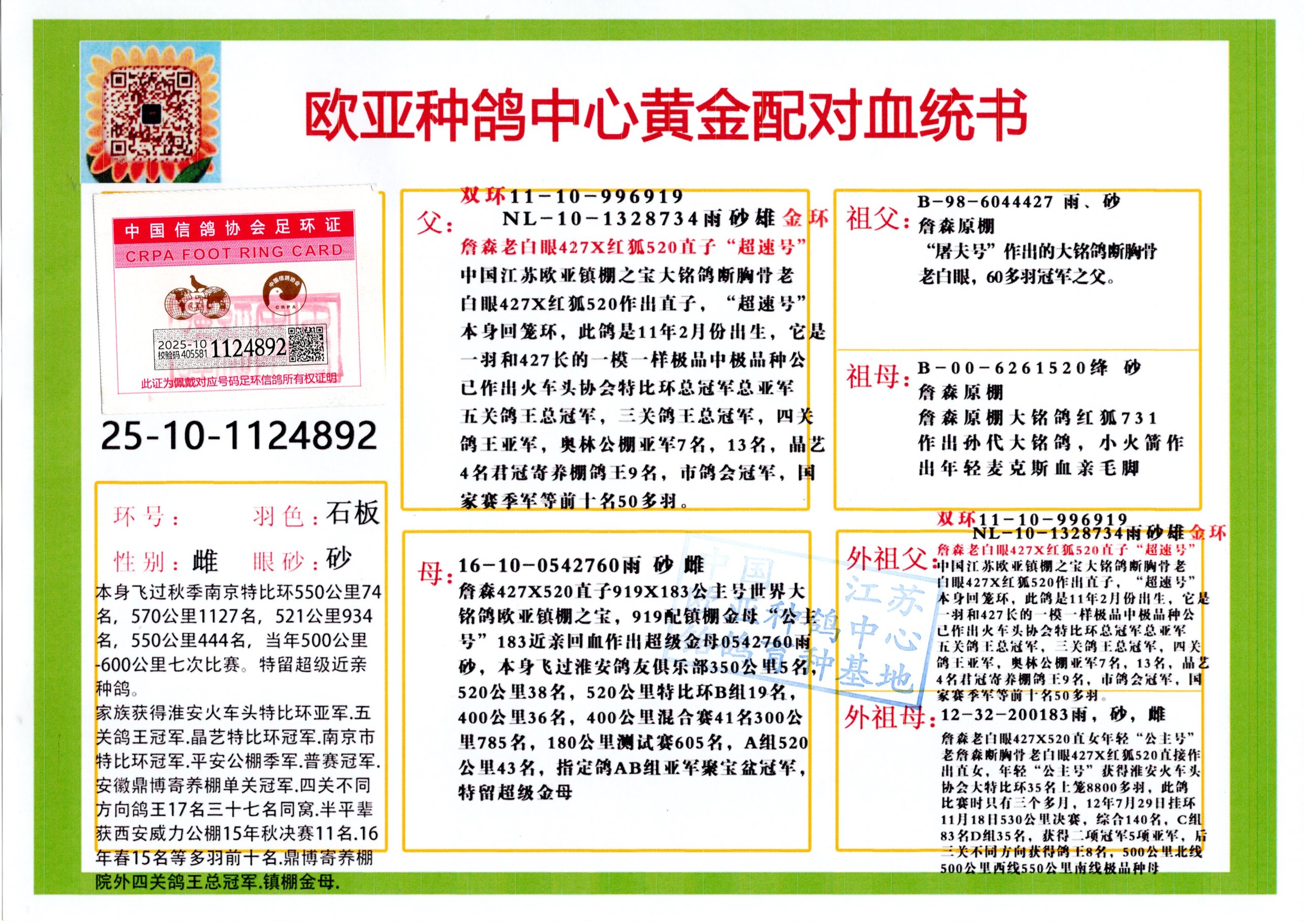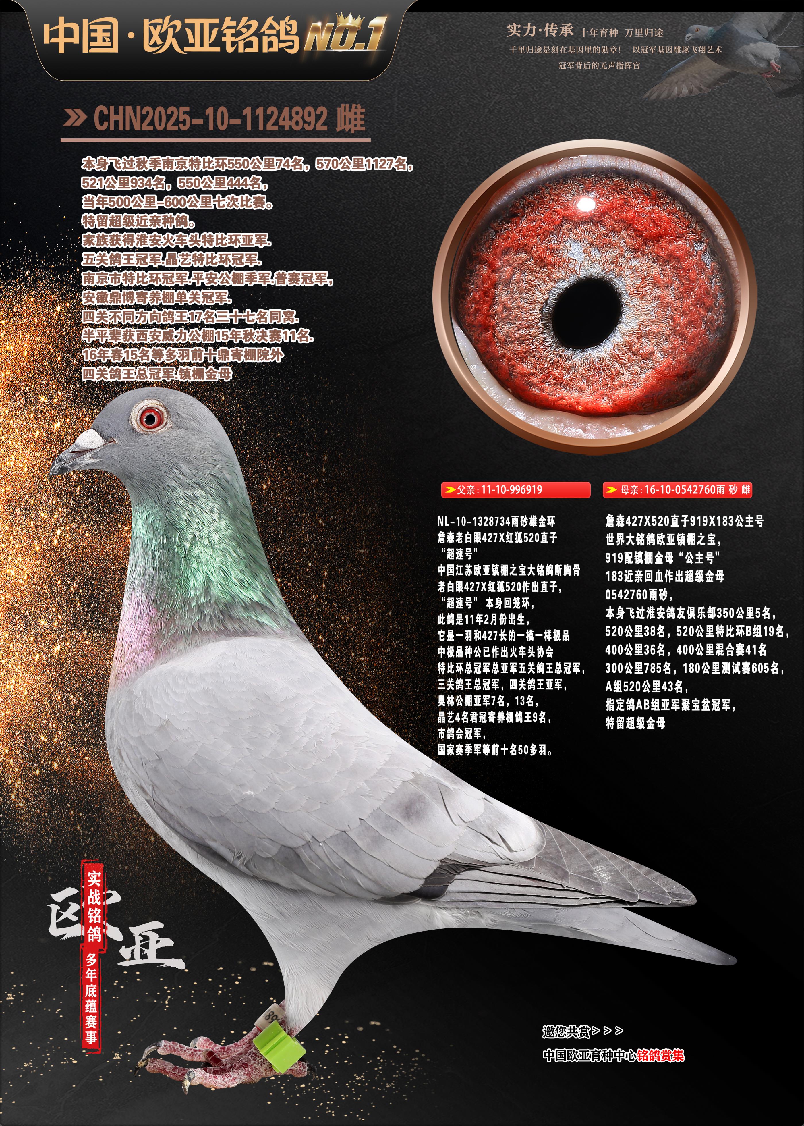 24年秋南京特比环欧亚荣获大团体冠军.小团体冠军551公里大特比13名.14名.16名.19名.20名.21名.24名.26名.27名.28名.42名.52名.54名.57名.65名.66名.68名.70名.71名.72名.74名.76名.80名.82名.83名.84名.85名.86名.90名.92名.110名.116名.121名.122名.128名.131名.158名.161名.164名.165名.166名.172名.174名.177名.182名.195名.196名.201名.205名.208名.210名.216名.253名.269名.275名.276名.294名.296名.299名,,24年秋云南天南铜都公棚决赛415名.天南铜都小棚决赛409名.云南玉活公棚决赛102名.490名.团体32名上笼二羽进二羽,天南铜都大棚506公里决赛445名。热烈祝贺河北省巨鹿县李兰生老师用欧亚泰山号血系连续十一年夺冠军,河北省国家赛冠军.全国季军等多次前十名高位,扬州王军王总用欧亚利奥24年春季获山东翔宇公棚决赛33名盖比53名。南京刘正龙刘总用欧亚盖比获得24年秋山东潍坊国际公棚决赛42名.精英赛30名.三关鸽王71名.决赛86名.加站赛16名.南京市特比环A组鸽王9名.B组鸽王5名.6名.C组鸽王5名.精英赛冠军4名.技能赛A组冠军4名.5名.秦淮区特比环荣获15名.46名.48名.87名。四川西昌徐亮徐总用欧亚利奥获得凉山州聚友决赛177名.第二关亚军双关鸽王19名.三关鸽王105名.云南豪庭公棚决赛603名。热烈祝贺24年四川重庆翔园鸽舍用欧亚泰山号荣获春季400公里冠军.秋季500公里冠军,河北王总用詹森X利奥获得千羽千翔公棚400公里冠军,广东蔡楷焕荣获24年秋爱好者 赛鸽俱乐部三关鸽王季军.一关420公里99名.二关450公里11名.三关520公里32名.单关季军.7名.12名,江西李卫兴荣获贵州红枫公棚8名.共翔俱乐部寄养棚四关综合鸽王30名.一关400公里78名.二关500公里55名.三关520公里37名.四关500公里57名.同父母获公棚18名.雷鸣获得武汉黄浦育翔中心冠军,四川陈文获得四川明鸿俱乐部300公里梦幻2名.3名.4名.9名.10名.13名.14名.15名.31名.34名.40名.41名.42名.43名.69名.71名.72名.73名.74名.94名.95名.97名.98名.99名.419公里决赛荣获总冠军7名.总共归巢9羽,四川徐亮获豪庭决赛603名,山西郑勇获得山西泰鑫公棚决赛255名詹森红狐,热烈祝贺马总获得开尔(飞跃队)决赛9名获奖金1310000万元.第一关52名,天津津福资赛180公里96名.获奖金429543万元,欧亚支持全国鸽友24年秋多人报喜 祝大家取得更好成绩,给欧亚报喜鸽友欧亚决定给每人赠送一羽超级种鸽。欧亚俱乐部特比环多关鸽王成绩:15年秋淮安特比环黑色星期一全会上笼9700多羽,当天无鸽归巢,第二天全会归巢357羽,本舍归巢158羽.前十名八羽.前一百名归巢57羽,16年春季获五关鸽王总冠军,总亚军四名.六名.七名.九名.十名.晶艺俱乐部520公里冠亚季军5名.6名.7名.9名.11名等,火车头冠军.季军6名.8名.9名.10名,16年秋晶艺俱乐部特比环520公里亚军.季军4名.6名.7名.9名,15年春南京白下特比环冠军.亚军.季军6名.7名.8名.9名.10名.指定鸽A B组获得冠军.亚军.季军4名.5名.,17年淮安特比环亚军.4名.5名.7名.8名.10名.六关鸽王总冠军.4名.6名.9名.10名,寄养棚宿迁刘总20羽特比环获冠军.季军.4名.7名.8名.9名等。18年荣获万羽特比环六关鸽王总冠军.总亚军.总季军.6名.8名.十名.单关四羽冠军.二羽亚军.四羽季军.前十名27羽。19年秋万羽特比环六关鸽王总亚军.总季军.5名.8名等,单关二羽冠军.三羽亚军.一羽季军前十名31羽。20年秋淮安市鸽会四关特比环大赛风雨无阻鸽王亚军.鸽王六名,金品俱乐部万羽特比环六关鸽王总冠军,总亚军.四名.五名.六名.七名.八名.十名.前二百名鸽王35羽,单关冠亚季军前十名四十多羽,火车头五关鸽王季军.六名.八名.前二百名鸽王十七羽。20年春荣获淮安五区一市四关鸽王总冠军.亚军.四名.八名.九名。21年秋荣获金品万羽特比环大赛六关鸽王总亚军.总季军.四名.七名.九名.十名.单关冠亚军季军前十名三十多羽。火车头协会鸽王六名.七名.十名.单关前十名十七羽。22年秋荣获鸽王总冠军.总亚军.5名.7名.8名.9名.11名.单关冠亚季军前十名三十多羽,第一关单关前二百名四十多羽,第二关前二百名三十多羽,第三关前二百名四十多羽,第四关前二百名四十多羽,第五关前一百名53羽。23年秋荣获鸽王季军.五名.八名.十名.13名.17名.20名.27名等多羽鸽王.单关前十名二十多羽。公棚.寄养棚部分成绩:16年秋宁夏黄河公棚总冠军电脑戈马力指定通炮冠军,17年送八羽参赛获得鸽王八名进奖四名,支持韩总荣获八名。支持鸽友荣获宁夏中卫公棚决赛总冠军.精英赛冠军,支持18年宁夏黄河公棚决赛冠军詹森X泰山。安徽鼎博寄养棚院内外四关鸽王总冠军.鸽王十七名.三十七名同窝,鸽王39名.42名.58名.67名。18年山东公棚预赛冠军.决赛65名.送八羽进奖五羽.指定获奔驰汽车一辆。支持鸽友获得云南蓝云公棚冠军.盖比X佛卡门。支持鸽友荣获云南银集公棚决赛冠军 詹森427X520血系 速度赛6700羽冠军。17年荣获金马俱乐部寄养棚四关鸽王总冠军.季军.六名.八名.第一关冠军.亚军.季军四名.七名.十一名.金牌教练奖。支持鸽友18年北京费翔公棚预赛九名电脑X桑杰士,支持鸽友荣获陕西威力公棚决赛11名.内蒙古临河寄养棚四关鸽王六名.詹森配泰山,支持河北王总用欧亚詹森427配胡本喜获20年秋开尔青年棚季军。云南东荣公棚16年预赛冠军.决赛77名.17年决赛12名.詹森红狐X泰山,17年平安公棚决赛4名 詹森427。欧亚获得21年金母寄养棚第一关四名.第二关5名.第三关5名.6名.7名.10名.三关鸽王总冠军,四关鸽王14名.十羽鸽王。支持河