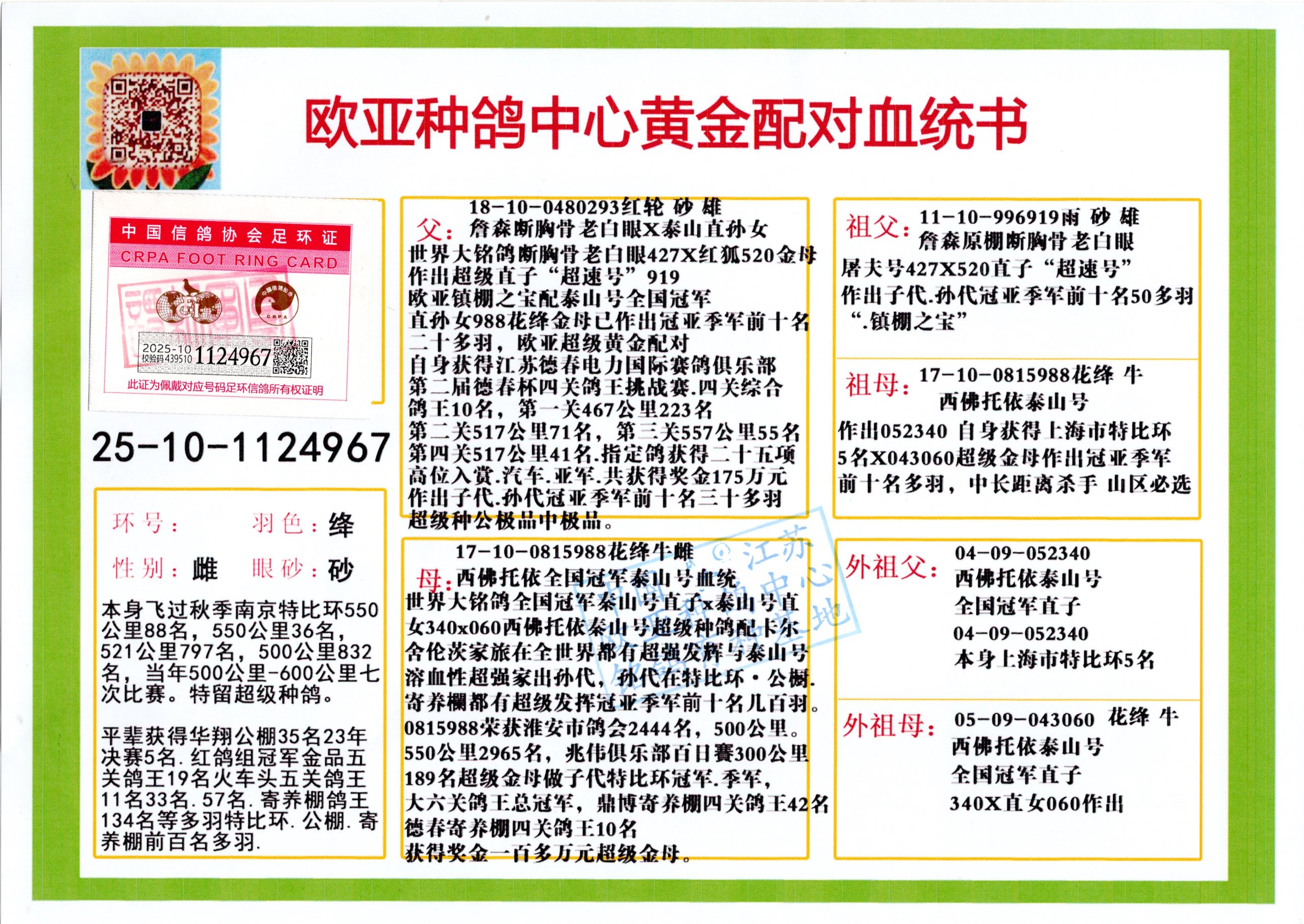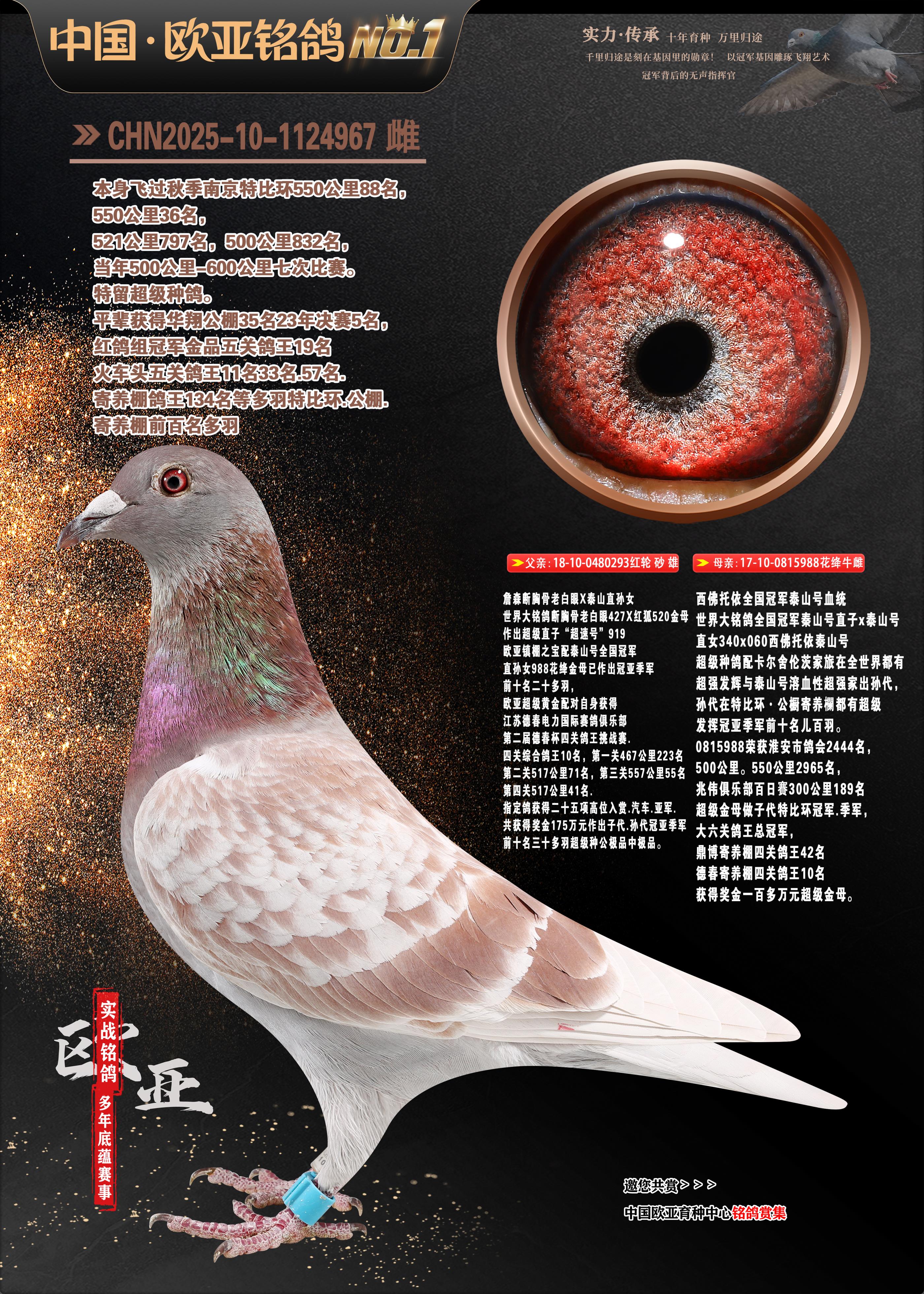 24年秋南京特比环欧亚荣获大团体冠军.小团体冠军551公里大特比13名.14名.16名.19名.20名.21名.24名.26名.27名.28名.42名.52名.54名.57名.65名.66名.68名.70名.71名.72名.74名.76名.80名.82名.83名.84名.85名.86名.90名.92名.110名.116名.121名.122名.128名.131名.158名.161名.164名.165名.166名.172名.174名.177名.182名.195名.196名.201名.205名.208名.210名.216名.253名.269名.275名.276名.294名.296名.299名,,24年秋云南天南铜都公棚决赛415名.天南铜都小棚决赛409名.云南玉活公棚决赛102名.490名.团体32名上笼二羽进二羽,天南铜都大棚506公里决赛445名。热烈祝贺河北省巨鹿县李兰生老师用欧亚泰山号血系连续十一年夺冠军,河北省国家赛冠军.全国季军等多次前十名高位,扬州王军王总用欧亚利奥24年春季获山东翔宇公棚决赛33名盖比53名。南京刘正龙刘总用欧亚盖比获得24年秋山东潍坊国际公棚决赛42名.精英赛30名.三关鸽王71名.决赛86名.加站赛16名.南京市特比环A组鸽王9名.B组鸽王5名.6名.C组鸽王5名.精英赛冠军4名.技能赛A组冠军4名.5名.秦淮区特比环荣获15名.46名.48名.87名。四川西昌徐亮徐总用欧亚利奥获得凉山州聚友决赛177名.第二关亚军双关鸽王19名.三关鸽王105名.云南豪庭公棚决赛603名。热烈祝贺24年四川重庆翔园鸽舍用欧亚泰山号荣获春季400公里冠军.秋季500公里冠军,河北王总用詹森X利奥获得千羽千翔公棚400公里冠军,广东蔡楷焕荣获24年秋爱好者 赛鸽俱乐部三关鸽王季军.一关420公里99名.二关450公里11名.三关520公里32名.单关季军.7名.12名,江西李卫兴荣获贵州红枫公棚8名.共翔俱乐部寄养棚四关综合鸽王30名.一关400公里78名.二关500公里55名.三关520公里37名.四关500公里57名.同父母获公棚18名.雷鸣获得武汉黄浦育翔中心冠军,四川陈文获得四川明鸿俱乐部300公里梦幻2名.3名.4名.9名.10名.13名.14名.15名.31名.34名.40名.41名.42名.43名.69名.71名.72名.73名.74名.94名.95名.97名.98名.99名.419公里决赛荣获总冠军7名.总共归巢9羽,四川徐亮获豪庭决赛603名,山西郑勇获得山西泰鑫公棚决赛255名詹森红狐,热烈祝贺马总获得开尔(飞跃队)决赛9名获奖金1310000万元.第一关52名,天津津福资赛180公里96名.获奖金429543万元,欧亚支持全国鸽友24年秋多人报喜 祝大家取得更好成绩,给欧亚报喜鸽友欧亚决定给每人赠送一羽超级种鸽。欧亚俱乐部特比环多关鸽王成绩:15年秋淮安特比环黑色星期一全会上笼9700多羽,当天无鸽归巢,第二天全会归巢357羽,本舍归巢158羽.前十名八羽.前一百名归巢57羽,16年春季获五关鸽王总冠军,总亚军四名.六名.七名.九名.十名.晶艺俱乐部520公里冠亚季军5名.6名.7名.9名.11名等,火车头冠军.季军6名.8名.9名.10名,16年秋晶艺俱乐部特比环520公里亚军.季军4名.6名.7名.9名,15年春南京白下特比环冠军.亚军.季军6名.7名.8名.9名.10名.指定鸽A B组获得冠军.亚军.季军4名.5名.,17年淮安特比环亚军.4名.5名.7名.8名.10名.六关鸽王总冠军.4名.6名.9名.10名,寄养棚宿迁刘总20羽特比环获冠军.季军.4名.7名.8名.9名等。18年荣获万羽特比环六关鸽王总冠军.总亚军.总季军.6名.8名.十名.单关四羽冠军.二羽亚军.四羽季军.前十名27羽。19年秋万羽特比环六关鸽王总亚军.总季军.5名.8名等,单关二羽冠军.三羽亚军.一羽季军前十名31羽。20年秋淮安市鸽会四关特比环大赛风雨无阻鸽王亚军.鸽王六名,金品俱乐部万羽特比环六关鸽王总冠军,总亚军.四名.五名.六名.七名.八名.十名.前二百名鸽王35羽,单关冠亚季军前十名四十多羽,火车头五关鸽王季军.六名.八名.前二百名鸽王十七羽。20年春荣获淮安五区一市四关鸽王总冠军.亚军.四名.八名.九名。21年秋荣获金品万羽特比环大赛六关鸽王总亚军.总季军.四名.七名.九名.十名.单关冠亚军季军前十名三十多羽。火车头协会鸽王六名.七名.十名.单关前十名十七羽。22年秋荣获鸽王总冠军.总亚军.5名.7名.8名.9名.11名.单关冠亚季军前十名三十多羽,第一关单关前二百名四十多羽,第二关前二百名三十多羽,第三关前二百名四十多羽,第四关前二百名四十多羽,第五关前一百名53羽。23年秋荣获鸽王季军.五名.八名.十名.13名.17名.20名.27名等多羽鸽王.单关前十名二十多羽。公棚.寄养棚部分成绩:16年秋宁夏黄河公棚总冠军电脑戈马力指定通炮冠军,17年送八羽参赛获得鸽王八名进奖四名,支持韩总荣获八名。支持鸽友荣获宁夏中卫公棚决赛总冠军.精英赛冠军,支持18年宁夏黄河公棚决赛冠军詹森X泰山。安徽鼎博寄养棚院内外四关鸽王总冠军.鸽王十七名.三十七名同窝,鸽王39名.42名.58名.67名。18年山东公棚预赛冠军.决赛65名.送八羽进奖五羽.指定获奔驰汽车一辆。支持鸽友获得云南蓝云公棚冠军.盖比X佛卡门。支持鸽友荣获云南银集公棚决赛冠军 詹森427X520血系 速度赛6700羽冠军。17年荣获金马俱乐部寄养棚四关鸽王总冠军.季军.六名.八名.第一关冠军.亚军.季军四名.七名.十一名.金牌教练奖。支持鸽友18年北京费翔公棚预赛九名电脑X桑杰士,支持鸽友荣获陕西威力公棚决赛11名.内蒙古临河寄养棚四关鸽王六名.詹森配泰山,支持河北王总用欧亚詹森427配胡本喜获20年秋开尔青年棚季军。云南东荣公棚16年预赛冠军.决赛77名.17年决赛12名.詹森红狐X泰山,17年平安公棚决赛4名 詹森427。欧亚获得21年金母寄养棚第一关四名.第二关5名.第三关5名.6名.7名.10名.三关鸽王总冠军,四关鸽王14名.十羽鸽王。支持河