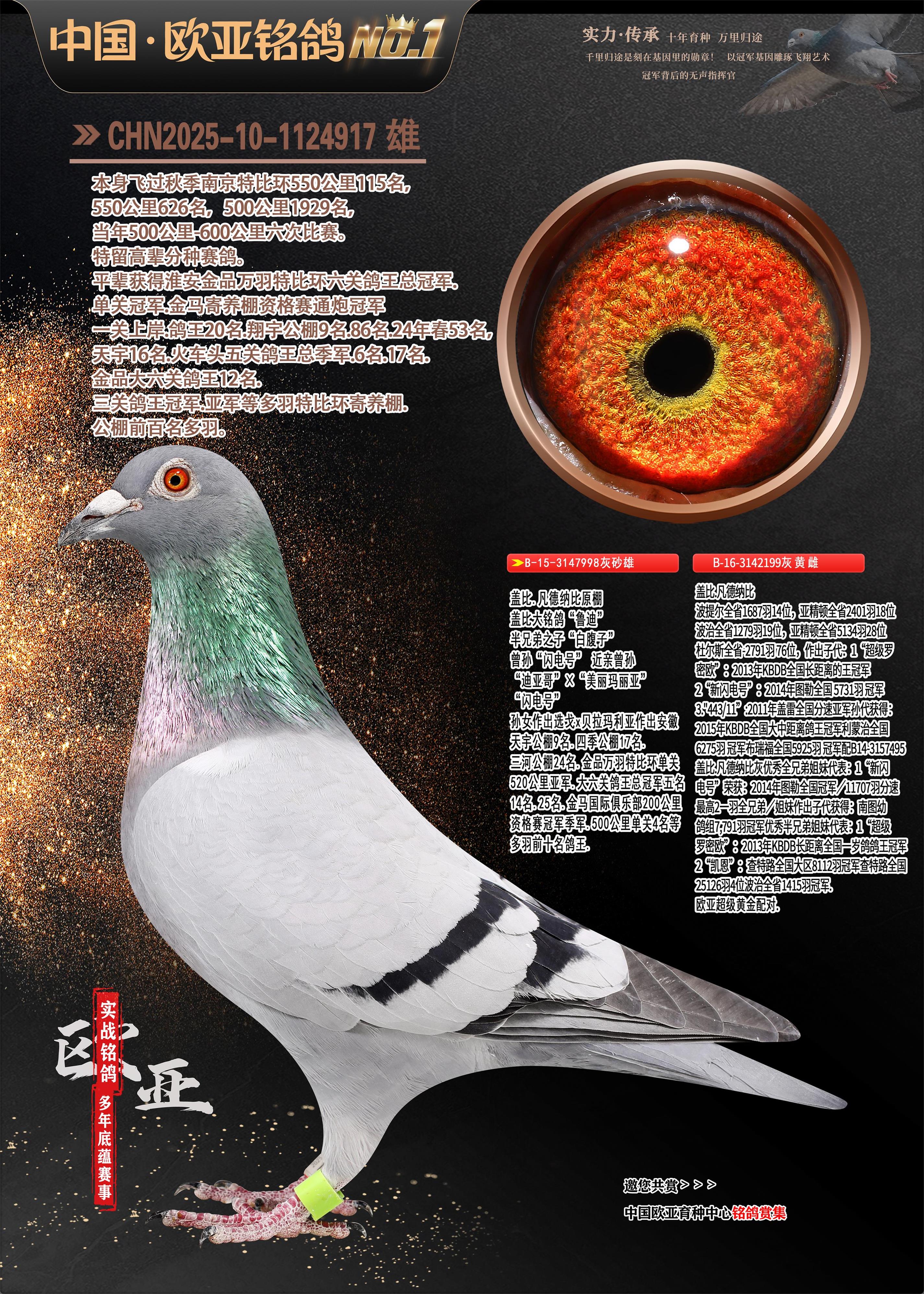 24年秋南京特比环欧亚荣获大团体冠军.小团体冠军551公里大特比13名.14名.16名.19名.20名.21名.24名.26名.27名.28名.42名.52名.54名.57名.65名.66名.68名.70名.71名.72名.74名.76名.80名.82名.83名.84名.85名.86名.90名.92名.110名.116名.121名.122名.128名.131名.158名.161名.164名.165名.166名.172名.174名.177名.182名.195名.196名.201名.205名.208名.210名.216名.253名.269名.275名.276名.294名.296名.299名,,24年秋云南天南铜都公棚决赛415名.天南铜都小棚决赛409名.云南玉活公棚决赛102名.490名.团体32名上笼二羽进二羽,天南铜都大棚506公里决赛445名。热烈祝贺河北省巨鹿县李兰生老师用欧亚泰山号血系连续十一年夺冠军,河北省国家赛冠军.全国季军等多次前十名高位,扬州王军王总用欧亚利奥24年春季获山东翔宇公棚决赛33名盖比53名。南京刘正龙刘总用欧亚盖比获得24年秋山东潍坊国际公棚决赛42名.精英赛30名.三关鸽王71名.决赛86名.加站赛16名.南京市特比环A组鸽王9名.B组鸽王5名.6名.C组鸽王5名.精英赛冠军4名.技能赛A组冠军4名.5名.秦淮区特比环荣获15名.46名.48名.87名。四川西昌徐亮徐总用欧亚利奥获得凉山州聚友决赛177名.第二关亚军双关鸽王19名.三关鸽王105名.云南豪庭公棚决赛603名。热烈祝贺24年四川重庆翔园鸽舍用欧亚泰山号荣获春季400公里冠军.秋季500公里冠军,河北王总用詹森X利奥获得千羽千翔公棚400公里冠军,广东蔡楷焕荣获24年秋爱好者 赛鸽俱乐部三关鸽王季军.一关420公里99名.二关450公里11名.三关520公里32名.单关季军.7名.12名,江西李卫兴荣获贵州红枫公棚8名.共翔俱乐部寄养棚四关综合鸽王30名.一关400公里78名.二关500公里55名.三关520公里37名.四关500公里57名.同父母获公棚18名.雷鸣获得武汉黄浦育翔中心冠军,四川陈文获得四川明鸿俱乐部300公里梦幻2名.3名.4名.9名.10名.13名.14名.15名.31名.34名.40名.41名.42名.43名.69名.71名.72名.73名.74名.94名.95名.97名.98名.99名.419公里决赛荣获总冠军7名.总共归巢9羽,四川徐亮获豪庭决赛603名,山西郑勇获得山西泰鑫公棚决赛255名詹森红狐,热烈祝贺马总获得开尔(飞跃队)决赛9名获奖金1310000万元.第一关52名,天津津福资赛180公里96名.获奖金429543万元,欧亚支持全国鸽友24年秋多人报喜 祝大家取得更好成绩,给欧亚报喜鸽友欧亚决定给每人赠送一羽超级种鸽。欧亚俱乐部特比环多关鸽王成绩:15年秋淮安特比环黑色星期一全会上笼9700多羽,当天无鸽归巢,第二天全会归巢357羽,本舍归巢158羽.前十名八羽.前一百名归巢57羽,16年春季获五关鸽王总冠军,总亚军四名.六名.七名.九名.十名.晶艺俱乐部520公里冠亚季军5名.6名.7名.9名.11名等,火车头冠军.季军6名.8名.9名.10名,16年秋晶艺俱乐部特比环520公里亚军.季军4名.6名.7名.9名,15年春南京白下特比环冠军.亚军.季军6名.7名.8名.9名.10名.指定鸽A B组获得冠军.亚军.季军4名.5名.,17年淮安特比环亚军.4名.5名.7名.8名.10名.六关鸽王总冠军.4名.6名.9名.10名,寄养棚宿迁刘总20羽特比环获冠军.季军.4名.7名.8名.9名等。18年荣获万羽特比环六关鸽王总冠军.总亚军.总季军.6名.8名.十名.单关四羽冠军.二羽亚军.四羽季军.前十名27羽。19年秋万羽特比环六关鸽王总亚军.总季军.5名.8名等,单关二羽冠军.三羽亚军.一羽季军前十名31羽。20年秋淮安市鸽会四关特比环大赛风雨无阻鸽王亚军.鸽王六名,金品俱乐部万羽特比环六关鸽王总冠军,总亚军.四名.五名.六名.七名.八名.十名.前二百名鸽王35羽,单关冠亚季军前十名四十多羽,火车头五关鸽王季军.六名.八名.前二百名鸽王十七羽。20年春荣获淮安五区一市四关鸽王总冠军.亚军.四名.八名.九名。21年秋荣获金品万羽特比环大赛六关鸽王总亚军.总季军.四名.七名.九名.十名.单关冠亚军季军前十名三十多羽。火车头协会鸽王六名.七名.十名.单关前十名十七羽。22年秋荣获鸽王总冠军.总亚军.5名.7名.8名.9名.11名.单关冠亚季军前十名三十多羽,第一关单关前二百名四十多羽,第二关前二百名三十多羽,第三关前二百名四十多羽,第四关前二百名四十多羽,第五关前一百名53羽。23年秋荣获鸽王季军.五名.八名.十名.13名.17名.20名.27名等多羽鸽王.单关前十名二十多羽。公棚.寄养棚部分成绩:16年秋宁夏黄河公棚总冠军电脑戈马力指定通炮冠军,17年送八羽参赛获得鸽王八名进奖四名,支持韩总荣获八名。支持鸽友荣获宁夏中卫公棚决赛总冠军.精英赛冠军,支持18年宁夏黄河公棚决赛冠军詹森X泰山。安徽鼎博寄养棚院内外四关鸽王总冠军.鸽王十七名.三十七名同窝,鸽王39名.42名.58名.67名。18年山东公棚预赛冠军.决赛65名.送八羽进奖五羽.指定获奔驰汽车一辆。支持鸽友获得云南蓝云公棚冠军.盖比X佛卡门。支持鸽友荣获云南银集公棚决赛冠军 詹森427X520血系 速度赛6700羽冠军。17年荣获金马俱乐部寄养棚四关鸽王总冠军.季军.六名.八名.第一关冠军.亚军.季军四名.七名.十一名.金牌教练奖。支持鸽友18年北京费翔公棚预赛九名电脑X桑杰士,支持鸽友荣获陕西威力公棚决赛11名.内蒙古临河寄养棚四关鸽王六名.詹森配泰山,支持河北王总用欧亚詹森427配胡本喜获20年秋开尔青年棚季军。云南东荣公棚16年预赛冠军.决赛77名.17年决赛12名.詹森红狐X泰山,17年平安公棚决赛4名 詹森427。欧亚获得21年金母寄养棚第一关四名.第二关5名.第三关5名.6名.7名.10名.三关鸽王总冠军,四关鸽王14名.十羽鸽王。支持河