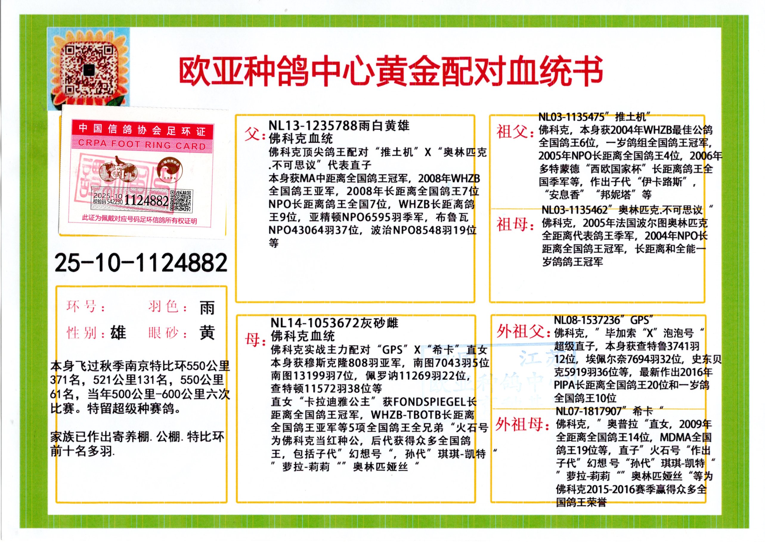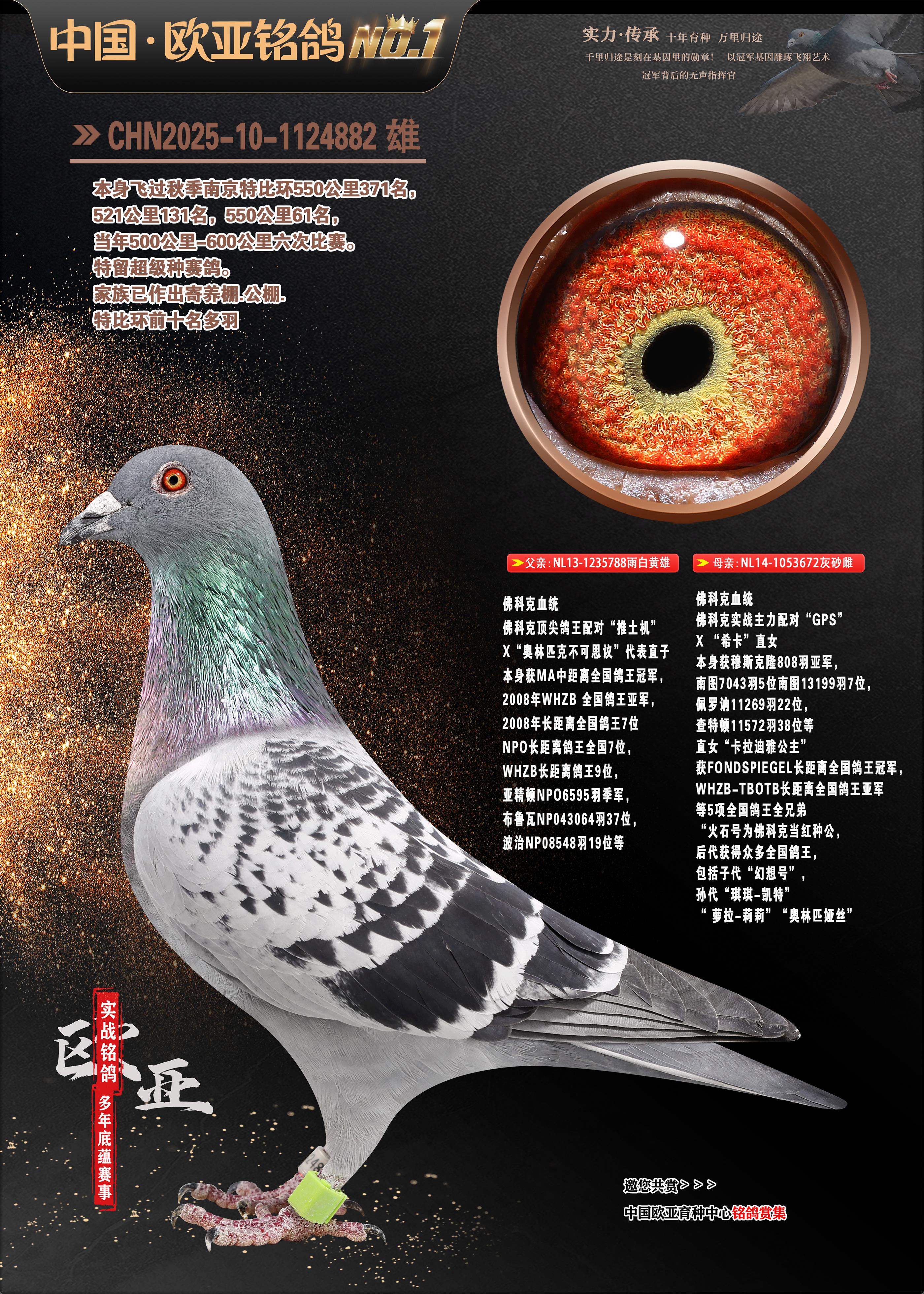 24年秋南京特比环欧亚荣获大团体冠军.小团体冠军551公里大特比13名.14名.16名.19名.20名.21名.24名.26名.27名.28名.42名.52名.54名.57名.65名.66名.68名.70名.71名.72名.74名.76名.80名.82名.83名.84名.85名.86名.90名.92名.110名.116名.121名.122名.128名.131名.158名.161名.164名.165名.166名.172名.174名.177名.182名.195名.196名.201名.205名.208名.210名.216名.253名.269名.275名.276名.294名.296名.299名,,24年秋云南天南铜都公棚决赛415名.天南铜都小棚决赛409名.云南玉活公棚决赛102名.490名.团体32名上笼二羽进二羽,天南铜都大棚506公里决赛445名。热烈祝贺河北省巨鹿县李兰生老师用欧亚泰山号血系连续十一年夺冠军,河北省国家赛冠军.全国季军等多次前十名高位,扬州王军王总用欧亚利奥24年春季获山东翔宇公棚决赛33名盖比53名。南京刘正龙刘总用欧亚盖比获得24年秋山东潍坊国际公棚决赛42名.精英赛30名.三关鸽王71名.决赛86名.加站赛16名.南京市特比环A组鸽王9名.B组鸽王5名.6名.C组鸽王5名.精英赛冠军4名.技能赛A组冠军4名.5名.秦淮区特比环荣获15名.46名.48名.87名。四川西昌徐亮徐总用欧亚利奥获得凉山州聚友决赛177名.第二关亚军双关鸽王19名.三关鸽王105名.云南豪庭公棚决赛603名。热烈祝贺24年四川重庆翔园鸽舍用欧亚泰山号荣获春季400公里冠军.秋季500公里冠军,河北王总用詹森X利奥获得千羽千翔公棚400公里冠军,广东蔡楷焕荣获24年秋爱好者 赛鸽俱乐部三关鸽王季军.一关420公里99名.二关450公里11名.三关520公里32名.单关季军.7名.12名,江西李卫兴荣获贵州红枫公棚8名.共翔俱乐部寄养棚四关综合鸽王30名.一关400公里78名.二关500公里55名.三关520公里37名.四关500公里57名.同父母获公棚18名.雷鸣获得武汉黄浦育翔中心冠军,四川陈文获得四川明鸿俱乐部300公里梦幻2名.3名.4名.9名.10名.13名.14名.15名.31名.34名.40名.41名.42名.43名.69名.71名.72名.73名.74名.94名.95名.97名.98名.99名.419公里决赛荣获总冠军7名.总共归巢9羽,四川徐亮获豪庭决赛603名,山西郑勇获得山西泰鑫公棚决赛255名詹森红狐,热烈祝贺马总获得开尔(飞跃队)决赛9名获奖金1310000万元.第一关52名,天津津福资赛180公里96名.获奖金429543万元,欧亚支持全国鸽友24年秋多人报喜 祝大家取得更好成绩,给欧亚报喜鸽友欧亚决定给每人赠送一羽超级种鸽。欧亚俱乐部特比环多关鸽王成绩:15年秋淮安特比环黑色星期一全会上笼9700多羽,当天无鸽归巢,第二天全会归巢357羽,本舍归巢158羽.前十名八羽.前一百名归巢57羽,16年春季获五关鸽王总冠军,总亚军四名.六名.七名.九名.十名.晶艺俱乐部520公里冠亚季军5名.6名.7名.9名.11名等,火车头冠军.季军6名.8名.9名.10名,16年秋晶艺俱乐部特比环520公里亚军.季军4名.6名.7名.9名,15年春南京白下特比环冠军.亚军.季军6名.7名.8名.9名.10名.指定鸽A B组获得冠军.亚军.季军4名.5名.,17年淮安特比环亚军.4名.5名.7名.8名.10名.六关鸽王总冠军.4名.6名.9名.10名,寄养棚宿迁刘总20羽特比环获冠军.季军.4名.7名.8名.9名等。18年荣获万羽特比环六关鸽王总冠军.总亚军.总季军.6名.8名.十名.单关四羽冠军.二羽亚军.四羽季军.前十名27羽。19年秋万羽特比环六关鸽王总亚军.总季军.5名.8名等,单关二羽冠军.三羽亚军.一羽季军前十名31羽。20年秋淮安市鸽会四关特比环大赛风雨无阻鸽王亚军.鸽王六名,金品俱乐部万羽特比环六关鸽王总冠军,总亚军.四名.五名.六名.七名.八名.十名.前二百名鸽王35羽,单关冠亚季军前十名四十多羽,火车头五关鸽王季军.六名.八名.前二百名鸽王十七羽。20年春荣获淮安五区一市四关鸽王总冠军.亚军.四名.八名.九名。21年秋荣获金品万羽特比环大赛六关鸽王总亚军.总季军.四名.七名.九名.十名.单关冠亚军季军前十名三十多羽。火车头协会鸽王六名.七名.十名.单关前十名十七羽。22年秋荣获鸽王总冠军.总亚军.5名.7名.8名.9名.11名.单关冠亚季军前十名三十多羽,第一关单关前二百名四十多羽,第二关前二百名三十多羽,第三关前二百名四十多羽,第四关前二百名四十多羽,第五关前一百名53羽。23年秋荣获鸽王季军.五名.八名.十名.13名.17名.20名.27名等多羽鸽王.单关前十名二十多羽。公棚.寄养棚部分成绩:16年秋宁夏黄河公棚总冠军电脑戈马力指定通炮冠军,17年送八羽参赛获得鸽王八名进奖四名,支持韩总荣获八名。支持鸽友荣获宁夏中卫公棚决赛总冠军.精英赛冠军,支持18年宁夏黄河公棚决赛冠军詹森X泰山。安徽鼎博寄养棚院内外四关鸽王总冠军.鸽王十七名.三十七名同窝,鸽王39名.42名.58名.67名。18年山东公棚预赛冠军.决赛65名.送八羽进奖五羽.指定获奔驰汽车一辆。支持鸽友获得云南蓝云公棚冠军.盖比X佛卡门。支持鸽友荣获云南银集公棚决赛冠军 詹森427X520血系 速度赛6700羽冠军。17年荣获金马俱乐部寄养棚四关鸽王总冠军.季军.六名.八名.第一关冠军.亚军.季军四名.七名.十一名.金牌教练奖。支持鸽友18年北京费翔公棚预赛九名电脑X桑杰士,支持鸽友荣获陕西威力公棚决赛11名.内蒙古临河寄养棚四关鸽王六名.詹森配泰山,支持河北王总用欧亚詹森427配胡本喜获20年秋开尔青年棚季军。云南东荣公棚16年预赛冠军.决赛77名.17年决赛12名.詹森红狐X泰山,17年平安公棚决赛4名 詹森427。欧亚获得21年金母寄养棚第一关四名.第二关5名.第三关5名.6名.7名.10名.三关鸽王总冠军,四关鸽王14名.十羽鸽王。支持河