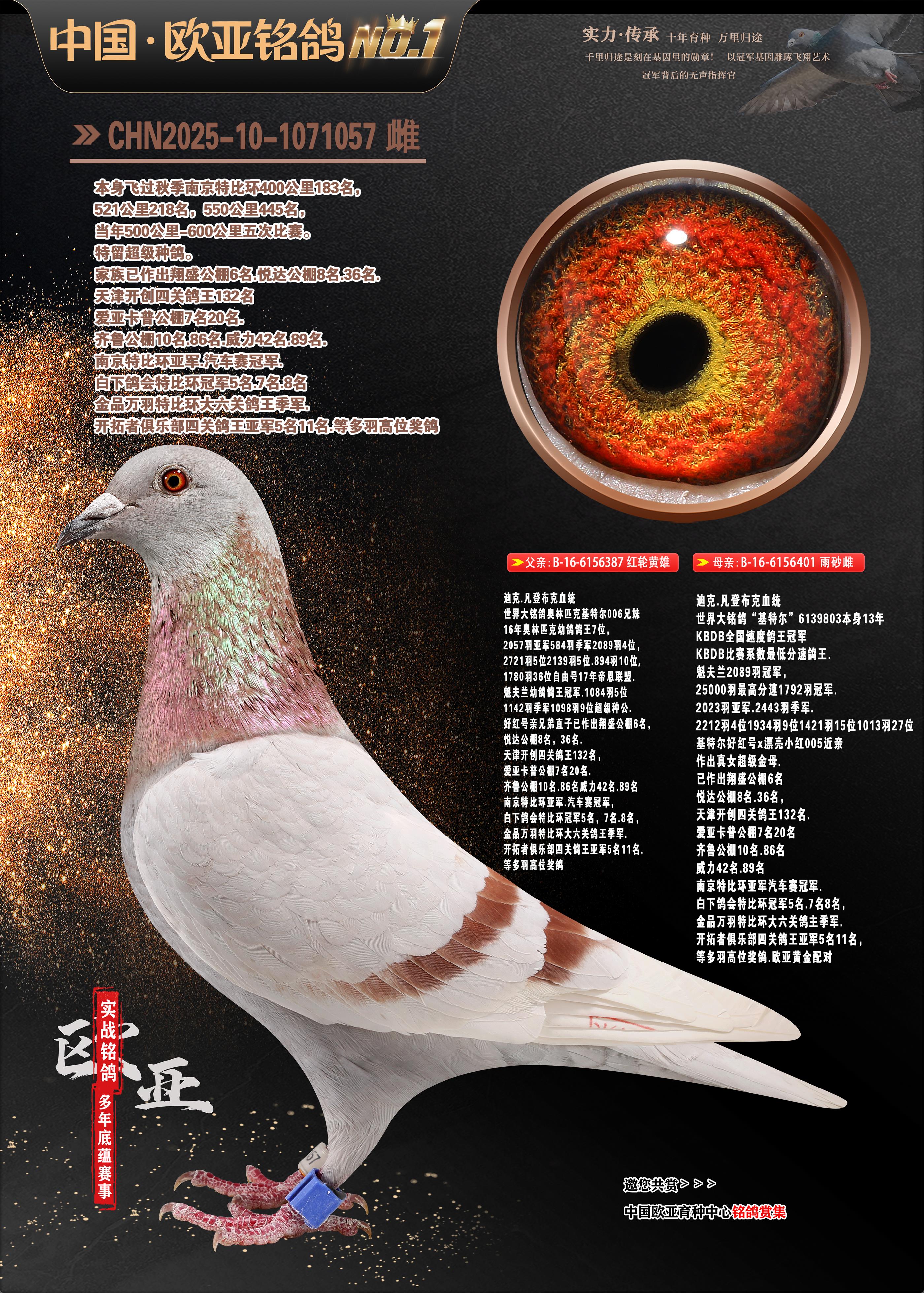 24年秋南京特比环欧亚荣获大团体冠军.小团体冠军551公里大特比13名.14名.16名.19名.20名.21名.24名.26名.27名.28名.42名.52名.54名.57名.65名.66名.68名.70名.71名.72名.74名.76名.80名.82名.83名.84名.85名.86名.90名.92名.110名.116名.121名.122名.128名.131名.158名.161名.164名.165名.166名.172名.174名.177名.182名.195名.196名.201名.205名.208名.210名.216名.253名.269名.275名.276名.294名.296名.299名,,24年秋云南天南铜都公棚决赛415名.天南铜都小棚决赛409名.云南玉活公棚决赛102名.490名.团体32名上笼二羽进二羽,天南铜都大棚506公里决赛445名。热烈祝贺河北省巨鹿县李兰生老师用欧亚泰山号血系连续十一年夺冠军,河北省国家赛冠军.全国季军等多次前十名高位,扬州王军王总用欧亚利奥24年春季获山东翔宇公棚决赛33名盖比53名。南京刘正龙刘总用欧亚盖比获得24年秋山东潍坊国际公棚决赛42名.精英赛30名.三关鸽王71名.决赛86名.加站赛16名.南京市特比环A组鸽王9名.B组鸽王5名.6名.C组鸽王5名.精英赛冠军4名.技能赛A组冠军4名.5名.秦淮区特比环荣获15名.46名.48名.87名。四川西昌徐亮徐总用欧亚利奥获得凉山州聚友决赛177名.第二关亚军双关鸽王19名.三关鸽王105名.云南豪庭公棚决赛603名。热烈祝贺24年四川重庆翔园鸽舍用欧亚泰山号荣获春季400公里冠军.秋季500公里冠军,河北王总用詹森X利奥获得千羽千翔公棚400公里冠军,广东蔡楷焕荣获24年秋爱好者 赛鸽俱乐部三关鸽王季军.一关420公里99名.二关450公里11名.三关520公里32名.单关季军.7名.12名,江西李卫兴荣获贵州红枫公棚8名.共翔俱乐部寄养棚四关综合鸽王30名.一关400公里78名.二关500公里55名.三关520公里37名.四关500公里57名.同父母获公棚18名.雷鸣获得武汉黄浦育翔中心冠军,四川陈文获得四川明鸿俱乐部300公里梦幻2名.3名.4名.9名.10名.13名.14名.15名.31名.34名.40名.41名.42名.43名.69名.71名.72名.73名.74名.94名.95名.97名.98名.99名.419公里决赛荣获总冠军7名.总共归巢9羽,四川徐亮获豪庭决赛603名,山西郑勇获得山西泰鑫公棚决赛255名詹森红狐,热烈祝贺马总获得开尔(飞跃队)决赛9名获奖金1310000万元.第一关52名,天津津福资赛180公里96名.获奖金429543万元,欧亚支持全国鸽友24年秋多人报喜 祝大家取得更好成绩,给欧亚报喜鸽友欧亚决定给每人赠送一羽超级种鸽。欧亚俱乐部特比环多关鸽王成绩:15年秋淮安特比环黑色星期一全会上笼9700多羽,当天无鸽归巢,第二天全会归巢357羽,本舍归巢158羽.前十名八羽.前一百名归巢57羽,16年春季获五关鸽王总冠军,总亚军四名.六名.七名.九名.十名.晶艺俱乐部520公里冠亚季军5名.6名.7名.9名.11名等,火车头冠军.季军6名.8名.9名.10名,16年秋晶艺俱乐部特比环520公里亚军.季军4名.6名.7名.9名,15年春南京白下特比环冠军.亚军.季军6名.7名.8名.9名.10名.指定鸽A B组获得冠军.亚军.季军4名.5名.,17年淮安特比环亚军.4名.5名.7名.8名.10名.六关鸽王总冠军.4名.6名.9名.10名,寄养棚宿迁刘总20羽特比环获冠军.季军.4名.7名.8名.9名等。18年荣获万羽特比环六关鸽王总冠军.总亚军.总季军.6名.8名.十名.单关四羽冠军.二羽亚军.四羽季军.前十名27羽。19年秋万羽特比环六关鸽王总亚军.总季军.5名.8名等,单关二羽冠军.三羽亚军.一羽季军前十名31羽。20年秋淮安市鸽会四关特比环大赛风雨无阻鸽王亚军.鸽王六名,金品俱乐部万羽特比环六关鸽王总冠军,总亚军.四名.五名.六名.七名.八名.十名.前二百名鸽王35羽,单关冠亚季军前十名四十多羽,火车头五关鸽王季军.六名.八名.前二百名鸽王十七羽。20年春荣获淮安五区一市四关鸽王总冠军.亚军.四名.八名.九名。21年秋荣获金品万羽特比环大赛六关鸽王总亚军.总季军.四名.七名.九名.十名.单关冠亚军季军前十名三十多羽。火车头协会鸽王六名.七名.十名.单关前十名十七羽。22年秋荣获鸽王总冠军.总亚军.5名.7名.8名.9名.11名.单关冠亚季军前十名三十多羽,第一关单关前二百名四十多羽,第二关前二百名三十多羽,第三关前二百名四十多羽,第四关前二百名四十多羽,第五关前一百名53羽。23年秋荣获鸽王季军.五名.八名.十名.13名.17名.20名.27名等多羽鸽王.单关前十名二十多羽。公棚.寄养棚部分成绩:16年秋宁夏黄河公棚总冠军电脑戈马力指定通炮冠军,17年送八羽参赛获得鸽王八名进奖四名,支持韩总荣获八名。支持鸽友荣获宁夏中卫公棚决赛总冠军.精英赛冠军,支持18年宁夏黄河公棚决赛冠军詹森X泰山。安徽鼎博寄养棚院内外四关鸽王总冠军.鸽王十七名.三十七名同窝,鸽王39名.42名.58名.67名。18年山东公棚预赛冠军.决赛65名.送八羽进奖五羽.指定获奔驰汽车一辆。支持鸽友获得云南蓝云公棚冠军.盖比X佛卡门。支持鸽友荣获云南银集公棚决赛冠军 詹森427X520血系 速度赛6700羽冠军。17年荣获金马俱乐部寄养棚四关鸽王总冠军.季军.六名.八名.第一关冠军.亚军.季军四名.七名.十一名.金牌教练奖。支持鸽友18年北京费翔公棚预赛九名电脑X桑杰士,支持鸽友荣获陕西威力公棚决赛11名.内蒙古临河寄养棚四关鸽王六名.詹森配泰山,支持河北王总用欧亚詹森427配胡本喜获20年秋开尔青年棚季军。云南东荣公棚16年预赛冠军.决赛77名.17年决赛12名.詹森红狐X泰山,17年平安公棚决赛4名 詹森427。欧亚获得21年金母寄养棚第一关四名.第二关5名.第三关5名.6名.7名.10名.三关鸽王总冠军,四关鸽王14名.十羽鸽王。支持河